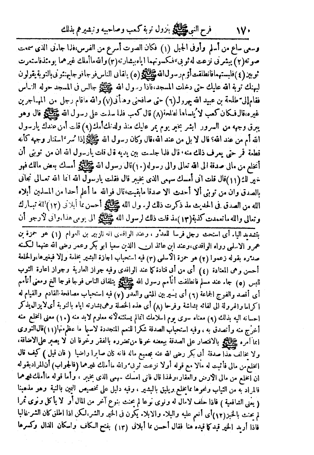 بتشديد الياء أي استحث رجل فرسا للعدو، وعند الواقدي أنه للزبير بن العوام (1) هو حمزة بن عمرو الأسلمي رواه الواقدي، وعند ابن عائدذ أن الذين سعيا أبو بكر وعمر رضي الله عنهما لكنه صدره بقوله زعموا (1) هو حمزة الأسلمي (3) فيه استحباب إجازة البشير بخلعة وإلا فبغيرها، والخلعة أحسن وهي المعتادة (4) أي من أبي قتادة كما عند الواقدي وفيه جواز العارية وجواز إعارة الثوب للبس (5) جاء عند مسلم فانطلقت أتأمم رسول الله صلى الله عليه وسلم يتلقاني الناس فوجا فوجا الخ ومعنى أتأمم أي أقصد والفوج الجماعة (6) أي يسير بين المشي والعدو (7) فيه استحباب مصافحة القادم والقيام له إكراما والهرولة إلى لقائه بشاشة وفرحا (8) أي هذه الخصلة وهي بشارته إياه بالتوبة أي لا يزال يذكر إحسانه إليه بذلك (9) معناه سوى يوم إسلامك إنما لم يستثنه لأنه معلوم لابد منه (10) معنى انخلع منه أخرج منه وأتصدق به، وفيه استحباب الصدقة شكرا للنعم المتجددة لاسيما ما عظم منها (11) قال النووي إنما أمره صلى الله عليه وسلم بالاقتصار على الصدقة ببعضه خوفا من تضرره بالفقر وخوفا أن لا يصبر على الإضافة، ولا يخالف هذا صدقة أبي بكر رضي الله عنه بجميع ماله فإنه كان صابرا راضيا (فإن قيل) كيف قال انخلع من مالي فأثبت له مالا مع قوله أولا نزعت ثوبي والله ما أملك غيرهما (فالجواب) أن المراد بقوله أن انخلع من مالي الأرض والعقار، ولهذا قال فإني أمسك سهمي الذي بخيبر، وأما قوله ما أملك غيرهما فالمراد به من الثياب ونحوها مما يخلع ويليق بالبشير، وفيه دليل على تخصيص اليمين بالنية وهو مذهبنا (يعني الشافعية) فإذا حلف لا مال له ونوى نوعا لم يحنث بنوع آخر من المال أو لا يأكل ونوى ثمرا لم يحنث بالخبز (12) أي أنعم عليه والبلاء والإبلاء يكون في الخير والشر، لكن إذا أطلق كان الشر غالبا فإذا أريد الخير قيد كما قيده هنا فقال أحسن مما أبلاني (13) بفتح الكاف وإسكان الذال وكسرها