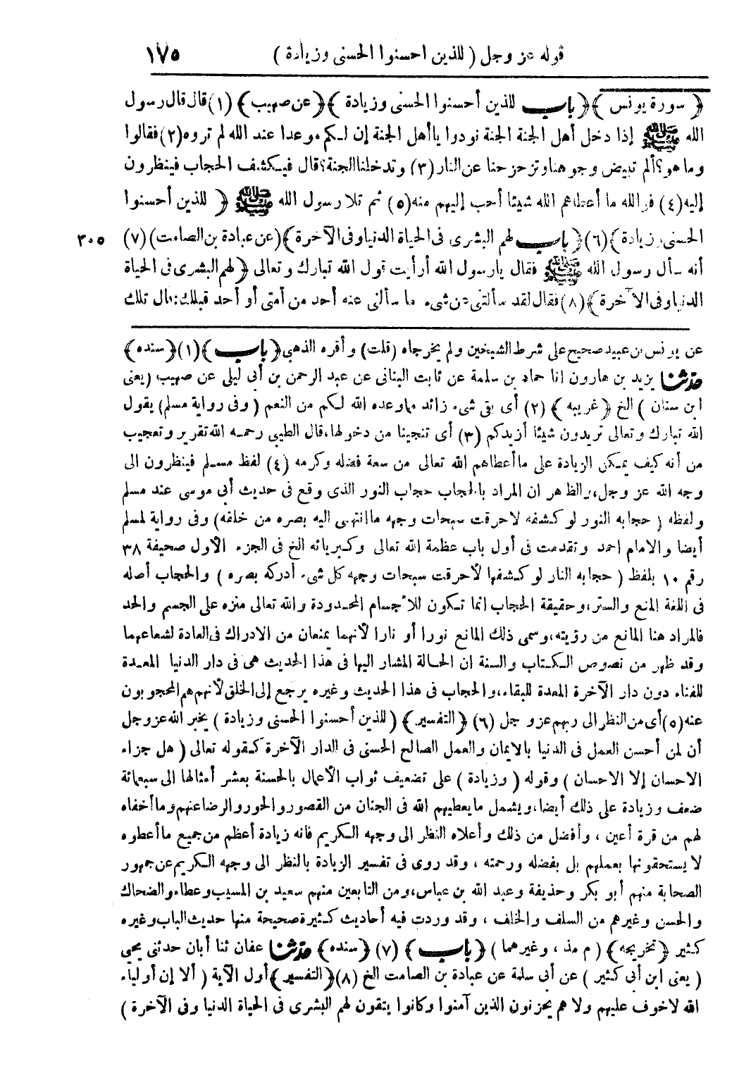 (سورة يونس) (باب للذين أحسنوا الحسنى وزيادة) (عن صهيب) (1) قال قال رسول الله صلى الله عليه وسلم إذا دخل أهل الجنة الجنة نودوا يا أهل الجنة إن لكم موعدا عند الله لم تروه (2) فقالوا وما هو؟ ألم تبيض وجوهنا وتزحزحنا عن النار (3) وتدخلنا الجنة؟ قال يكشف الحجاب فينظرون إليه (4) فوالله ما أعطاهم الله شيئا أحب إليهم منه (5) ثم تلا رسول الله صلى الله عليه وسلم {للذين أحسنوا الحسنى وزيادة} (6) (باب لهم البشرى في الحياة الدنيا وفي الآخرة) (عن عبادة بن الصامت) (7) أنه سأل رسول الله صلى الله عليه وسلم فقال يا رسول الله أرأيت قول الله تبارك وتعالى {لهم البشرى في الحياة الدنيا وفي الآخرة} (8) فقال لقد سألتني عن شيء ما سألني عنه أحد من أمتي أو أحد قبلك: قال تلك