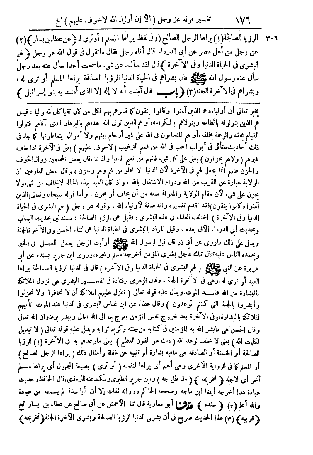 يخبر تعالى أن أولياءه هم الذين آمنوا وكانوا يتقون كما فسرهم بهم فكل من كان تقيا كان لله وليا: قيل هم الذين يتولونه بالطاعة ويتولاهم بالكرامة، أو هم الذين تولى الله هداهم بالبرهان الذي آتاهم فتولوا القيام بحقه والرحمة يخلقه، أو هم المتحابون في الله على غير أرحام بينهم ولا أموال يتعاطونها كما جاء في ذلك أحاديث ستأتي في أبواب الحب في الله من قسم الترغيب (لا خوف عليهم) يعني في الآخرة إذا خاف غيرهم (ولا هم يحزنون) يعني على كل شيء فاتهم من نعيم الدنيا ولذاتها، قال بعض المحققين زوال الخوف والحزن عنهم إنما يجعل لهم في الآخرة لأن الدنيا لا تخلو من غم وهم وحزن، وقال بعض العارفين إن الولاية عبارة عن القرب من الله ودوام الاشتغال بالله، وإذا كان العبد بهذه الحالة لا يخاف من شيء مولا يحزن على شيء لأن مقام الولاية والمعرفة منعه من أن يخاف أو يحزن، وأما قوله سبحانه وتعالى {الذين آمنوا وكانوا يتقون} فقد تقدم تفسيرها وأنه صفة لأولياء الله، وقوله عز وجل {لهم البشرى في الحياة الدنيا وفي الآخرة} اختلف العلماء في هذه البشرى، فقيل هي الرؤيا الصالحة: مستدلين بحديث الباب وبحديث أبي الدرداء الآتي بعده، وقيل المراد بالبشرى في الحياة الدنيا هي الثناء الحسن وفي الآخرة الجنة ويدل على ذلك ما روى عن أبي ذر قال قيل لرسول الله صلى الله عليه وسلم أرأيت الرجل يعمل العمل في الخير ويحمده الناس عليه؟ قال تلك عاجل بشرى المؤمن أخرجه مسلم وغيره، وروى ابن جرير بسنده عن أبي هريرة عن النبي صلى الله عليه وسلم (لهم البشرى في الحياة الدنيا وفي الآخرة) قال في الدنيا الرؤيا الصالحة يراها العبد أو ترى له، وهي في الآخرة الجنة، وقال الزهري وقتاة في تفسير البشرى هي نزول الملائكة بالبشارة من الله عند الموت، ويدل عليه قوله تعالى {تتنزل عليهم الملائكة أن لا تخافوا ولا تحزنوا وأبشروا بالجنة التي كنتم توعدون} وقال عطاء عن ابن عباس البشرى في الدنيا عند الموت تأتيهم الملائكة بالبشارة، وفي الآخرة بعد خروج نفس المؤمن يعرج بها إلى الله تعالى ويبشر برضوان الله تعالى وقال الحسن هي ما بشر الله به المؤمنين في كتابه من جنته وكريم ثوابه ويدل عليه قوله تعالى {لا تبديل لكلمات الله} يعني لا خلف لوعد الله (ذلك هو الفوز العظيم) يعني ما وعدهم به في الآخرة (1) الرؤيا الصالحة أو الحسنة أو الصادقة هي ما فيه بشارة أو تنبيه عن غفلة وأمثال ذلك (يراها الرجل الصالح) أو المسلم كما في الرواية الأخرى وهي أعم أي يراها لنفسه (أو ترى) بصيغة المجهول أي يراها مسلم آخر أي لأجله (تخريجه) (مذ طل جه) وابن جرير الطبري وسكت عنه الترمذي، قال الحافظ وحديث عبادة هذا أخرجه أيضا ابن ماجه وصححه الحاكم ورواته ثقات إلا أن أبا سلمة لم يسمعه من عبادة والله أعلم (2) (سنده) حدثنا أبو معاوية قال ثنا الأعمش عن أبي صالح عن عطاء بن يسار الخ (غريبه) (3) هذا الحديث صريح في أن بشرى الدنيا الرؤيا الصالحة وبشرى الآخرة الجنة (تخريجه)