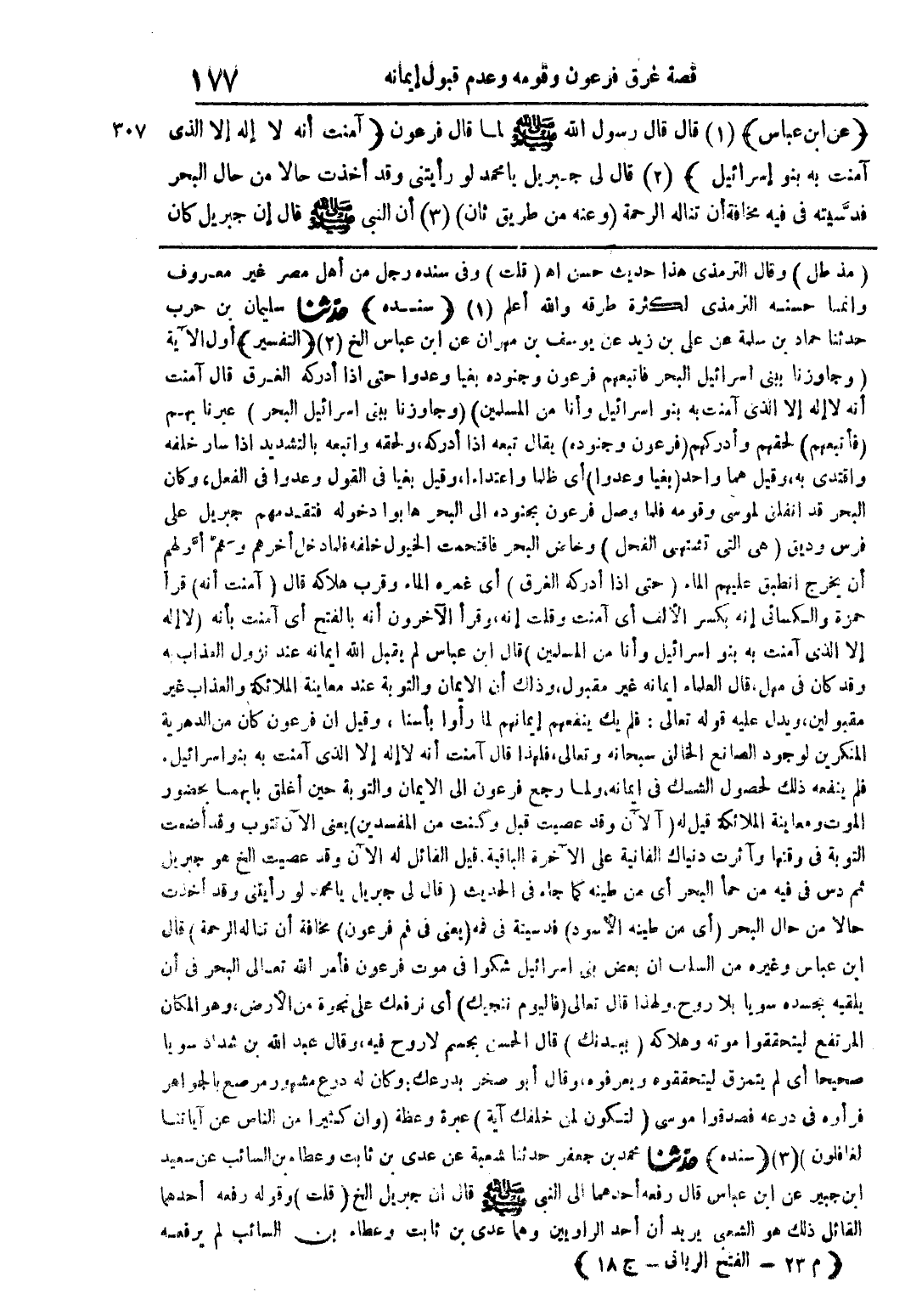 (مذ طل) وقال الترمذي هذا حديث حسن اهـ (قلت) وفي سنده رجل من أهل مصر غير معروف وإنما حسنه الترمذي لكثرة طرقه والله أعلم (1) (سنده) حدثنا سليمان بن حرب حدثنا حماد بن سلمة عن علي بن زيد عن يوسف بن مهران عن ابن عباس الخ (2) (التفسير) أول الآية {وجاوزنا ببني إسرائيل البحر فأتبعهم فرعون وجنوده بغيا وعدوا حتى إذا أدركه الغرق قال آمنت أنه لا إله إلا الذي آمنت به بنو إسرائيل وأنا من المسلمين} (وجاوزنا ببني إسرائيل البحر) عبرنا بهم (فأتبعهم) لحقهم وأدركهم (فرعون وجنوده) يقال تبعه إذا أدركه، ولحقه وأتبعه بالتشديد إذا سار خلفه واقتدى به، وقيل هما واحد (بغيا وعدوا) أي ظلما واعتداءا، وقيل بغيا في القول وعدوا في الفعل، وكان البحر قد انفلق لموسى وقومه فلما وصل فرعون بجنوده إلى البحر هابوا دخوله فتقدمهم جبريل على فرس وديق (هي التي تشتهي الفجل) وخاض البحر فاقتحمت الخيول خلفه فلما دخل أخرهم وهم أوهم أن يخرج انطبق عليهم الماء (حتى إذا أدركه الغرق) أي غمره الماء وقرب هلاكه قال (آمنت أنه) قرأ حمزة والكسائي إنه بكسر الألف أي آمنت وقلت إنه، وقرآ الآخرون أنه بالفتح أي آمنت بأنه (لا إله إلا الذي آمنت به بنو إسرائيل وأنا من المسلمين) قال ابن عباس لم يقبل الله إيمانه عند نزول العذاب به وقد كان في مهل، قال العلماء إيمانه غير مقبول، وذلك أن الإيمان والتوبة عند معاينة الملائكة والعذاب غير مقبولين، ويدل عليه قوله تعالى: فلم يك ينفعهم إيمانهم لما رأوا بأسنا، وقيل إن فرعون كان من الدهرية المنكرين لوجود الصانع الخالق سبحانه وتعالى، فلهذا قال آمنت أنه لا إله إلا الذي آمنت به بنو إسرائيل. فلم ينفعه ذلك لحصول الشك في إيمانه، ولما رجع فرعون إلى الإيمان والتوبة حين أغلق بأيهما بحضور الموت ومعاينة الملائكة قيل له (آلان وقد عصيت قبل وكنت من المفسدين) يعني الآن تتوب وقد أضعت التوبة في وقتها وآثرت دنياك الفانية على الآخرة الباقية. قيل القائل له الآن وقد عصيت الخ هو جبريل ثم دس في فيه من حمأ البحر أي من طينه كما جاء في الحديث (قال لي جبريل يا محمد لو رأيتني وقد أخذت حالا من حال البحر (أي من طينه الأسود) فدسيته في فمه (يعني في فم فرعون) مخافة أن تناله الرحمة) قال ابن عباس وغيره من السلب أن بعض بني إسرائيل شكوا في موت فرعون فأمر الله تعالى البحر في أن يلقيه بجسده سويا بلا روح، ولهذا قال تعالى (فاليوم ننجيك) أي نر فمك على نجوة من الأرض، وهو المكان المرتفع ليتحققوا موته وهلاكه (ببدنك) قال الحسن بجسم لا روح فيه، وقال عبد الله بن شداد سويا صحيحا أي لم يتمزق لتيحققوه ويعرفوه، وقال أبو صخر بدرعك: وكان له درع مشهور مرصع بالجواهر فرأوه في درعه فصدقوا موسى (لتكون لمن خلفك آية) عبرة وعظة (وإن كثيرا من الناس عن آياتنا لغافلون) (3) (سنده) حدثنا محمد بن جعفر حدثنا شعبة عن عدي بن ثابت وعطاء بن السائب عن سعيد ابن جبير عن ابن عباس قال رفعه أحدهما إلى النبي صلى الله عليه وسلم قال إن جبريل الخ (قلت) وقوله رفعه أحدهما القائل ذلك هو الشعبي يريد أن أحد الراويين وهما عدي بن ثابت وعطاء بن السائب لم يرفعه