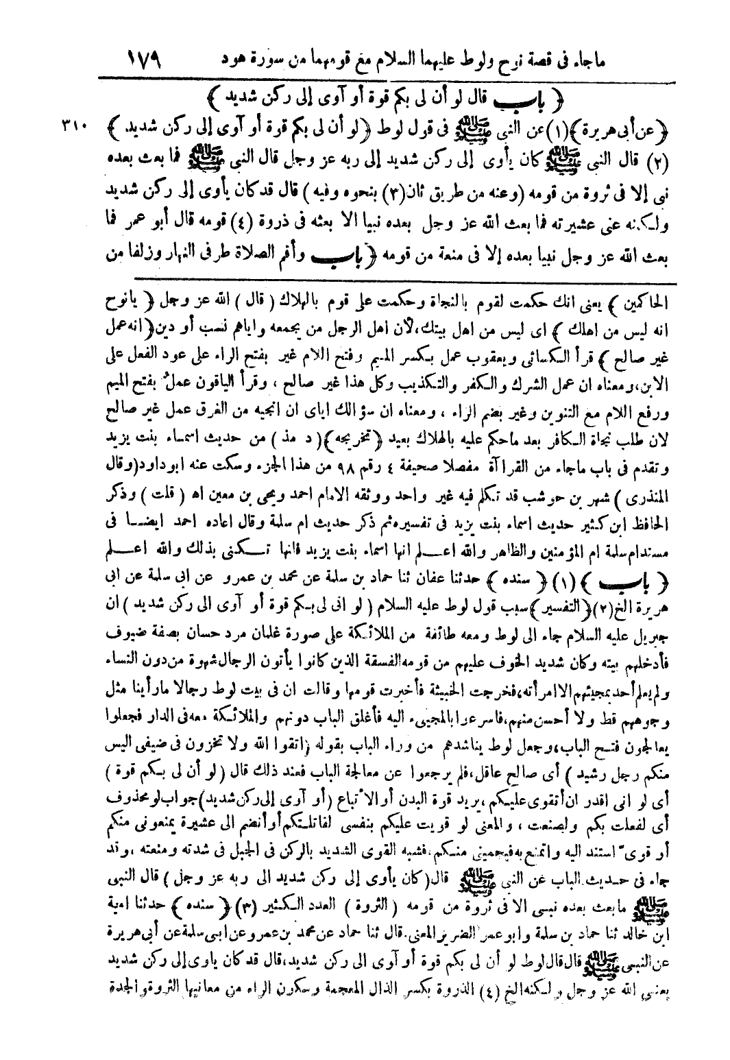 الحاكمين) يعني أنك حكمت لقوم بالنجاة وحكمت على قوم بالهلاك (قال) الله عز وجل (يا نوح إنه ليس من أهلك) أي ليس من أهل بيتك، لأن أهل الرجل من يجمعه وإياهم نسب أو دين (إنه عمل غير صالح) قرأ الكسائي ويعقوب عمل بكسر الميم وفتح اللام غير بفتح الراء على عود الفعل على الابن، ومعناه أن عمل الشرك والكفر والتكذيب وكل هذا غير صالح، وقرأ الياقون عمل بفتح الميم ورفع اللام مع التنوين وغير بضم الراء، ومعناه أن سؤالك إياي أن أنجيه من الغرق عمل غير صالح لأن طلب نجاة الكافر بعدما حكم عليه بالهلاك بعيد (تخريجه) (د مذ) من حديث أسماء بنت يزيد وتقدم في باب ما جاء من القراءة مفصلا صحيفة 4 رقم 98 من هذا الجزء وسكت عنه أبو داود (وقال المنذري) شهر بن حوشب قد تكلم فيه غير واحد ووثقه الإمام أحمد ويحيى بن معين اهـ (قلت) وذكر الحافظ ابن كثير حديث أسماء بنت يزيد في تفسيرها ثم ذكر حديث أم سلمة وقال إعادة أحمد أيضا في مسند أم سلمة أم المؤمنين والظاهر والله أعلم أنها أسماء بنت يزيد فإنها تكنى بذلك والله أعلم (باب) (1) (سنده) حدثنا عفان ثنا حماد بن سلمة عن محمد بن عمرو عن أبي سلمة عن أبي هريرة الخ (2) (التفسير) سبب قول لوط عليه السلام (لو أني لي بكم قوة أو آوى إلى ركن شديد) إن جبريل عليه السلام جاء إلى لوط ومعه طائفة من الملائكة على صورة غلمان مرد حسان بصفة ضيوف فأدخلهم بيته وكان شديد الخوف عليهم من قومه الفسقة الذين كانوا يأتون الرجال شهوة من دون النساء ولم يعلم أحد بمجيئهم إلا امرأته، فخرجت الخبيثة فأخبرت قومها وقالت إن في بيت لوط رجالا ما رأينا مثل وجوههم قط ولا أحسن منهم، فأسرعوا بالمجيء إليه فأغلق الباب دونهم والملائكة معه في الدار فجعلوا يعالجون فتسح الباب، وجعل لوط يناشدهم من وراء الباب بقوله (اتقوا الله ولا تخزون في ضيفي أليس منك رجل شديد) أي صالح عاقل، فلم يرجعوا عن معالجة الباب فعند ذلك قال (لو أن لي بكم قوة) أي لو أني أقدر أن أتقوى عليكم، يريد قوة البدن أو الأتباع (أو آوى إلى ركن شديد) جواب لو محذوف أي لفعلت بكم ولصنعت، والمعنى لو قويت عليكم بنفسي لقاتلتكم أو أنضم إلى عشيرة يمنعوني منكم أو قوي أستند إليه وأتمنع به فيحميني منكم فشبه القوي الشديد بالركن في الجبل في شدته ومنعته، وقد جاء في حديث الباب عن النبي صلى الله عليه وسلم قال (كان يأوي إلى ركن شديد إلى ربه عز وجل) قال النبي صلى الله عليه وسلم ما بعث بعده نبي إلا في ثروة من قومه (الثروة) العدد الكثير (3) (سنده) حدثنا أمية ابن خالد ثنا حماد بن سلمة وأبو عمر الضرير المعنى. قال ثنا حماد عن محمد بن عمرو عن أبي سلمة عن أبي هريرة عن النبي صلى الله عليه وسلم قال قال لوط لو أن لي بكم قوة أو آوى إلى ركن شديد، قال قد كان يأوي إلى ركن شديد يعني الله عز وجل ولكنه الخ (4) الذروة بكسر الذال المعجمة وسكون الراء من معانيها الثروة والجدة