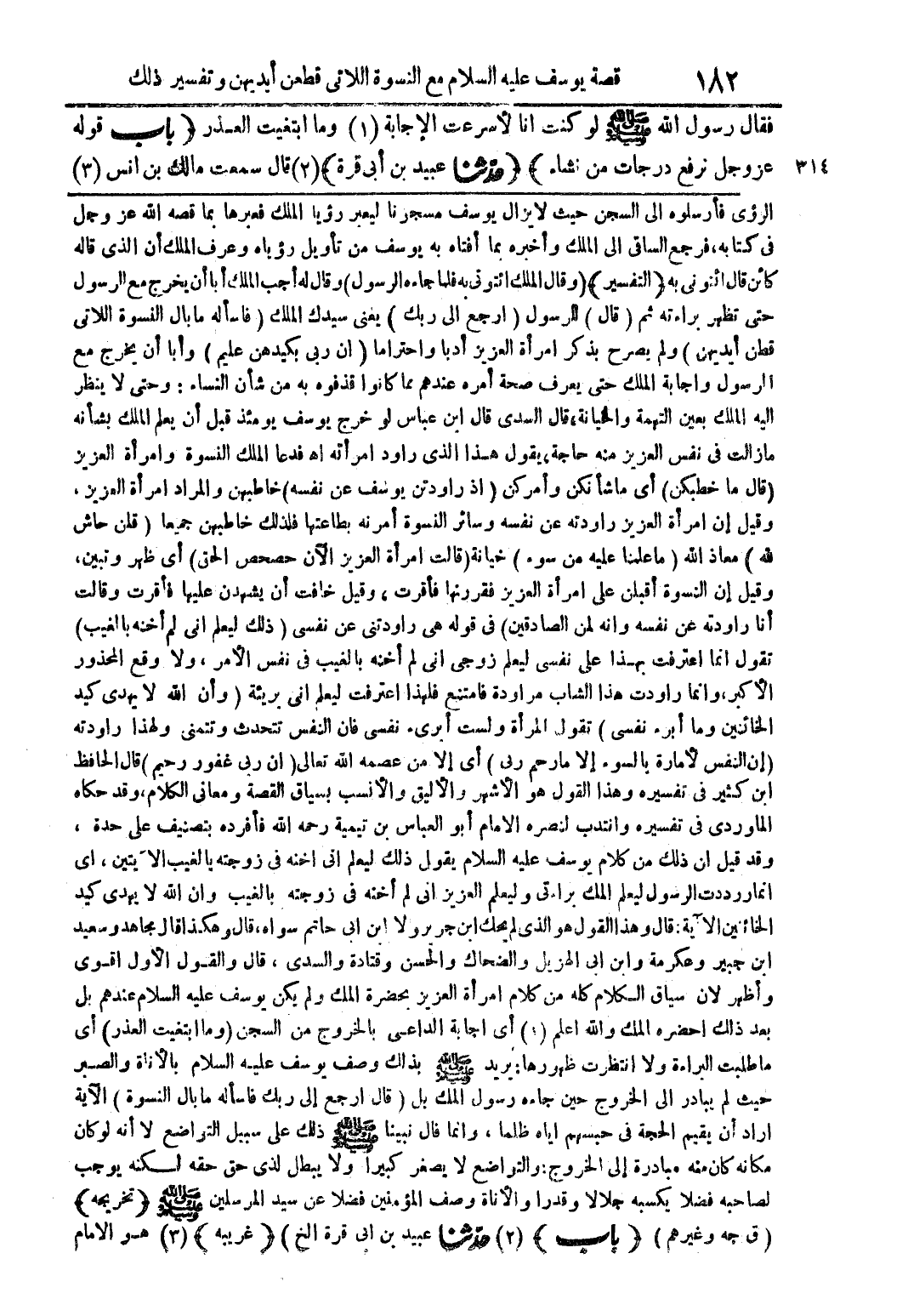 الرؤى فأرسلوه إلى السجن حيث لا يزال يوسف مسجونا ليعبر رؤيا الملك فعبرها بما قصه الله عز وجل في كتابه، فرجع الساقي إلى الملك وأخبره بما أفتاه به يوسف من تأويل رؤياه وعرف الملك أن الذي قاله كائن قال ائتوني به (التفسير) (وقال الملك ائتوني به فلما جاءه الرسول) وقال له أجب الملك أبا أن يخرج مع الرسول حتى تظهر براءته ثم قال (للرسول) (ارجع إلى ربك) يعني سيدك الملك (فاسأله ما بال النسوة اللاتي قطعن أيديهن) ولم يصرح بذكر امرأة العزيز أذبا واحتراما (إن ربي بكيدهن عليم) وأبا أن يخرج مع الرسول وأجابه الملك حتى يعرف صحة أمره عندهم مما كانوا قذفوه به من شأن النساء: وحتى لا ينظر إليه بعين التهمة والخيانة، قال السدي قال ابن عباس لو خرج يوسف يومئذ قبل أن يعلم الملك بشأنه مازالت في نفس العزيز منه حاجة، يقول هذا الذي رواد امرأته اهـ فدعا الملك النسوة وامرأة العزيز (قال ما خطبكن) أي ما شأنكن وأمركن (إذ راودتن يوسف عن نفسه) خاطبهن والمراد امرأة العزيز، وقيل إن امرأة العزيز راودته عن نفسه وسائر النسوة أمرنه بطاعتها فلذلك خاطبهن جميعا (قلن حاش لله) معاذ الله (ما علمنا عليه من سوء) خيانة (قالت امرأة العزيز الآن حصحص الحق) أي ظهر وتبين، وقيل إن النسوة أقبلن على امرأة العزيز فقررنها فأقرت، وقيل خافت أن يشهدن عليها فأقرت وقالت أنا راودته عن نفسه وإنه لم الصادقين في قوله هي راودتني عن نفسي (ذلك ليعلم إني لم أخنه بالغيب) تقول إنما اعترفت بهذا على نفسي ليعلم زوجي إني لم أخنه بالغيب في نفس الأمر، ولا وقع المحذور الأكبر، وإنما راودت هذا الشاب مراودة فامتنع فلهذا اعترفت ليعلم أني بريئة (وأن الله لا يهدي كيد الخائنين وما أبرء نفسي) تقول المرأة ولست أبرئ نفسي فإن النفس تتحدث وتتمنى ولهذا راودته (إن النفس لأمارة بالسوء إلا ما رحم ربي) أي إلا من عصمه الله تعالى {إن ربي غفور رحيم} قال الحافظ ابن كثير في تفسيره وهذا القول هو الأشهر والأليق والأنسب بسياق القصة ومعاني الكلام، وقد حكاه الماوردي في تفسيره وانتدب لنصره الإمام أبو العباس بن تيمية رحمه الله فأفرده بتصنيف على حدة، وقد قيل إن ذلك من كلام يوسف عليه السلام يقول ذلك ليعلم إني أخنه في زوجته بالغيب الآيتين، أي إنما رددت الرسول ليعلم الملك براءتي وليعلم العزيز إني لم أخنه في زوجته بالغيب وإن الله لا يهدي كيد الخائنين الآية: قال وهذا القول هو الذي لم يحك ابن جرير ولا ابن أبي حاتم سواه، قال وهكذا قال مجاهد وسعيد ابن جبير وعكرمة وابن أبي الهزيل والضحاك والحسن وقتادة السدى، قال والقول الأول أقوى وأظهر لأن سياق الكلام كله من كلام امرأة العزيز بحضرة الملك، ولم يكن يوسف عليه السلام عندهم بل عبد ذلك أحضره الملك والله أعلم (1) أي إجابة الداعي بالخروج من السجن (وما ابتغيت العذر) أي ما طلبت البراءة ولا انتظرت ظهورها: يريد صلى الله عليه وسلم بذاك وصف يوسف عليه السلام بالأناة والصبر حيث لم يبادر إلى الخروج حين جاءه رسول الملك بل {قال ارجع إلى ربك فاسأله ما بال النسوة} الآية أراد أن يقيم الحجة في حبسهم إياه ظلما، وإنما قال نبينا صلى الله عليه وسلم ذلك على سبيل التواضع لا أنه لو كان مكانه كان منه مبادرة إلى الخروج: والتواضع لا يصغر كبيرا ولا يبطل لذي حق حقه لكنه يوجب لصاحبه فضلا يكسبه جلالا وقدرا والأناة وصف المؤمنين فضلا عن سيد المرسلين صلى الله عليه وسلم (تخريجه) (ق جه وغيرهم) (باب) (2) حدثنا عبيد بن أبي قرة الخ) (غريبه) (3) هو الإمام