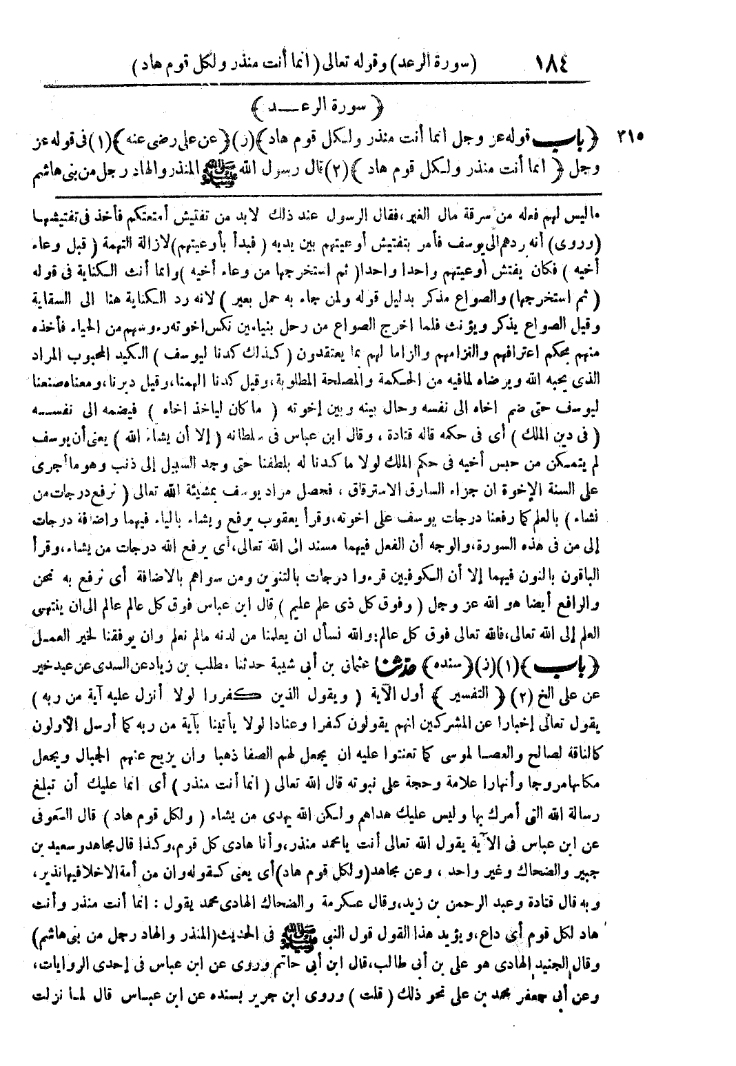 (باب قوله عز وجل إنما أنت منذر ولكل قوم هاد) (ز) (عن علي رضي الله عنه) (1) في قوله عز وجل {إنما أنت منذر ولكل قوم هاد} (2) قال رسول الله صلى الله عليه وسلم المنذر والهاد رجل من بني هاشم