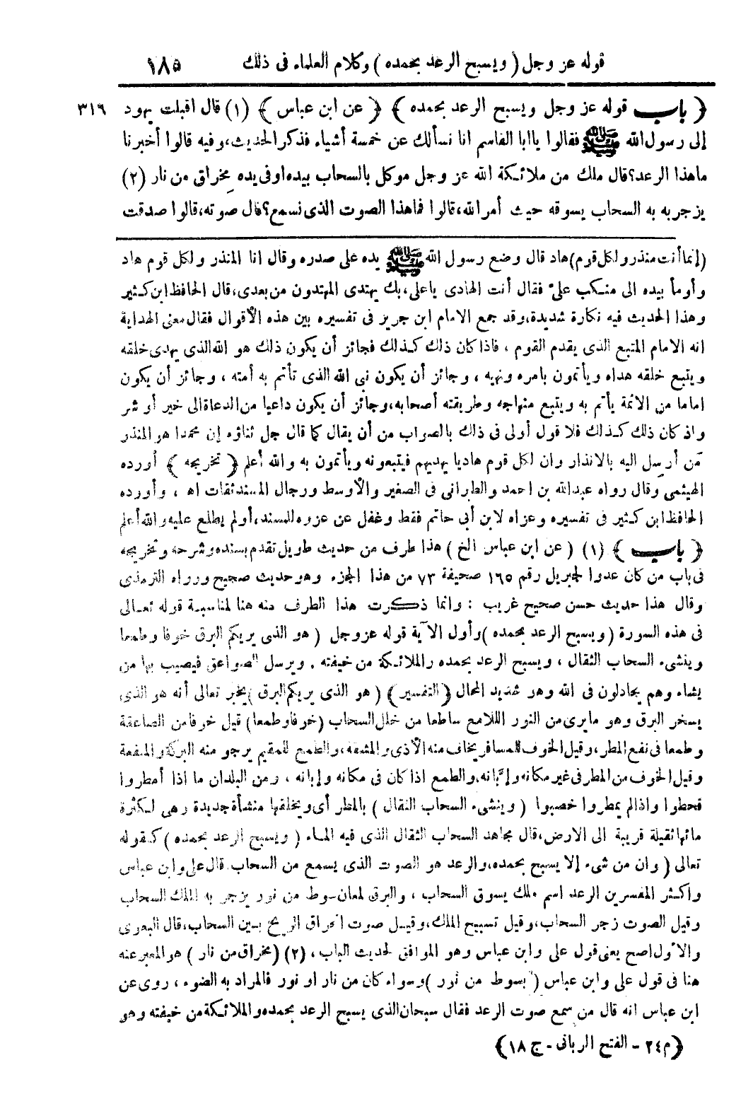 (باب قوله عز وجل ويسبح الرعد بحمده) (عن ابن عباس) (1) قال أقبلت يهود إلى رسول الله صلى الله عليه وسلم فقالوا يا أبا القاسم أنا نسألك عن خمسة أشياء فذكر الحديث، وفيه قالوا أخبرنا ما هذا الرعد؟ قال ملك من ملائكة الله عز وجل موكل بالسحاب بيداه وفي يده مخراق من نار (2) يزجر به السحاب يسوقه حيث أمر الله، قالوا فما هذا الصوت الذي نسمع؟ قال صوته، قالوا صدقت