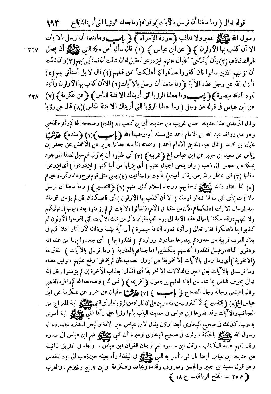 وقال الترمذي هذا حديث حسن غريب من حيث أبي بن كعب اهـ (قلت) وصححه الحكم وأقره الذهبي وهو من زوائد عبد الله بن الإمام أحمد على مسند أبيه رحمهما الله (باب) (1) (سنده) حدثنا عثمان بن محمد (قال عبد الله بن الإمام أحمد) وسمعته أنا من حدثنا جرير عن الأعمش عن جعفر بن إياس عن سعيد بن جبير عن ابن عباس الخ (غريبه) (2) أي طلبوا أن يحول لهم بل الصفا الموجود بمكة من حجر إلى ذهب (وأن ينحى الجبال عنهم) أي يزيلها من أماكنها (فيزدرعوا) أي فيزرعوا مكانها (3) أي تنتظر وتتربص، يقال أنيت وتأنيت واستأنيت (4) يعني مثل قوم نوح وعاد وثمود وغيرهم (5) إنما اختار ذلك صلى الله عليه وسلم رحمة بهم ورجاء إسلام كثير منهم (6) (التفسير) {وما منعنا أن نرسل بالآيات} أي التي سألها كفار قولك (إلا أن كذب بها الأولون) أي فأهلكناهم فإن لم يؤمن قومك بعد إرسال الآيات أهلكناهم، لأن من سنتنا في الأمم إذا سألوا الآيات ثم لم يؤمنوا بعد إتيانها إن تهلكهم ولا نمهلهم، وقد حكمنا بإمهال هذه الأمة إلى يوم القيامة: ثم ذكر من تلك الآيات التي اقترحها الأولون ثم كذبوا بها فأهلكوا فقال تعالى {وآتينا ثمود الناقة مبصرة} أي آية بينة وذلك لأن آثار إهلاكهم في بلاد العرب قريبة من حدودهم يبصرها صادرهم وواردهم (فظلموا بها) أي جحدوا بها من عند الله وعقروا الناقة، وقيل فظلموا أنفسهم بتكذيبها فعاجلناهم بالعقوبة (وما نرسل بالآيات) المقترحة (إلا تخويفا) أي وما نرسل بالآيات يعني العبر والدلالات إلا تخريفا أي إنذارا بعذاب الآخرة إن لم يؤمنوا، فإن الله تعالى يخوف الناس بما شاء من آياته لعلهم يرجعون (تخريجه) (نس ك) وصححه الحاكم وأقره الذهبي وقال الهيثمي رجاله رجال الصحيح (باب) (7) حدثنا سفيان عن عمرو عن عكرمة عن ابن عباس الخ (8) (التفسير) الأكثرون من المفسرين على أن المراد من الرؤيا ما رأى النبي صلى الله عليه وسلم ليلة المعراج من العجائب والآيات وقد فسرها ابن عباس في حديث الباب بأنها رؤيا عين رآها النبي صلى الله عليه وسلم ليلة أسرى به، وجاء كذلك في صحيح البخاري أيضا وكان يقال لابن عباس حبر الأمة والبحر لكثرة علمه. دعا له رسول الله صلى الله عليه وسلم بالحكمة، وثبت في صحيح البخاري وغيره أن النبي صلى الله عليه وسلم ضم ابن عباس إلى صدره وقال اللهم علمه الكتاب، وقال ابن مسعود نعم الترجمان القرآن ابن عباس، وجاء في الطريق الثانية من حديث ابن عباس أيضا قال شيء أمر به النبي صلى الله عليه وسلم في اليقظة رآه بعينه حين ذهب إلى بيت المقدس وهو قول سعيد بن جبير والحسن ومعروف وقتادة ومجاهد وعكرمة وابن جريج وغيرهم، والعرب