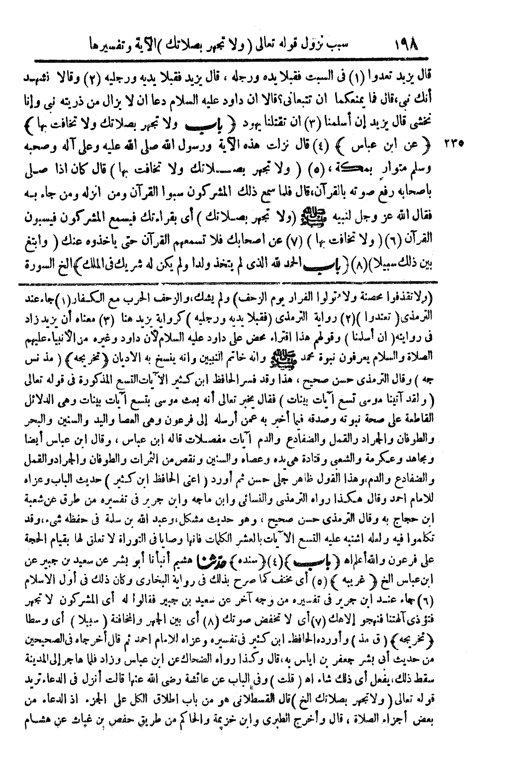 قال يزيد تعدوا (1) في السبت فقبلا يده ورجله، قال يزيد فقبلا يديه ورجليه (2) وقال نشهد أنك نبي، قال فما يمنعكما أن تتبعاني؟ قالا أن داود عليه السلام دعا أن لا يزال من ذريته نبي وإنا نخشى قال يزيد إن أسلمنا (3) أن تقتلنا يهود (باب ولا تجهر بصلاتك ولا تخافت بها) (عن ابن عباس) (4) قال نزلت هذه الآية ورسول الله صلى الله عليه وعلى آله وصحبه وسلم متوار بمكة (5) (ولا تجهر بصلاتك ولا تخافت بها) قال كان إذا صلى بأصحابه رفع صوته بالقرآن، قال فلما سمع ذلك المشركون سبوا القرآن ومن أنزله ومن جاء به فقال الله عز وجل لنبيه صلى الله عليه وسلم (ولا تجهر بصلاتك) أي بقراءتك فيسمع المشركون فيسبون القرآن (6) (ولا تخافت بها) (7) عن أصحابك فلا تسمعهم القرآن حتى يأخذوه عنك (وابتغ بين ذلك سبيلا) (8) (باب الحمد لله الذي لم يتخذ ولدا ولم يكن له شريك في الملك) الخ السورة