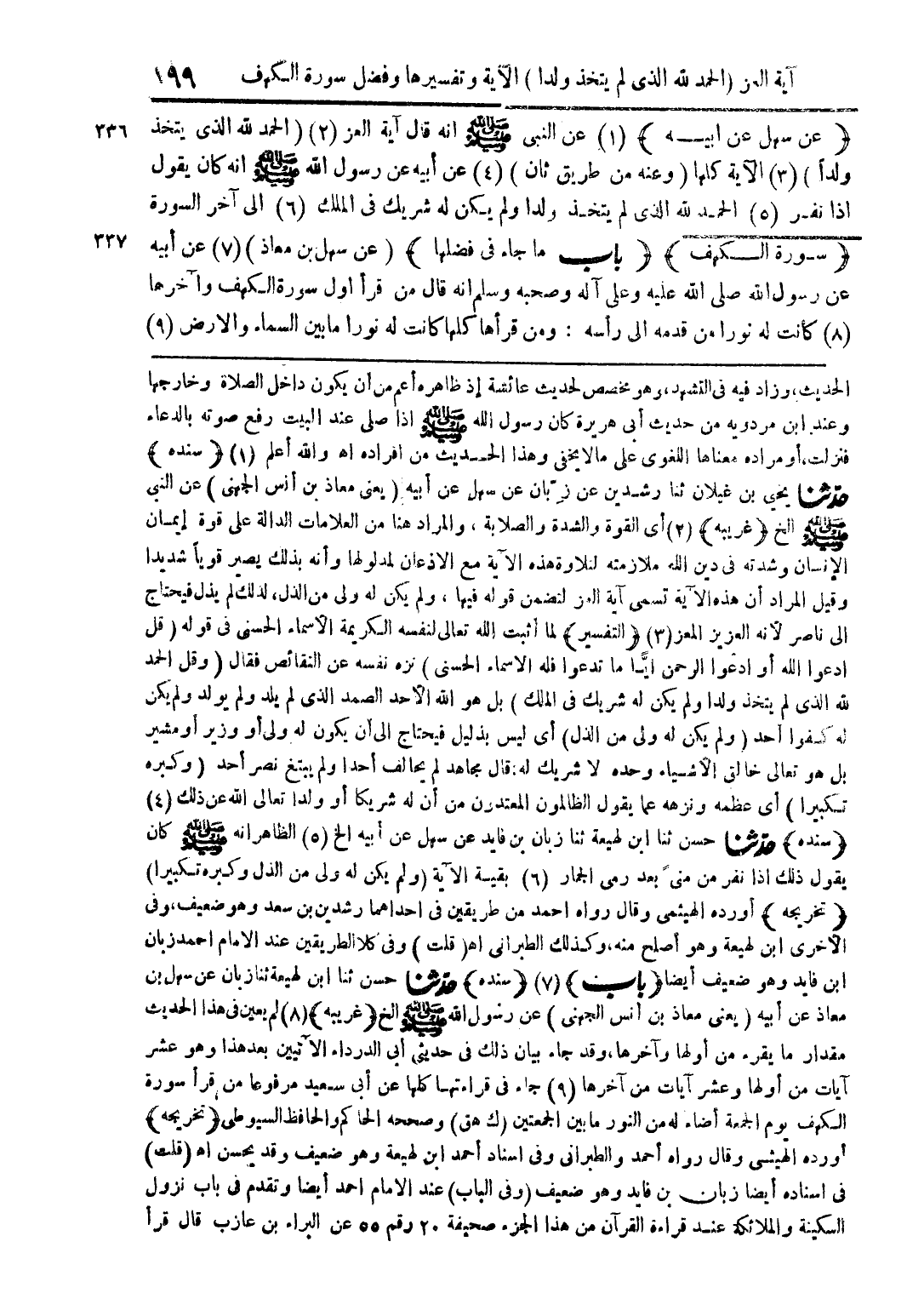 (عن سهل عن أبيه) (1) عن النبي صلى الله عليه وسلم أنه قال آية العز (2) (الحمد لله الذي يتخذ ولدًا) (3) الآية كلها (وعنه من طريق ثان) (4) عن أبيه عن رسول الله صلى الله عليه وسلم أنه كان يقول إذا نفر (5) الحمد لله الذي لم يتخذ ولدا ولم يكن له شريك في الملك (6) إلى آخر السورة (سورة الكهف) (باب ما جاء في فضلها) (عن سهل بن معاذ) (7) عن أبيه عن رسول الله صلى الله عليه وعلى آله وصحبه وسلم أنه قال من قرأ أول سورة الكهف وآخرها (8) كأنت له نورا من قدمه إلى رأسه: ومن قرأها كلها كانت له نورا ما بين السماء والأرض (9)