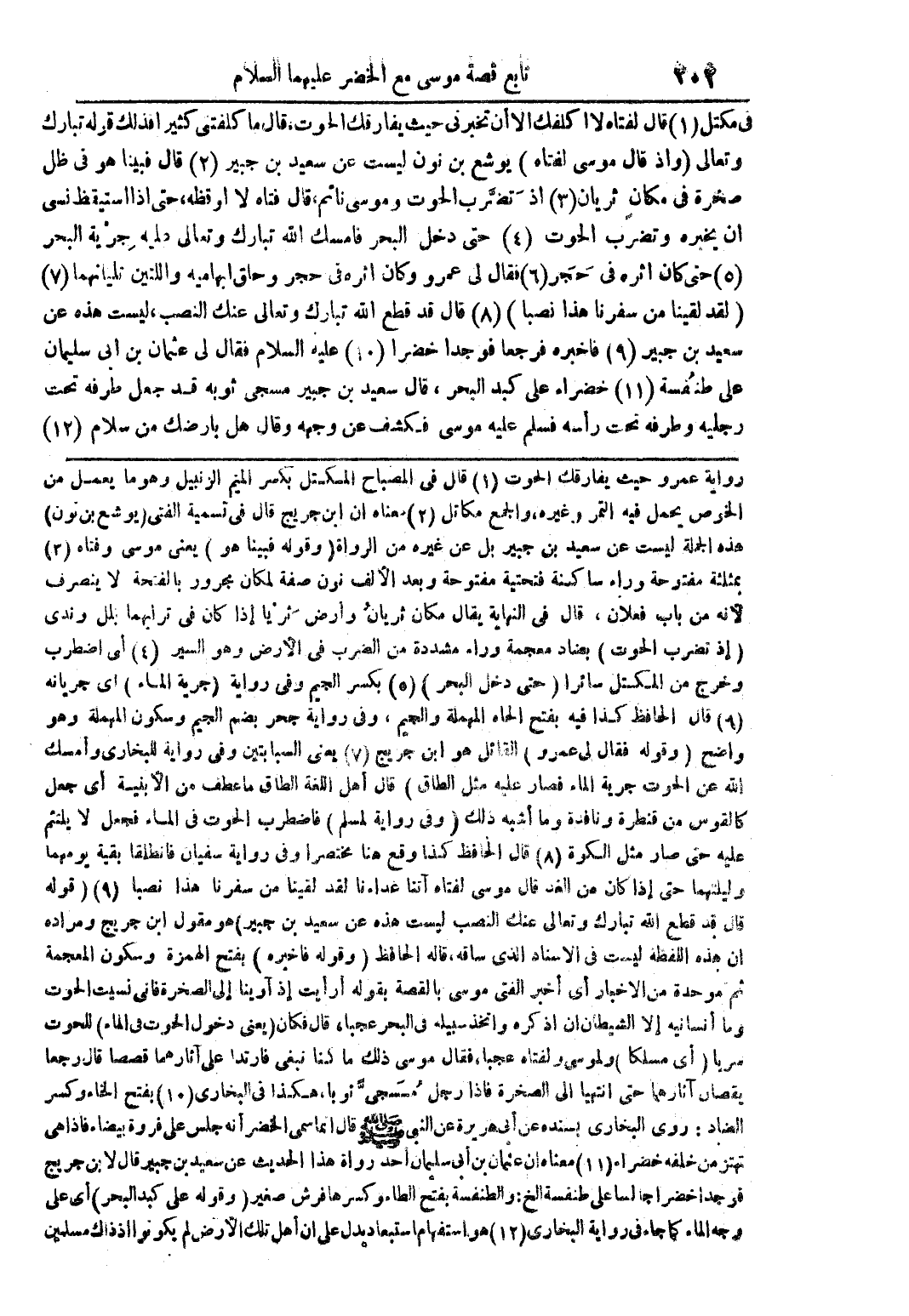 رواية عمرو حيث يفارقك الحوت (1) قال في المصباح المكتل بكسر الميم الزنبيل وهو ما يعمل من الخوص يحمل فيه التمر وغيره، والجمع مكاتل (2) معناه أن ابن جريج قال في تسمية الفتى (يوشع بن نون) هذه الجملة ليست عن سعيد بن جبير بل عن غيره من الرواة (وقوله فبينما هو) يعني موسى وفتاه (3) بمثلثة مفتوحة وراء ساكنة فتحتية مفتوحة وبعد الألف نون صفة لمكان مجرور بالفتحة لا ينصرف لأنه من باب فعلان، قال في النهاية يقال مكان ثريان وأرض ثريا إذا كان في ترابهما بلل وندى (إذ تضرب الحوت) بضاد معجمة وراء مشددة من الضرب في الأرض وهو السير (4) أي اضطرب وخرج من المكتل سائرا (حتى دخل البحر) (5) بكسر الجيم وفي رواية (جرية الماء) أي جريانه (6) قال الحافظ كذا فيه بفتح الحاء المهملة والجيم، وفي رواية جحر بضم الجيم وسكون المهملة وهو واضح (وقوله فقال لي عمرو) القائل هو ابن جريج (7) يعني السبابتين وفي رواية للبخاري وأمسك الله عن الحوت جرية الماء فصار عليه مثل الطاق) قال أهل اللغة الطاق ما عطف من الأبنية أي جعل كالقوس من قنطرة ونافذة وما أشبه ذلك (وفي رواية لمسلم) فاضطرب الحوت في الماء فجعل لا يلتئم عليه حتى صار مثل الكوة (8) قال الحافظ كذا وقع هنا مختصرا وفي رواية سفيان فانطلقا بقية يومهما وليلتها حتى إذا كان من الغد قال موسى لفتاه آتنا غداءنا لقد لقينا من سفرنا هذا نصبا (9) (قوله قال قد قطع الله تبارك وتعالى عنك النصب ليست هذه عن سعيد بن جبير) هو مقول ابن جريج ومراده أن هذه اللفظة ليست في الإسناد الذي ساقه، قاله الحافظ (وقوله فأخبره) بفتح الهمزة وسكون المعجمة ثم موحدة من الأخبار أي أخبر الفتى موسى بالقصة بقوله أرأيت إذ آوينا إلى الصخرة فإني نسيت الحوت وما أنسانيه إلا الشيطان إن أذكره واتخذ سبيله في البحر عجبا، قال فكان (يعني دخول الحوت في الماء) للحوت سريا (أي مسلكا) ولموسى ولفتاه عجبا، فقال موسى ذلك ما كنا نبقى فارتدا على آثارهما قصصا قال رجعا يقصان آثارهما حتى انتهيا إلى الصخرة فإذا رجل مسجي ثوبا، هكذا في البخاري (10) بفتح الخاء وكسر الضاد: روى البخاري بسنده عن أبي هريرة عن النبي صلى الله عليه وسلم قال إنما سمي الخضر أنه جلس على فروة بيضاء فإذا هي تهتز من خلفه خضراء (11) معناه أن عثمان بن أبي سليمان أحد رواة هذا الحديث عن سعيد بن جبير قال لابن جريج فوجدا خضرا جالسا على طنقسة الخ: والطنفسة بفتح الطاء وكسرها فرش صغير (وقوله على كبد البحر) أي على وجه الماء كما جاء في رواية البخاري (12) هو استفهام استبعاد بدل على أن أهل تلك الأرض لم يكونوا إذ ذاك مسلمين