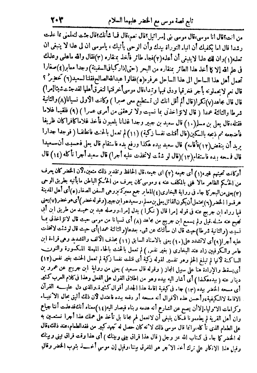 أو كانت تحيتهم غيره (1) أي جميعه (2) أي جميعه، قال الحافظ وتقدير ذلك متعين، لأن الخضر كان يعرف من الحكم الظاهر ما لا غنى بالمكلف عنه، وموسى كان يعرف من الحكم الباطن ما يأتيه بطريق الوحي (3) يعني من البحر كما جاء في رواية البخاري (4) المعابر جمع معبر كمنبر وهي السفن الصغار (5) أي أهل المدينة عرفوا الخضر (6) يحتمل أن يكون القائل يعلى بن مسلم، وسعيد هو ابن جبير (وقوله خضر) أي هو خضر (7) يعني فيما رواه ابن جريج عنه في قوله إمرا قال (نكرا) بدل إمرا، ووصله عبد بن حميد من طريق ابن أبي نجيح عنه مثله، قيل ولم يسمع ابن جريج من مجاهد (8) أي نسيانا من موسى حتى قال لا تؤاخذني بما نسيت (والثانية شرطا) حيث قال إن سألتك عن شيء بعدها (والثالثة عمدا) أي حيث قال لو شئت لاتخذت عليه أجرا (9) أي لا تشدد على (10) يعني بالإسناد السابق (11) بحذف الألف والتشديد وهي قراءة ابن عامر والكوفيين زاد عند البخاري (بغير نفس) لم تعمل بالحنث بالحاء المهملة المكسورة والنون الساكنة لأنها لم تبلغ الحلم وهو تفسير لقوله زكية أي قتلت نفسا زكية لم تعمل الحنث بغير نفس (12) أي يسقط والإرادة هنا على سبيل المجاز (وقوله قال سعيد) يعني من رواية ابن جريج عن عمرو بن دينار عنه (بيده هكذا) أي أشار إليه بيده وهو من إطلاق القول على الفعل وهذا في كلام العرب كثير أي مسحه الخضر بيده (13) جاء في كيفية إقامة هذا الجدار أقوال كثيرة، والذي دل عليه القرآن الإقامة لا الكيفية، وأحسن هذه الأقوال أنه مسحه أو دفعه بيده فاعتدل لأن ذلك أليق بحال الأنبياء وكرامات الأولياء إلا أن يصح عن الشارع أنه هدمه وبناه فيصار إليه (14) معناه أنك قد علمت أننا جياع وأن أهل القرية لم يطعمونا فكان ينبغي أن لا نعمل لهم مجانا بل تأخذ على عملك هذا أجرا نستعين به على الطعام الذي نأكله، وإنما قال موسى ذلك لأنه كان حصل له جهد كبير من فقد الطعام، عند ذلك، قال له الخضر كما جاء في كتاب الله عز وجل (قال هذا فراق بيني وبينك) أي هذا وقت فراق بيني وبينك وقيل هذا الإنكار على ترك أخذ الأجر هو المفرق بيننا، وقيل إن موسى أخذ بثوب الخضر وقال