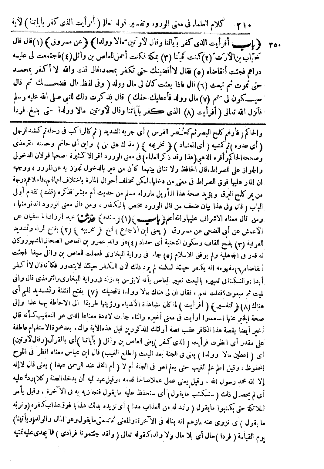 (باب أفرأيت الذي كفر بآياتنا وقال لأوتينّ مالًا وولدا) (عن مسروق) (1) قال قال حبّاب بن الأرتّ (2) كنت قَيْنًا (3) بمكة فكنت أعمل للعاص بن وائل (4) فاجتمعت لي عليه دراهم فجئت أتقاضاه (5) فقال: لا أقضينك حتى تكفر بمحمد. قال: قلت والله لا أكفر بمحمد حتى تموت ثم تبعث (6) قال فإذا بعثت كان لي مال وولد (وفي لفظ مال فضحك ثم قال سيكون لي ثم (7) مال وولد فأعطيك حقك) قال فذكرت ذلك للنبي صلى الله عليه وسلم فأنزل الله تعالى (أفرأيت (8) الذي كفر بآياتنا وقال لأوتين مالا وولدا حتى بلغ فردا