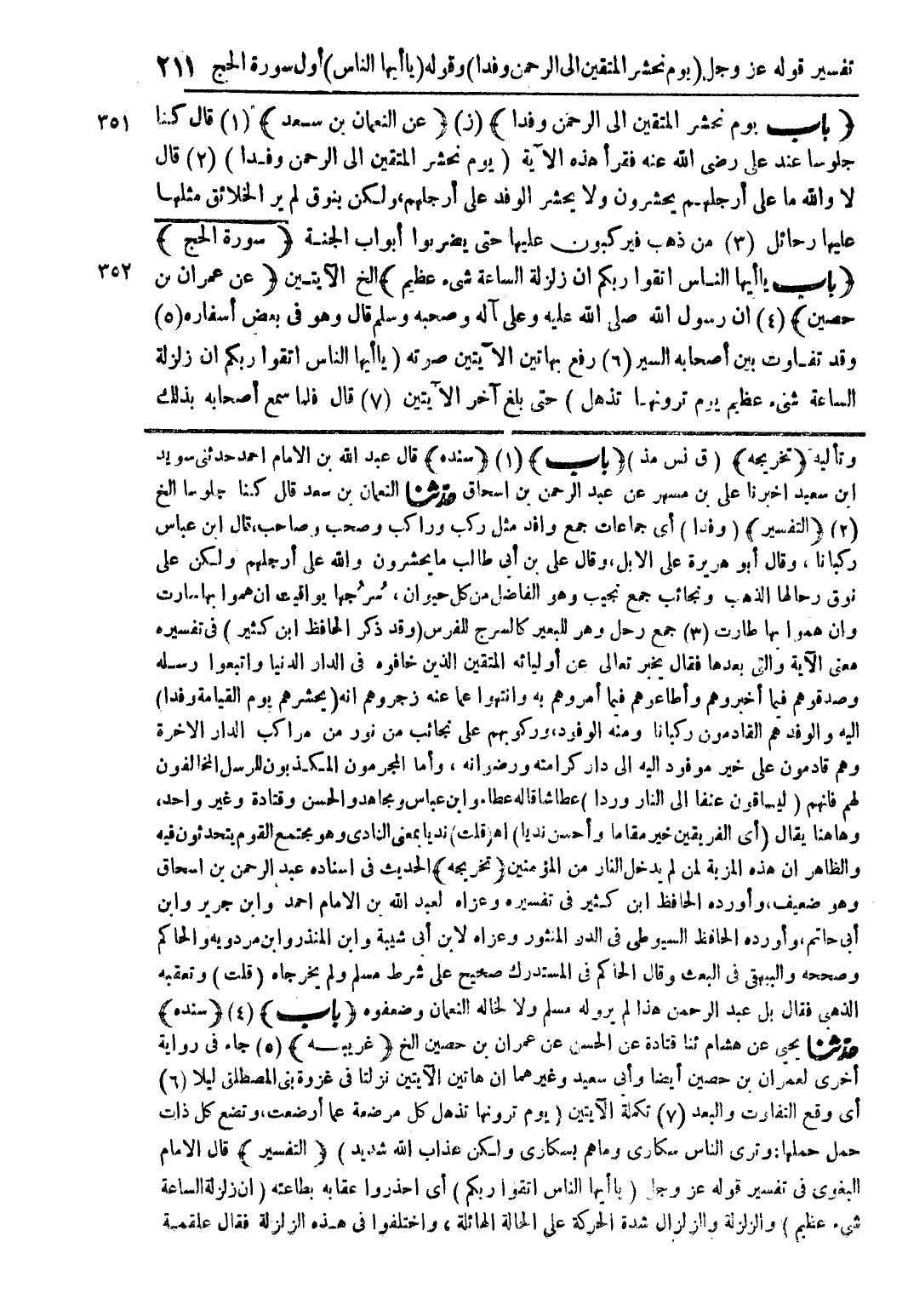 (باب يوم نحشر المتقين إلى الرحمن وفدا) (ز) (عن النعمان بن سعد) (1) قال كنا جلوسا عند علي رضي الله عنه فقرأ هذه الآية (يوم نحشر المتقين إلى الرحمن وفدا) قال لا والله ما على أرجلهم يحشرون ولا يحشر الوفد على أرجلهم، ولكن بنوق لم ير الخلائق مثلها، عليها رحائل من ذهب فيركبون عليها حتى يضربوا أبواب الجنة (سورة الحج) (باب يا أيها الناس اتقوا ربكم إن زلزلة الساعة شيء عظيم) الخ الآيتين (عن عمران حصين) (4) أن رسول الله صلى الله عليه وعلى آله وصحبه وسلم قال وهو في بعض أسفاره (5) وقد تفاوت بين أصحابه السير) رفع بهاتين الآيتين صوته (يا أيها الناس اتقوا ربكم أن زلزلة الساعة شيء عظيم يوم ترونها تذهل) حتى بلغ الآيتين (7) قال لما سمع أصحابه بذلك