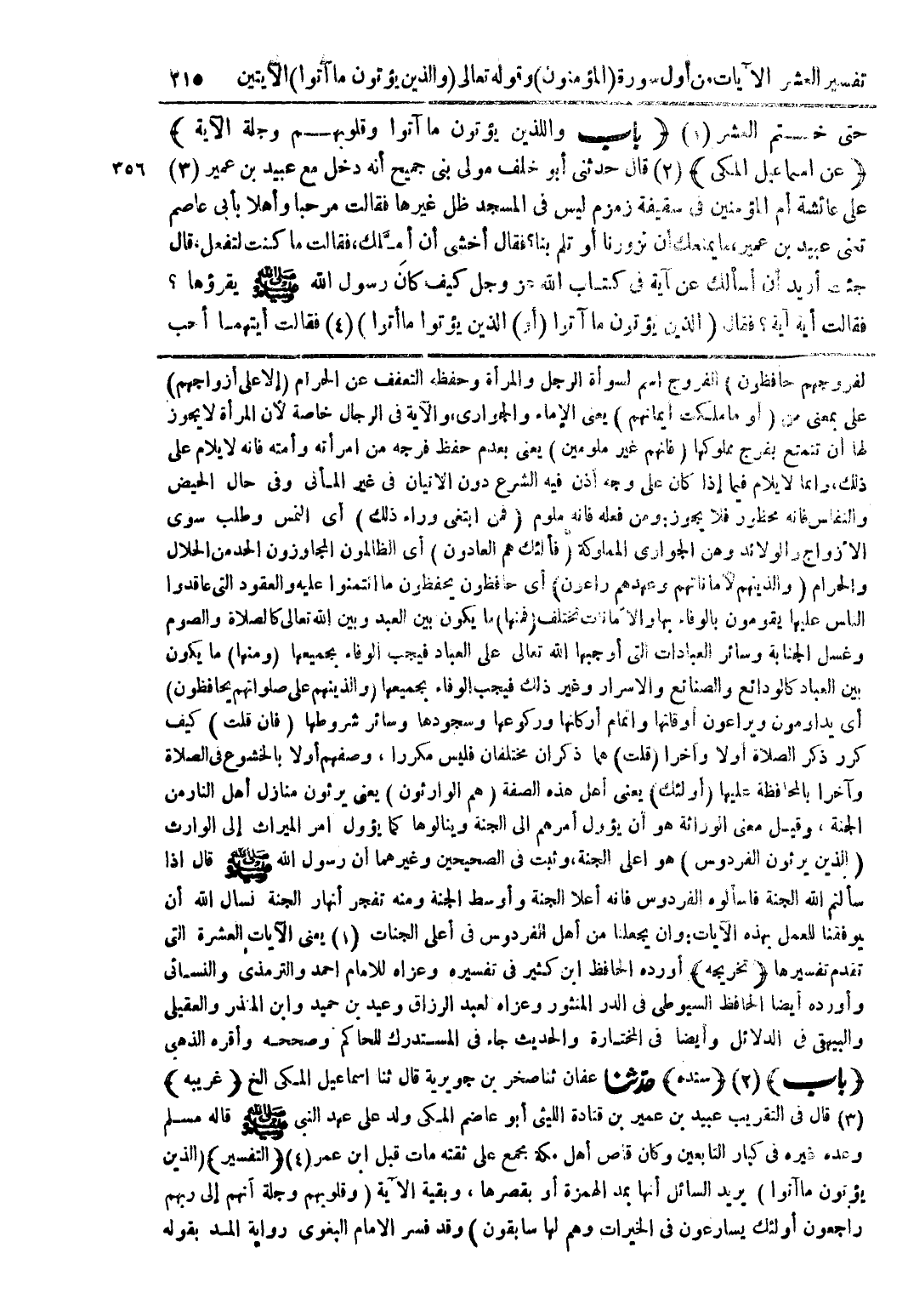 لفروجهم حافظون) الفروح اسم لسوءة الرجل والمرأة وحفظه التعفف عن الحرام (إلا على أزواجهم) على بمعنى من (أ, ما ملكت أيمانهم) يعني الإماء والجوارى، والآية في الرجال خاصة لأن المرأة لا يجوز لها أن تتمتع بفرج مملوكها (فأنهم غير ملومين) يعني بعدم حفظ فرجه من أمرأته وأمته فأنه لا يلام على ذلك، وأمما لا يلام فيما إذا كان على وجه أذن فيه الشرع دون الإتيان غير المأني وفي حال الحيض والنفاس فأنه محظور ومن فعله فأنه ملوم (فمن ابتغى وراء ذلك) أي النمس وطلب سوى الأزواج والولائد وهن الجوارى المملوكة (فأولئك هم العادون) أي الظالمون المجاوزون الحد من الحلال والحرام (والذين لأمانتهم وعهدهم راعون) أي حافظون يحفظون ما ائتمنوا عليه والعقود التي عاقدوا الناس عليهم يقومون بالوفاء بها وألا كانت (فمنها) ما يكون بين العبد وبين الله تعالى كالصلاة والصوم وغسل الجنابة وسائر العبادات التي أوجبها الله تعالى على العبادات التي أوجبها الله تعالى على العباد فيجب الوفاء بجميعها (ومنها) ما يكون بين العباد كالودائع والصنائع والأسرار وغير ذلك فيجب الوفاء بجميعها (والذين هم على صلواتهم يحافظون) أي يداومون ويراعون أوقاتها أركانها وركوعها وسجودها وسائر شروطها (فإن قلت) كيف كرر ذكر الصلاة أولًا وأخرا (قلت) هما ذكران مختلفان مكررا، وصفهم أولًا بالخشوع في الصلاة وآخرا بالمحافظة عليها (أولئك) يعني أهل هذه الصفة (هم الوارثون) يعني يرثون منازل أهل النار من الجنة، وقيل معنى الوراثة هو أن يؤول أمرهم إلى الجنة وينالوها كما يؤول أمر الميراث إلى الوارث (الذين يرثون الفردوس) هو أعلى الجنة، وثبت في الصحيحين وغيرهما أن رسول الله صلى الله عليه وسلم قال إذا سألتم الله الجنة فأسالوه الفردوس فأنه أعلا الجنة وأوسط الجنة ومنه تفجر أنهار الجنة نسأل الله أن ليوفقنا للعمل بهذه الآيات: وإن يجعلنا من أهل الفردوس في أعلى الجنات (1) يعني الآيات العشرة التي تقدم تفسيرها (تخريجه) أورده الحافظ ابن كثير في تفسيره وعزاه للإمام أحمد والترمذي والنسائي وأورده أيضًا الحافظ السيوطي في الدر المنثور وعزاه لعبد الرازق وعيد بن حميد وابن المنذر والعقيلي والبيهقي في الدلائل وأيضًا في المختارة والحديث جاء في المستدرك للحاكم وصححه وأقره الذهبي (باب) (2) (سنده) حدثنا عفان ثنا صخر بن جويرية قال ثنا إسماعيل المكي الخ (غريبه) (3) قال في التقريب عبيد بن عمير بن قتادة الليثي أبو عاضم المكي ولد عهد النبي صلى الله عليه وسلم قاله مسلم وعده غيره في كبار التابعين وكان قاص أهل مكة مجمع على ثقته مات قبل ابن عمر (4) (التفسير) (الذين يؤتون ما أتوا) يريد السائل أنها يمد الهمزة أو بقصرها، وبقية الآية (وقلوبهم وجلة أنهم إلى ربهم راجعون أولئك يسارعون في الخيرات وهم لها سابقون) وقد فسر الإمام البغوي رواية المد بقوله