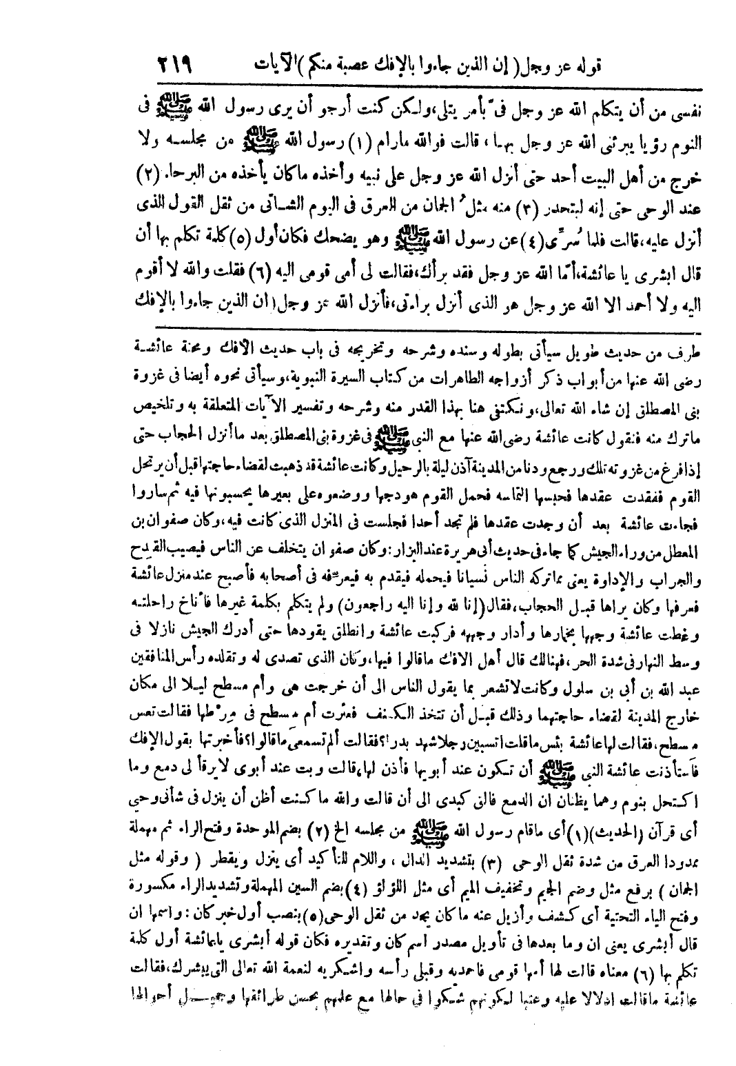 طرف من حديث طويل سياي بطوله وسنده وشرحه وتخريجه في باب حديث الإفك ومحنة عائشة رضي الله عنها من أبواب ذكر ازواجه الطاهرات من كتاب السيرة النبوية، وسيأتي نحوه أيضًا في غزوة بني المطصلف إن شاء الله تعالى، ونكتفي هنا بهذا القدر منه وشرحه وتفسير الآيات المتعلقة به وتلخيص ما ترك منه فنقول كانت عائشة رضي الله عنها مع النبي صلى الله عليه وسلم في غزوة بني المصطلق بعد ما أنزل الحجاب حتى إذا فرغ من غزوته تلك ورجع ودنا من المدينة آذن ليلة بالرحيل وكانت عائشة قد ذهبت بقضاء حاجتها قبل أن يرتحل القوم ففقدت عقدها فحسها التماسه فحمل القوم هو دجها ووضعوه على بعيرها يحسبونها فيه ثم ساروا فجاءت عائشة بعد أن وجدت عقدها فلم تجد أحدًا فجلست في المنزل الذي كانت فيه، وكان صفوان بن المعطل من وراء الجيش كما جاء في حديث أبي هريرة عند البزار: وكان صفوان أن يتخلف عن الناس فيصيب القدح والجراب والإدارة يعني مما تركه الناس نسيانًا فيحمله فيقدم به فيعرفه في أصحاب فأصبح عند منزل عائشة فعرفها وكان يراها قبل الحجات، فقال (إن الله وإنا إليه راجعون) ولم يتكلم كلمة غيرها فأناخ راحته وغطت عائشة وجهها بخمارها وأدار وجهه فركبت عائشة وانطلق يقودها حتى أدرك الجيش نازلًا في وسط النهار في شدة الحر، فهناك قال أهل الإفك ما قالوا فيها، وكان الذي تصدى له وتقده رأس المنافقين عبد الله بن أبي سلول وكانت لا تشعر بما يقول الناس إلى أن خرجت هي وأم مسطح ليلًا إلى مكان خارج المدينة لقضاء حاجتهما وذلك قبل أن تتخذ الكنف فعئرت أم مسطح في مرئها فقالت تعس مسطح، فقالت لها عائشة بئس ما قلت أتسبين رجلًا شهد در!؟ فقالت أم تسمعي ما قالوا؟ فأخبرتها بقول الإفك فاستأذنت عائشة النبي صلى الله عليه وسلم أن تكون عند أبويها فأذن لها، قالت وبت عند أوي لا يرقأ لي دمع وما اكتحل بنوم وهما يظنان أن الدمع فالق كبدي إلى أن قالت والله ما كنت أظن أن ينز في شأني وحي أي قرآن (الحديث) (1) أي ما قام سول الله صلى الله عيه وسلم من مجلسه الخ (2) بضم الموحدة وفتح الراء ثم مهملة ممدودا العرق من ضدة ثقل الوحي (3) بتشديد الدال، واللام للتأكيد أي ينز ويقطر (وقوله مثل الجمان) برفع مثل وضم الجيم وتخفيف الميم أي مثل اللؤلؤ (4) بضم السين المهملة وتشديد الراء مكسورة وفتح الياء التحتية أي كشف وأزيل عنه ما كان يحمد من ثقل الوحي (5) نصب أول خ كان: وأسمها أن قال أبشري يعني أن وما بعدها في تأويل مصدر أسم كان وتقديره فكان قوله أبشري يا عائشة أول كلمة تكلم بها (6) معناه قالت لها أمنها قومي فاحمديه وقبلي رأسه وأشكريه نعمة الله تعالى التي يبشرك، فقالت عائشة ما قالت أدلالا عليه وعتًا لكونهم شكوا في حالها مع علمهم حسن طرائفها وجميل أحوالها
