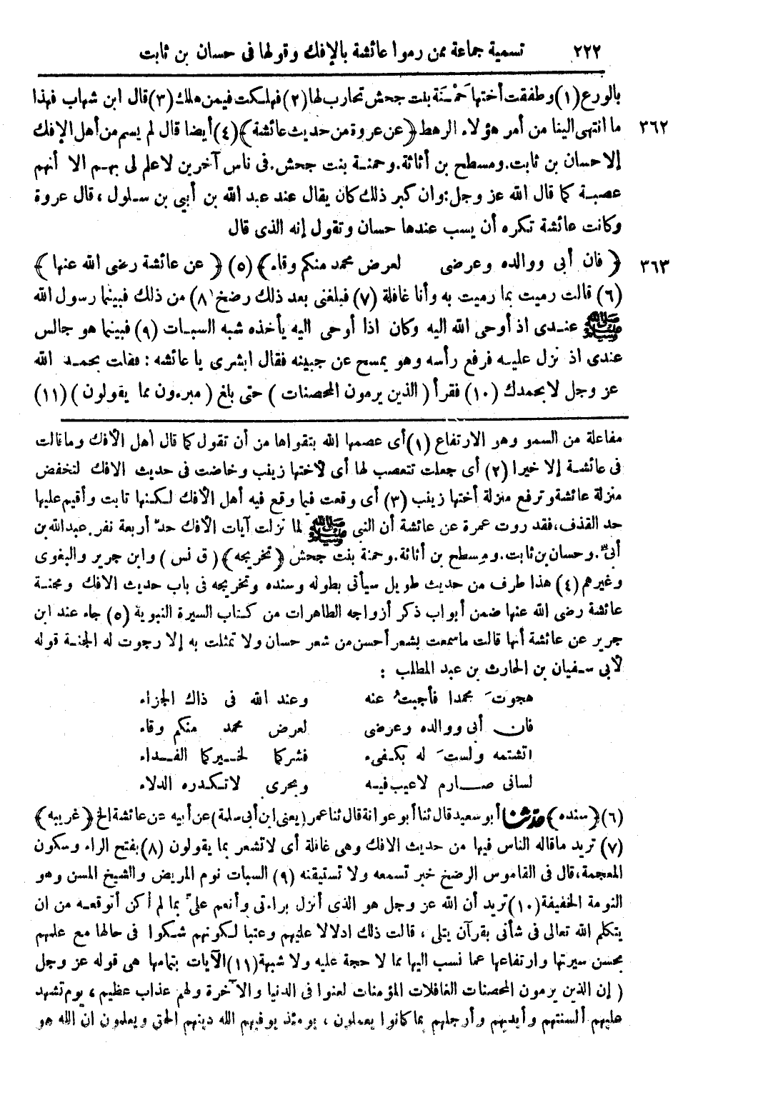 مفاعلة من السمو وهو الارتفاع (1) أي عصمها الله بتقواها من أن تقول كما قال أهل الإفك وما قالت في عائشة إلا خيرًا (2) أي جعت تتعصب لها أي لأختها زين وخاضت في حديث الإفك لتخفض منزلة عائشة وترفع منزلة أختها زينب (3) أي وقعت فيما وقع أهل الإفك لكنها تابت وأقيم عليها حد القذف، فقد روت عمرة عن عائشة أن النبس صلى الله عليه وسلم ما نزلت آيات الإفك حدّ أربعة نفر عد الله بن أبيَّ. وحسان ن ثابت. ومسح بن أثاثة. وحمنة بنت جحش (تخرجيه) (ق نس) وابن جرير والغوي وغيرهم (4) هذا طرف من حديث طويل سيأتي بطوله وسنده وتخريجه في باب حديث الإفك ومحنة عائشة رضي الله عنها ضمن أبواب ذكر أزواجه الطاهرات من كتاب السيرة النبوية (5) جاء عند أن جرير عن عائشة أنها قات ما سمعت بشعر أحسن من شعر حسان ولا تمثلت به إلا رجوت له الجنة قوله لآبي سفيان بن الحارث بن عبد المطلب: