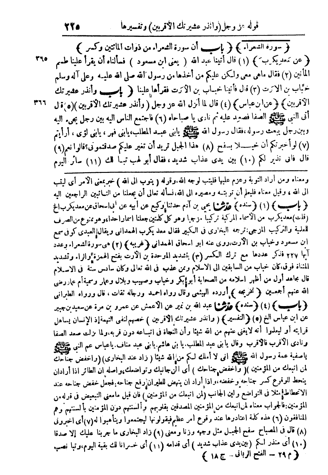 (عن مَعدِ كربَ) (1) قال أتينا عبد الله (يعني ابن مسعود) فسألنا أن يقرأ علينا طسم المأنين (2) فقال ما هي معى ولكن عليكم من أخذها من رسول الله صلى الله عليه وسلم وعلى آله وسلم خبَّاب بن الارت (3) قال فأتينا خباب بن الأرت فقرأها علينا (باب وأذنر عشيرتك الأقربين) (عن ابن عباس) (4) قال لما أنزل الله عز وجل (وأنذر عشيرتك الأقربين) (5) قال أتى النبي صلى الله عليه وسلم الصفا فصعد عليه ثم نادى يا صباحاه (6) فاجتمع الناس إليه بين رجل يجيء إليه وبين رجل يبعث رسوله، فقال رسول الله صلى الله عليه وسلم يا بني عبد المطلب، يا بني فهر، يا بني لؤي، أرأيتم (7) لو أخبرتكم أن خيلًا بسفح (8) هذا الجبل تريد أن تغير عليكم صدقتموني؟ قالوا نعم (9) قال فإني نذير لكم (10) بين يدي عذاب شديد، فقال أبو لهب تبا لك (11) سائر اليوم