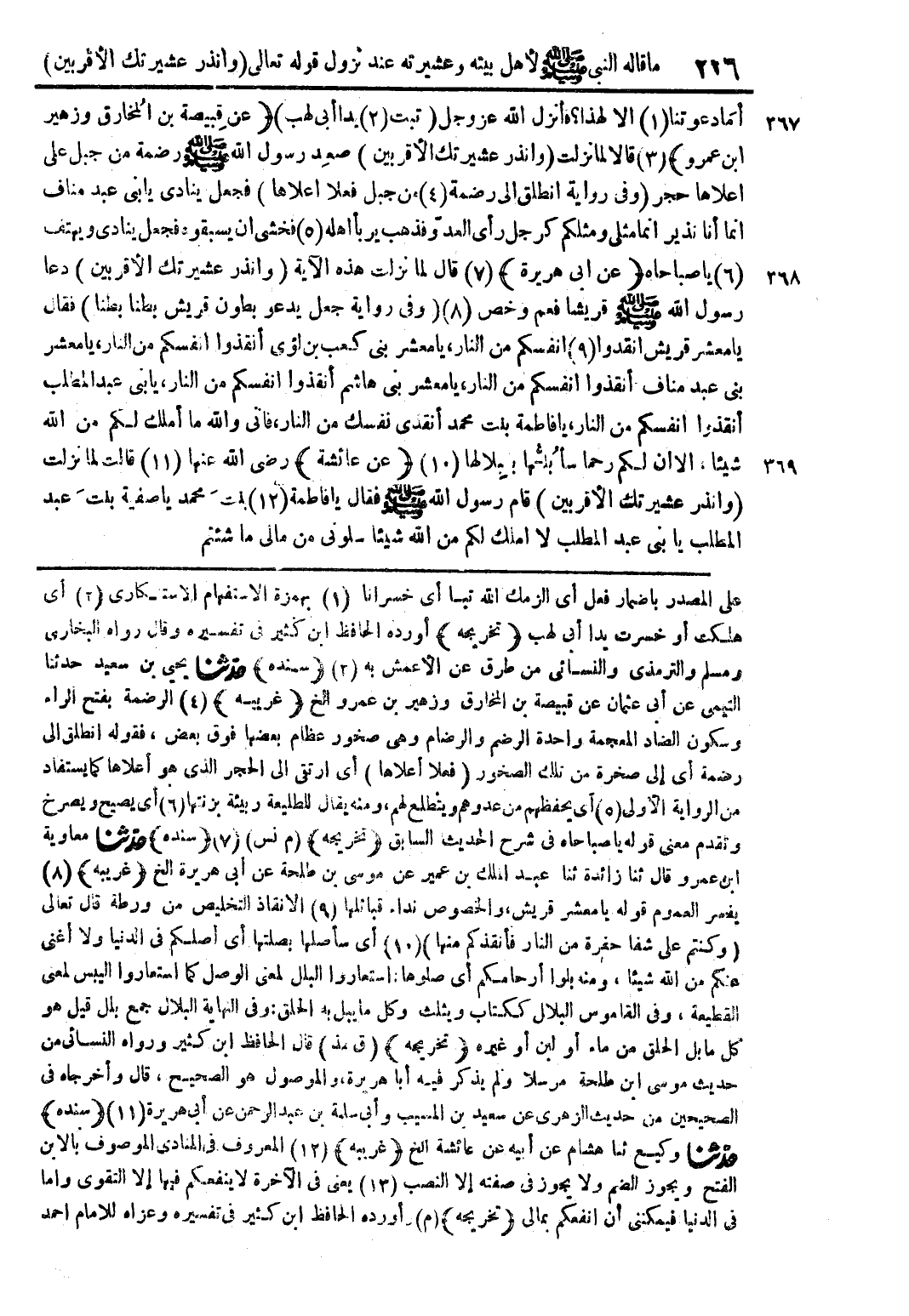 أما دعوتنا (1) الا لهذا؟ وأنزل الله عز وجل {تبت (2) يدا أبي لهب} (عن قبيصة بن المخارق وزهير ابن عمرو) (3) قالا لما نزلت {وأنذر عشيرتك الأقربين} صعد رسول الله (صلى الله عليه وسلم) رضمة من جبل على أعلاها حجر (وفي رواية انطلق إلى رضمة (4) من جبل فعلا أعلاها) فجعل ينادى يابنى عبد مناف انما أنا نذير انما مثلى ومثلكم كرجل رأى العدّو فذهب يربأ أهله (5) فخشى أن يسبقوه فجعل ينادى ويهتف 368 (6) يا صباحاه (عن ابى هريرة) (7) قال لما نزلت هذه الآية {وأنذر عشيرتك الأقربين) دعا رسول الله (صلى الله عليه وسلم) قريشًا فعم وخص (8) (وفي رواية جعل يدعو بطون قريش بطنًا بطنًا) فقال يا معشر قريش انقذوا (9) انفسكم من النار، يا معشر بنى كعب بن لؤى أنقذوا أنفسكم من النار، يا معشر بنى عبد مناغ أنقذوا أنفسكم من النار، يا معشر بنى هاشم أنقذوا أنفسكم من النار، يا بنى عبد المطلب أنقذوا أنفسكم من النار، يا فاطمة بنت محمد أنقذي نفسك من النار، فانى والله ما أملك لكم من الله 369 شيئًا، الا ان لمن رحما سأبلُّها ببلالها (10) (عن عائشة) (رضي الله عنها) (11) قالت لما نزلت (وأنذر عشيرتك الأقربين) قام رسول الله (صلى الله عليه وسلم) فقال يا فاطمة (12) بنت محمد يا صفية بنت عبد المطلب يا بنى عبد المطلب لا أملك لكم من الله شيئًا سلوني من مالي ما شئتم