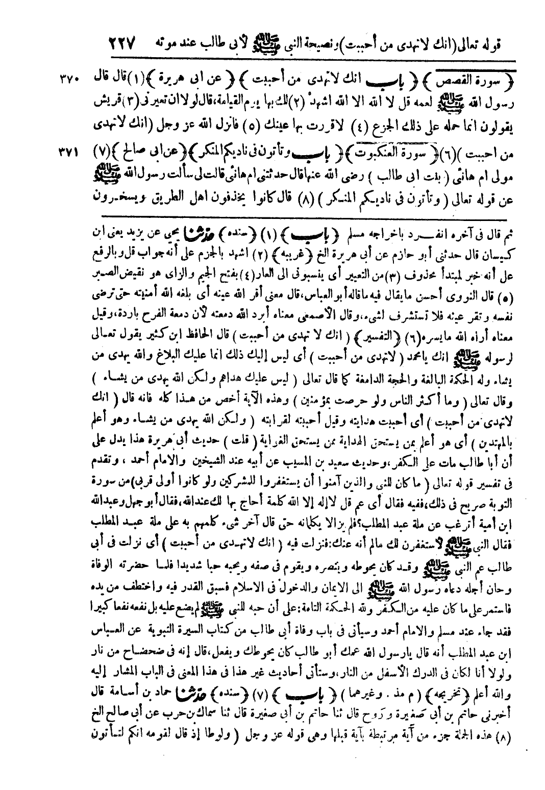 (سورة القصص) (باب انك لا تهدى من أحببت) (عن ابى هريرة) (1) قال قال 370 رسول الله (صلى الله عليه وسلم) لعمه قل لا اله الا الله اشهد (2) لك بها يوم القيامة، قال لولا ان تعيرنى (3) قريش يقولون انما حمله على ذلك الجزع (4) لا قررت بها عينك (5) فانزل الله عز وجل {انك لا تهدى من احببت} (6) (سورة العنكبوت) (باب وتأتون في ناديكم المنكر) (عن ابى صالح) (7) 371 مولى ام هانى (بنت ابى طالب) (رضى الله عنها) قال حدثنى ام هانى قالت لى سألت رسول الله (صلى الله عليه وسلم) عن قوله تعالى {وتأتون فى ناديكم المنكر} (8) قال كانوا يخذفون أهل الطريق ويسخرون