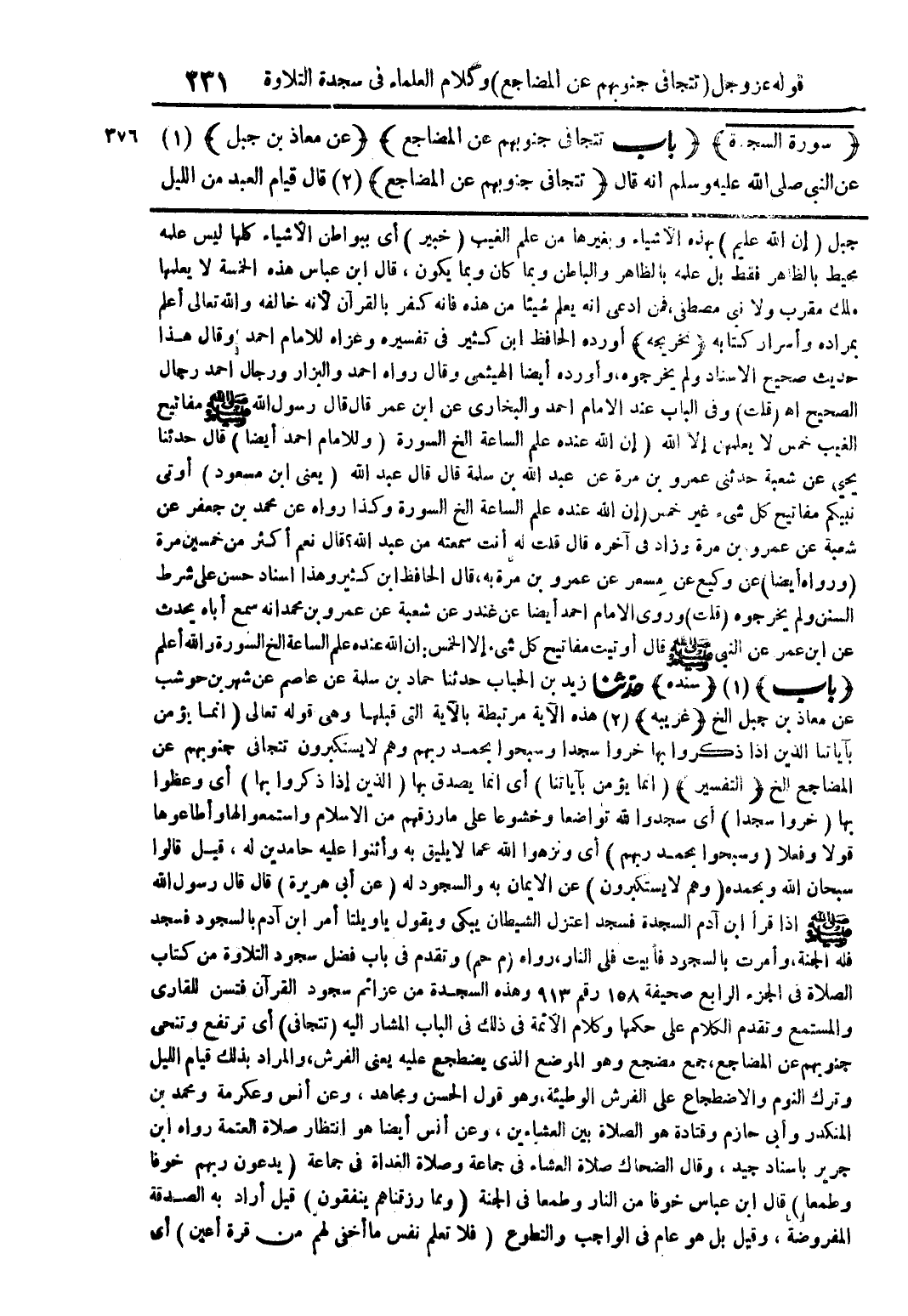 (سورة السجدة) (باب تتجافى جنوبهم عن المضاجع) (عن معاذ بن جبل) (1) 376 عن النبى صلى الله عليه وسلم انه قال {تتجافى جنوبهم عن المضاجع} (2) قال قيام العبد من الليل