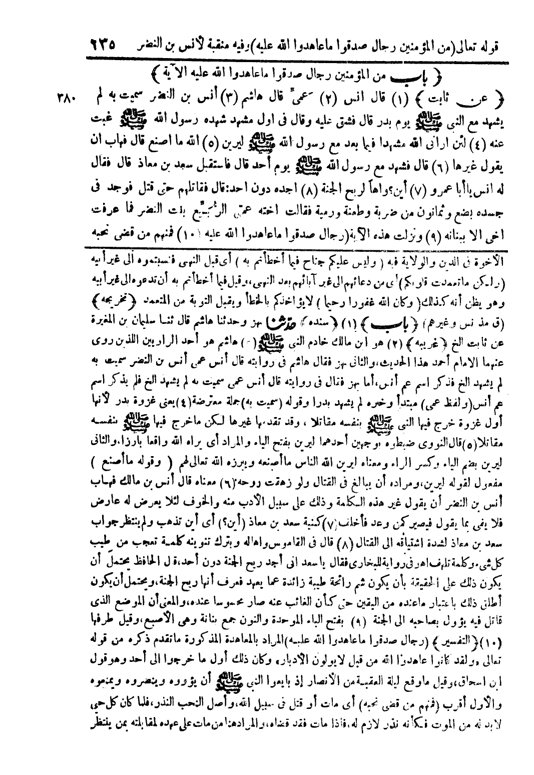(عن ثابت) (1) قال انس (2) عمىِّ قال هاشم (3) أنس بن النضر سميت به لم 380 يشهد مع النبى (صلى الله عليه وسلم) يوم بدر قال فشق عليه وقال فى اول مشهد شهده رسول الله (صلى الله عليه وسلم) غبت عنه (4) لئن ارانى الله مشهدا فيما بعد مع رسول الله (صلى الله عليه وسلم) ليرين (5) الله ما اصنع قال فهاب ان يقول غيرها (6) قال فشهد مع رسول الله (صلى الله عليه وسلم) يوم أحد قال فاستقبل سعد بن معاذ قال فقال له انس يا أبا عمرو (7) أين؟ واهًا لريح الجنة (8) اجده دون احد: قال فقاتلهم حتى قتل فوجد فى جسده بضع وثمانون من ضربة وطعنة ورمية فقالت أخته عمتى الرُّبيِّع بنت النضر فما عرفت اخى الا ببنانه (9) ونزلت هذه الآية {رجال صدقوا ما عاهدوا الله عليه (10)} فمنهم من قضى نحبه