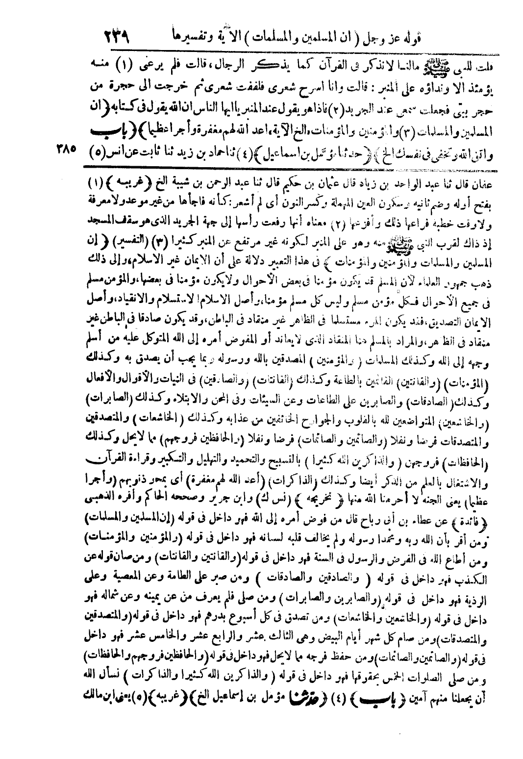 عثمان قال ثنا عبد الواحد بن زياد قال عثمان بن حكيم قال ثنا عبد الرحمن بن شيبة الخ (غريبه) (1) بفتح أوله وضم ثانيه وسكون العين المهملة وكسر النون أى لم أشعر: كأنه فاجأها من غير موعد ولا معررفة ولا وقت خطبه فراعها ذلك وأفزعها (2) معناه أنها رفعت رأسها الى جهة الجريد الذى هو سقف المسجد إذ ذاك لقرب النبى (صلى الله عليه وسلم) وهو على المنبر لكونه غير مرتفع عن المنبر كثيرا (3) (التفسير) {إن المسلمين والمسلمات والمؤمنين والمؤمنات} فى هذا التعبير دلالة على أن الايمان غير الاسلام، والى ذلك ذهب جمهور العلماء لأن المسلم قد يكون مؤمنا فى بعض الأحوال ولا يكون مؤمنا فى بعضها، والمؤمن مسلم فى جميع الأحوال فكل مؤمن مسلم وليس كل مسلم مؤمنا، وأصل الاسلام الاستسلام والانقياد، وأصل الايمان التصديق، فقد يكون المرء مستسلما فى الظاهر غير منقاد فى الباطن، وقد يكون صادقا فى الباطن غير منقاد فى الظاهر، والمراد بالمسلم هنا المنقاد الذى لا يعاند أو المفوض أمره إلى الله المتوكل عليه من أسلم وجهه إلى الله وكذلك المسلمات (والمؤمنين) المصدقين بالله ورسوله وبما يجب أن يصدق به وكذلك (المؤمنات) (والقانتين) القائمين بالطاعة وكذلك (القانتات) (والصادقين) فى النيات والأقوال والأفعال وكذلك (الصادقات) والصابرين على الطاعات وعن السيئات وفى المحن والابتلاء وكذلك (الصابرات) (والخاشعين) المتواضعين لله بالقلوب والجوارح الخائفين من عذابه وكذلك (الخاشعات) والمتصدقين والمتصدقات فرضا ونفلا (والصائمين والصائمات) فرضا ونفلا (والحافظين فروجهم) مما لا يحل وكذلك (الحافظات) فروجهن (والذاكرين الله كثيرا) بالتسبيح والتحميد والتهليل والتكبير وقراءة القرآن والاشتغال بالعلم من الذكر ايضا وكذلك (الذاكرات) (أعد الله لهم مغفرة) أى بمحو ذنوبهم (وأجرا عظيما) يعنى الجنة لا أحرمنا الله منها (تخريجه) (نس ك) وابن جرير وصححه الحاكم وأقره الذهبى (فائدة) عن عطاء بن ابى رباح قال من فورض أمره إلى الله فهو داخل فى قوله (إن المسلمين والمسلمات) ومن أقر بأن الله ربه ومحمدا رسوله ولم يخالف قلبه لسانه فهو داخل فى قوله (والمؤمنين والمؤمنات) ومن أطاع الله فى الفرض والرسول فى السنة فهو داخل فى قوله (والقانتين والقانتات) ومن صان قوله عن الكذب فهو داخل فى قوله (والصادقين والصادقات) ومن صبر على الطاعة وعن المعصية وعلى الرذية فهو داخل فى قوله (والصابرين والصابرات) ومن صلى فلم يعرف من عن يمينه وعن شماله فهو داخل فى قوله (والخاشعين والخاشعات) ومن تصدق فى كل أسبوع بدرهم فهو داخل فى قوله (والمتصدقين والمتصدقات) ومن صام ل شهر أيام البيض وهى الثالث عشر والرابع عشر والخامس عشر فهو داخل فى قوله (والصائمين والصائمات) ومن حفظ فرجه مما لا يحل فهو داخل فى قوله (والحافظين فروجهم والحافظات) ومن صلى الصلوات الخمس بحقوقها فهو داخل فى قوله (والذاكرين الله كثيرا والذاكرات) نسأل الله أن يجعلنا منهم آمين (باب) (4) (حدثنا مؤمل بن إسماعيل الخ) (غريبه) (5) (يعني ابن مالك