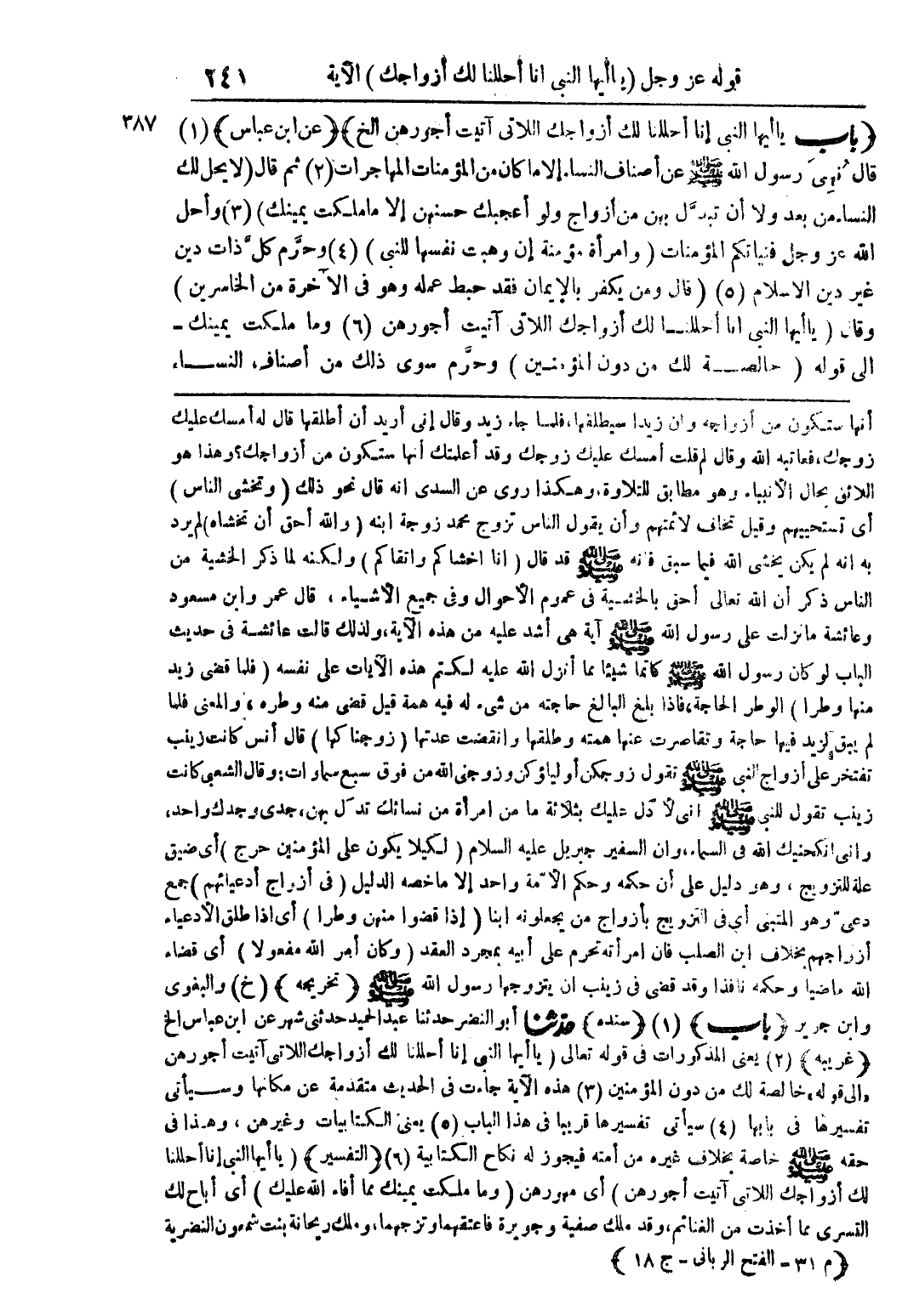 (باب يا أيها النبى إنا أحللنا لك أزواجك اللاتي آتيت أجورهن الخ) (عن ابن عباس) (1) قال نهى رسول الله (صلى الله عليه وسلم) عن أصناف النساء إلا ما كان من المؤمنات المهاجرات (2) ثم قال (لا يحل لك النساء من بعد ولا أن تبدل بهن من أزواج ولو أعجبك حسنهن إلا ما ملكت يمينك) (3) وأحل الله عز وجل فتياتكم المؤمنات (وامرأة مؤمنة إن وهبت نفسها للنبى) (4) وحرم كل ذات دين غير دين الاسلام (5) (قال ومن يكفر بالايمان فقد حبط عمله وهو فى الآخرة من الخاسرين) وقال (يا أيها النبى إنا أحللنا لك أوزاجك اللاتى آتيت أجورهن (6) وما ملكت يمينك -الى قوله (خالصة لك من دون المؤمنين) وحرم سوى ذلك من أصناف النساء