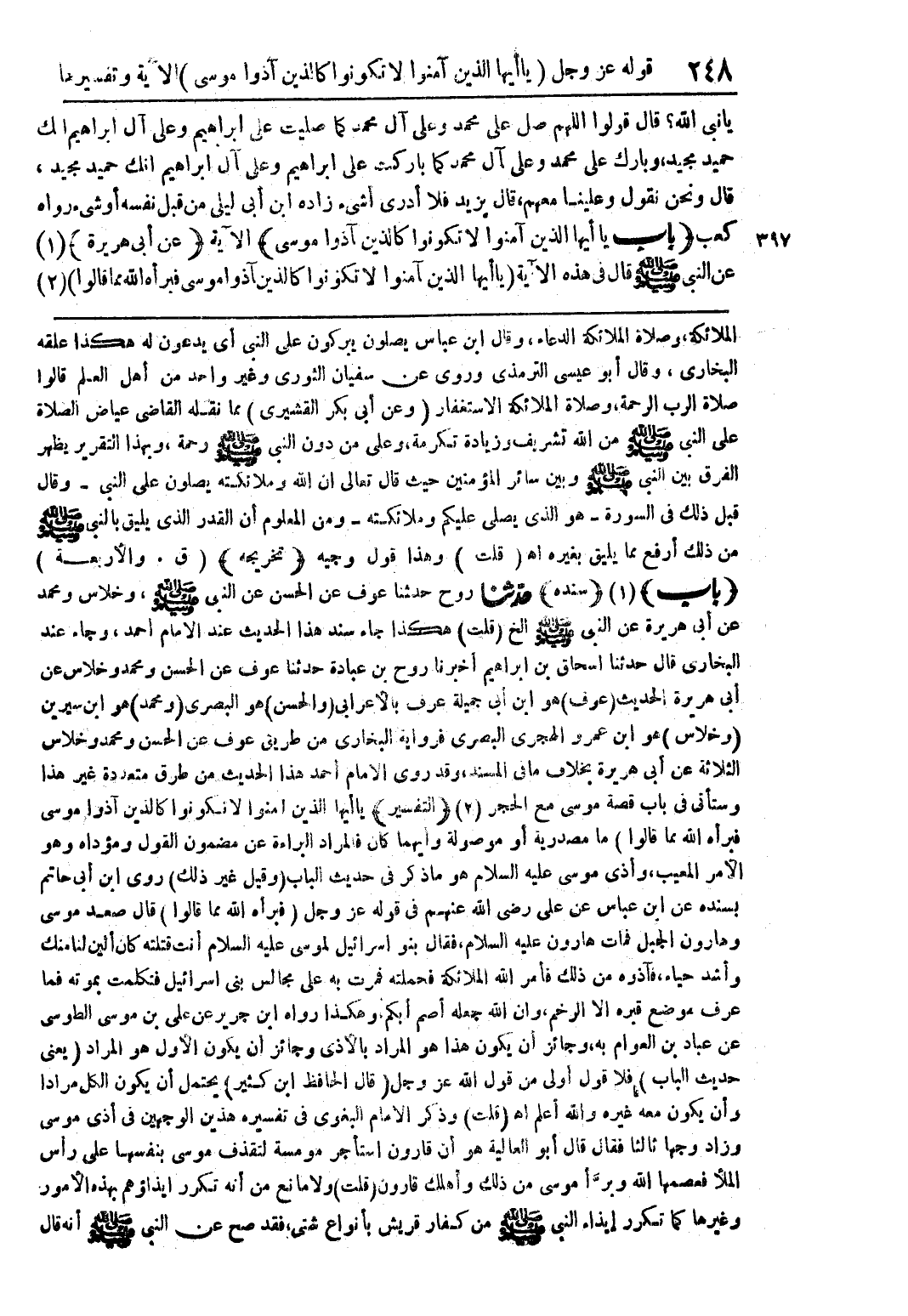 يا نبي الله؟ قال قولوا اللهم صل على محمد وعلى آل محمد كما صليت على ابراهيم وعلى آل ابراهيم انك حميد مجيد، وبارك على محمد وعلى آل محمد كما باركت على ابراهيم وعلى آل ابراهيم انك حميد مجيد، قال ونحن نقول وعلينا معهم، قال يزيد فلا ادري أشيء زاده ابن ابي ليلى من قبل نفسه أو شيء رواه كعب (باب يا ايها الذين آمنوا لا تكونوا كالذين آذوا موسى) الآية (عن أبي هريرة) (1) عن النبي صلى الله عليه وسلم قال في هذه الآية {يا أيها الذين آمنوا لا تكونوا كالذين آذوا موسى فبرأه الله مما قالوا} (2)