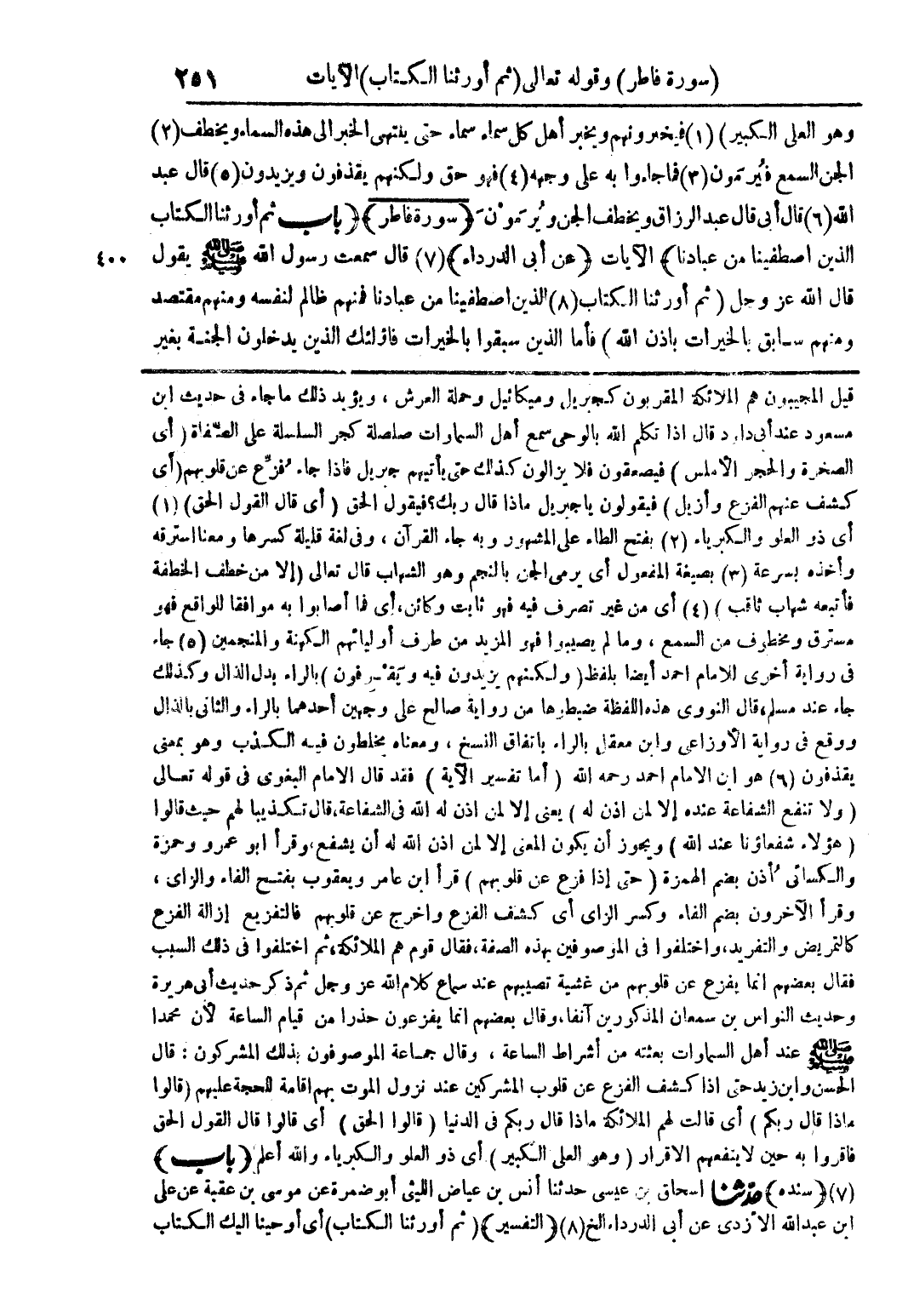 قيل المجيبون هم الملائكة المقربون كجبريل وميكائيل وحملة العرش، ويؤيد ذلك ما جاء في حديث ابن مسعود عند أبى داود قال اذا تكلم الله بالوحى سمع أهل السماوات صلصلة كجر السلسلة على الصفاة (أى الصخرة والحجر الأملس) فيصعقون فلا يزالون كذلك حتى يأتيهم جبريل فاذا جاء فزع عن قلوبهم (أى كشف عنهم الفزع وأزيل) فيقولون يا جبريل ماذاقال ربك؟ فيقول الحق (أى قال القول الحق) (1) أى ذو العلو والكبرياء (2) بفتح الطاء على المشهور وبه جاء القرآن، وفي لغةٍ قليلةٍ كسرها ومعنا استرقه وأخذه بسرعة (3) بصيغة المفعول أى يرمى الجن بالنجم وهو الشهاب قال تعالى {إلا من خطف الخطفة فأتبعه شهاب ثاقب} (4) أى من غير تصرفٍ فيه فهو ثابت وكائن، أى فما أصابوا به موافقًا للواقع فهو مسترق ومخطوف من السمع، وما لم يصيبوا فهو المزيد من طرف أوليائهم الكهنة والمنجمين (5) جاء في روايةٍ أخرى للامام احمد أيضًا بلفظ (ولكنهم يزيدون فيه ويقرفون) بالراء بدل الذال وكذلك جاء عند مسلم، قال النووى هذه اللفظة ضبطوها من رواية صالح على وجهين أحدهما بالراء والثانى بالذال ووقع في رواية الأوزاعى وابن معقل بالراء باتفاق النسخ، ومعناه يخلطون فيه الكذب وهو بمعنى يقذفون (6) هو ابن الامام احمد رحمه الله (أما تفسير الآية) فقد قال الامام البغوى في قوله تعالى {ولا تنفع الشفاعة عنده إلا لمن اذن له} يعنى إلا لمن اذن له الله في الشفاعة، قال تكذيبًا لهم حيث قالوا (هؤلاء شفعاؤنا عند الله) ويجوز أن يكون المعنى إلا لمن اذن الله له أن يشفع، وقرأ ابو عمرو وحمزة والكسائي أذن بضم الهمزة (حتى إذا فزع عن قلوبهم) قرأ ابن عامر ويعقوب بفتح الفاء والزاى، وقرأ الآخرون بضم الفاء وكسر الزاى أي كشف الفزع واخرج عن قلوبهم فالتفزيع إزالة الفزع كالتمريض والتفريد، واختلفوا في الموصوفين بهذه الصفة، فقال قوم هم الملائكة، ثم اختلفوا في ذلك السبب فقال بعضهم انما يفزع عن قلوبهم من غشيةٍ تصيبهم عند سماع كلام الله عز وجل ثم ذكر حديث أبى هريرة وحديث النواس بن سمعان المذكورين آنفًا، وقال بعضهم انما يفزعون حذرًا من قيام الساعة لأن محمدًا صلى الله عليه وسلم عند أهل السماوات بعثته من أشراط الساعة، وقال جماعة الموصوفون بذلك المشركون: قال الحسن وابن زيد حتى اذا كشف الفزع عن قلوب المشركين عند نزول الموت بهم اقامةً للحجة عليهم {قالوا ماذا قال ربكم} أي قالت الملائكة لهم ماذا قال ربكم فى الدنيا {قالوا الحق} أى قالوا قال القول الحق فاقروا به حين لا ينفهم الاقرار {وهو العلي الكبير} أى ذو العلو والكبرياء والله أعلم (باب) (7) (سنده) حدثنا اسحاق بن عيسى حدثنا أنس بن عياض الليثى أبو ضمرة عن موسى بن عقبة عن على ابن عبد الله الأزدى عن أبى الدرداء الخ (8) (التفسير) {ثم أورثنا الكتاب} أي أوحينا إليك الكتاب