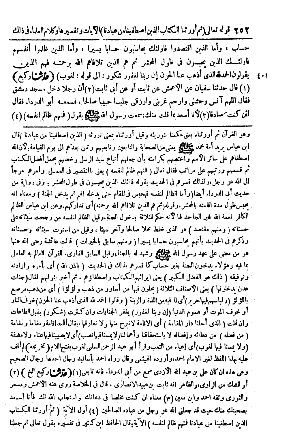 وهو القرآن ثم أورثناه يعنى حكمنا يتوريثه وقيل أورثناه بمعنى نورثه {الذين اصطفينا من عبادنا} قال ابن عباس يريد أمة محمد صلى الله عليه وسلم يعنى من الصحابة والتابعين وتابعيهم ومن بعدهم الى يوم القيامة: لأن الله اصطفاهم على سائر الأمم واختصهم بكرامته بأن جعلهم أتباع سيد الرسل وخصهم بحمل أفضل الكتب ثم قسمهم ورتبهم على مراتب فقال تعالى {فمنهم ظالم لنفسه} يعنى بالتقصير في العمل وأمرهم مرجأ الى الله عز وجل، ولذلك فسرهم في الحديث بقوله فاولئك الذين يحبسون في طول المحشر: وفي رواية من حديث أبى الدرداء أيضًا (وأما الظالم لنفسه فيحبس في المقام حتى يدخله الهم ثم يدخل الجنة) ومعناه انه يحبس طول مدة اقامته بالمحشر، وقوله (ثم هم الذين تلافاهم الله برحمته) أي تداركهم. وعن ابن عباس الظالم الكافر نعمة الله غير الجاحد لها لأنه حكم للثلاثة بدخول الجنة، وقيل الظالم لنفسه من رجحت سيئاته على حسناته {ومنهم مقتصد} هو الذي خلط عملًا صالحًا وآخر سيئًا، وقيل من استوت سيئاته وحسناته وذكرهم في الحديث بأنهم يحاسبون حسابًا يسيرًا {ومنهم سابق بالخيرات} قالت عائشة رضى الله عنها هو من معنى على عهد رسول الله صلى الله عليه وسلم وشهد له بالجنة، وقيل السابق القارئ للقرآن العالم به العامل بما فيه وهؤلاء يدخلون الجنة بغير حساب كما فسرهم بذلك في الحديث (باذن الله) أى بأمره وارادته وتوفيقه {ذلك هو الفضل الكبير} يعنى ايرائهم الكتاب واصطفاؤهم، ثم أخبر بثوابهم فقال {جنات عدنٍ يدخلونها} يعنى الأصناف الثلاثة {يحلون فيها من أساور من ذهبٍ ولؤلؤًا} أى من ذهبٍ مرصعٍ باللؤلؤ {ولباسهم فيها حرير} أى لما فيه من اللذة والزينة {وقالوا الحمد لله الذي أذهب عنا الحزن} خوف النار أو خوف الموت أو هموم الدنيا {إن ربنا لغفور} يغفر الجنايات وان كثرت {شكور} يقبل الطاعات وان قلت {الذي أحلنا دار المقامة} أى الاقامة لا نبرح منها ولا نفارقها، يقال أقمت اقامةً ومقامًا ومقامةً {من فضله} من عطائه وإفضاله ى باستحقاقنا وأعمالنا {لا يمسنا فيها نصب} أى لا يصيبنا فيها عناء ولا مشقة {ولا يمسنا فيها لغوب} أى إعياء من التعب وقرأ أبو عبد الرحمن السلمى لغوب بفتح اللام (تخريجه) لم أقف عليه بهذا اللفظ لغير الامام احمد، وأورده الهيثمى وقال رواه احمد بأسانيد رجال احدها رجال الصحيح وهي هذه ان كان على بن عبد الله الأزدى سمع من أبى الدرداء فانه تابعى (1) (حدثنا وكيع الخ) (2) أو للشك من الراوى، والظاهر انه ثابت بن عبيد الانصاري، قال في الخلاصة روى عنه الأعمش ومسعر والثوري وثقه احمد زابن معين (3) معناه ان كنت مخلصًا في دعائك واستجاب الله لك فأنا أسعد بصحبتك منك حيث قد جعلنى الله عز وجل من عباده الصالحين (4) أول الآية {ثم أورثنا الكتاب الذين اصطفينا من عبادنا فمنهم ظالم لنفسه} الآية: قال الحافظ ابن كثير في تفسيره يقول تعالى ثم جعلنا