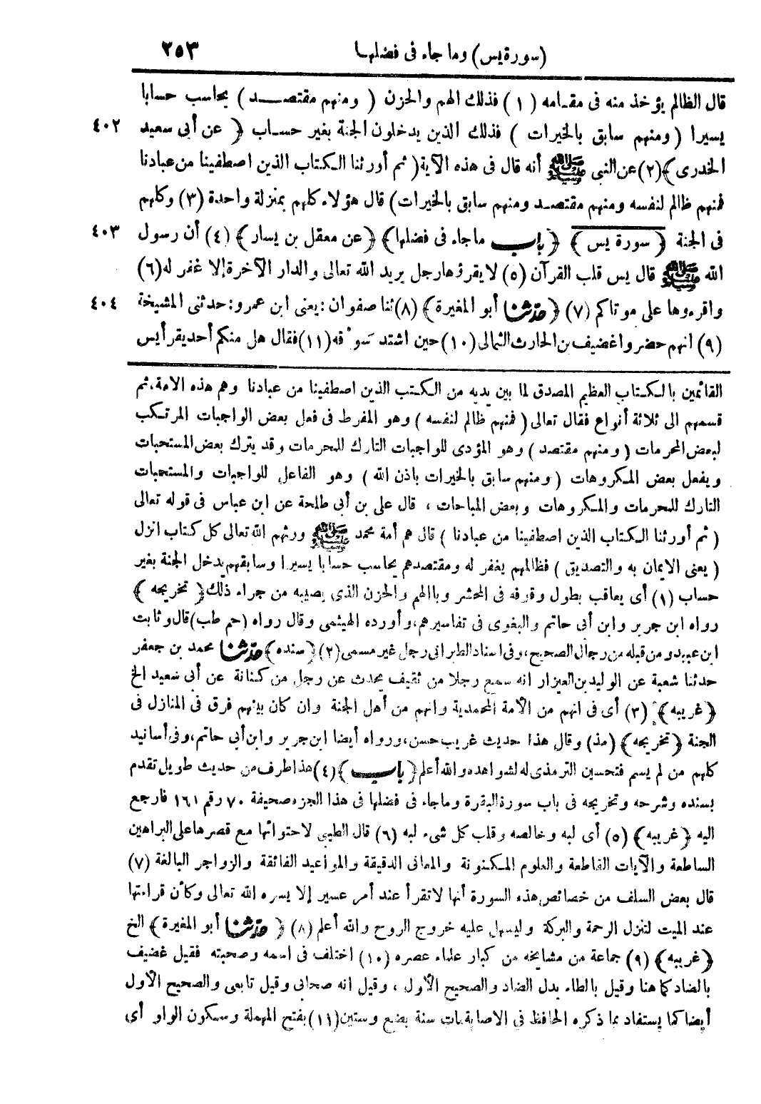 القائمين بالكتاب العظيم المصدق لما بين يديه من الكتب الذين اصطفينا من عبادنا وهم هذه الامة، ثم قسمهم على ثلاثة أنواعٍ فقال تعالى {فمنهم ظالم لنفسه} وهو المفرط في فعل الواجبات المرتكب لبعض المحرمات {ومنهم مقتصد} وهو المؤدى للواجبات التارك للمحرمات وقد يترك بعض المستحبات ويفعل بعض المكروهات {ومنهم سابق بالخيرات بإذن الله} وهو الفاعل للواجبات والمستحبات التارك للمحرمات والمكروهات وبعض المباحات، قال على بن أبى طلحة عن ابن عباسٍ في قوله تعالى {ثم أورثنا الكتاب الذين اصطفينا من عبادنا} قال هم أمة محمد صلى الله عليه وسلم ورثهم الله تعالى كل كتابٍ انزل (يعنى الايمان به والتصديق) فظالمهم يغفر له ومقتصدهم يحاسب حسابًا يسيرًا وسابقهم يدخل الجنة بغير حساب (1) أى يعاقب بطول وقوفه في المحشر وبالهم والحزن الذى يصيبه من جراء ذلك (تخريجه) رواه ابن جرير وابن أبى حاتم والبغوى في تفاسيرهم، وأورده الهيثمى وقال رواه (حم طب) قال وثابت ابن عبيد ومن قبله من رجال الصحيح، وفى اسناد الطبراني رجل غير مسمى (2) (سنده) حدثنا محمد بن جعفر حدثنا شعبة عن الوليدين العيزار انه سمع رجلًا من ثقيف يحدث عن رجلٍ من كنانة عن أبى سعيد الخ (غريبه) (3) أى في انهم من الأمة المحمدية وانهم من أهل الجنة وان كان بينهم فرق في المنازل فى الجنة (تخريجه) (مذ) وقال هذا حديث غريب حسن، ورواه أيضًا ابن جرير وابن أبى حاتم، وفي أسانيد كلهم من لم يسم فتحسين الترمذى له لشواهده والله أعلم (باب) (4) هذا طرف من حديثٍ طويل تقدم بسنده وشرحه وتخريجه في باب سورة البقرة وما جاء في فضلها في هذا الجزء صحيفة 70 رقم 161 فارجع اليه (غريبه) (5) أى لبه وخالصه وقلب كل شيء لبه (6) قال الطيبى لاحتوائها مع قصرها على البراهين الساطعة والآيات القاطعة والعلوم المكنونة والمعانى الدقيقة والمواعيد الفائقة والزواجر البالغة (7) قال بعض السلف من خصائص هذه السورة أنها لا تقرأ عند أمرٍ عسيرٍ إلا يسره الله وكأن قرائتها عند الميت لتنزل الرحمة والبركة وليسهل عليه خروج الروح والله أعلم (8) (حدثنا أبو المغيرة) الخ (غريبه) (9) جماعة من مشايخه من كبار علماء عصره (10) اختلف في اسمه وصحبته فقيل غضيف بالضاد كما هنا وقيل بالطاء بدل الضاد والصحيح الأول، وقيل انه صحابى وقيل تابعى والصحيح الأول أيضًا كما يستفاد مما ذكره الحافظ في الاصابة مات سنة بضع وستين (11) بفتح المهملة وسكون الواو أي