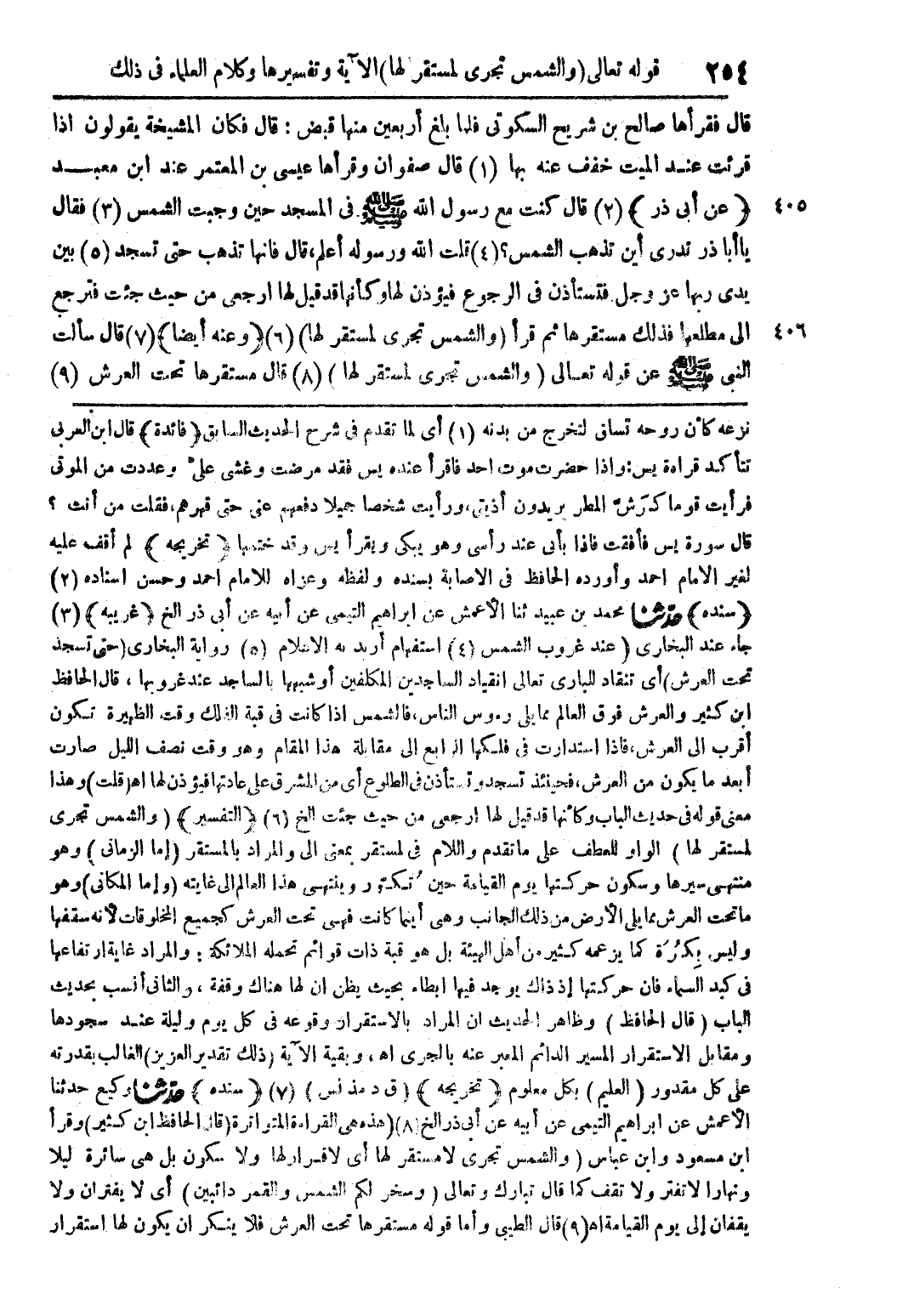 نزعه كأن روحه تساق لتخرج من بدنه (1) أى لما تقدم فى شرح الحديث السابق (فائدة) قال ابن العربى تتأكد قراءة يس: واذا حضرت موت أحد فاقرأ عنده يس فقد مرضت وغشى علىَّ وعددت من الموتى فرأيت قومًا كرشَّ المطر يريدون أذيتى، ورأيت شخصًا جميلًا دفعهم عنى حتى قهرهم، فقلت من أنت؟ قال سورة يس فأفقت فاذا بأبى عند رأسى وهو يبكى ويقرأ يس وقد ختمها (تخريجه) لم أقف عليه لغير الأمام احمد وأورده الحافظ فى الاصابة بسنده ولفظه وعزاه للامام احمد وحسن اسناده (2) (سنده) حدّثنا محمد بن عبيد ثنا الأعمش عن ابراهيم التيمى عن أبيه عن أبى ذر الخ (غريبه) (3) جاء عند البخارى (عند غروب الشمس (4) استفهام أريد به الابتلاء (5) رواية البخارى (حتى تسجد تحت العرش) أى تنقاد للبارى تعالى انقياد الساجدين المكلفين أو شبهها بالساجد عند غروبها، قال الحافظ ابن كثير والعرش فوق العالم مما يلى رءوس الناس، فالشمس اذا كانت فى قبة الفلك وقت الظهيرة تكون أقرب الى العرش، فاذا استدارت فى فلكها الرابع الى مقابلة هذا المقام وهو وقت نصف الليل صارت أبعد ما يكون من العرش، فحينئذ تسجد وتستأذن فى الطلوع أى من المشرق على عادتها فيؤذن لها اهـ (قلت) وهذا معنى قوله فى حديث الباب وكأنها قد قيل لها ارجعى من حيث جئت الخ (6) (التفسير) {والشمس تجرى لمستقر لها} الواو للعطف على ما تقدم واللام فى لمستقر بمعنى الى والمراد بالمستقر (إما الزمانى) وهو منتهى سيرها وسكون حركتها يوم القيامة حين تكور وينتهى هذا العالم الى غايته (وإما المكانى) وهو ما تحت العرش مما يلى الأرض من ذلك الجانب وهى أينما كانت فهى تحت العرش كجميع المخلوقات لأنه سقفها وليس بكرة كما يزعمه كثير من أهل الهيئة بل هو قبة ذات قوائم تحمله الملائكة: والمراد غاية ارتفاعها فى كبد السماء فان حركتها إذ ذاك يوجد فيها ابطاء بحيث يظن ان لها هناك وقفة، والثانى أنسب بحديث الباب (قال الحافظ) وظاهر الحديث ان المراد بالاستقرار وقوعه فى كل يوم وليلة عند سجودها ومقابل الاستقرار المسير الدائم المعبر عنه بالجرى اهـ، وبقية الآية {ذلك تقدير العزيز} الغالب بقدرته على كل مقدور (العليم) بكل معلوم (تخريجه) (ق د مذ نس) (7) (سنده) حدّثنا وكيع حدثنا الأعمش عن ابراهيم التيمى عن أبيه عن أبى ذر الخ (8) (هذه هى القراءة المتواترة (فان الحافظ ابن كثير) وقرأ ابن مسعود وابن عباس (والشمس تجرى لا نستقر لها أى لا فرار لها ولا سكون بل هى سائرة ليلًا ونهارًا لا تفتر ولا تقف كما قال تبارك وتعالى {وسخر لكم الشمس والقمر دائبين} أى لا يفتران ولا يقفان إلى يوم القيامة اهـ (9) قال الطيبى وأما قوله مستقرها تحت العرش فلا ينكر ان يكون لها استقرار