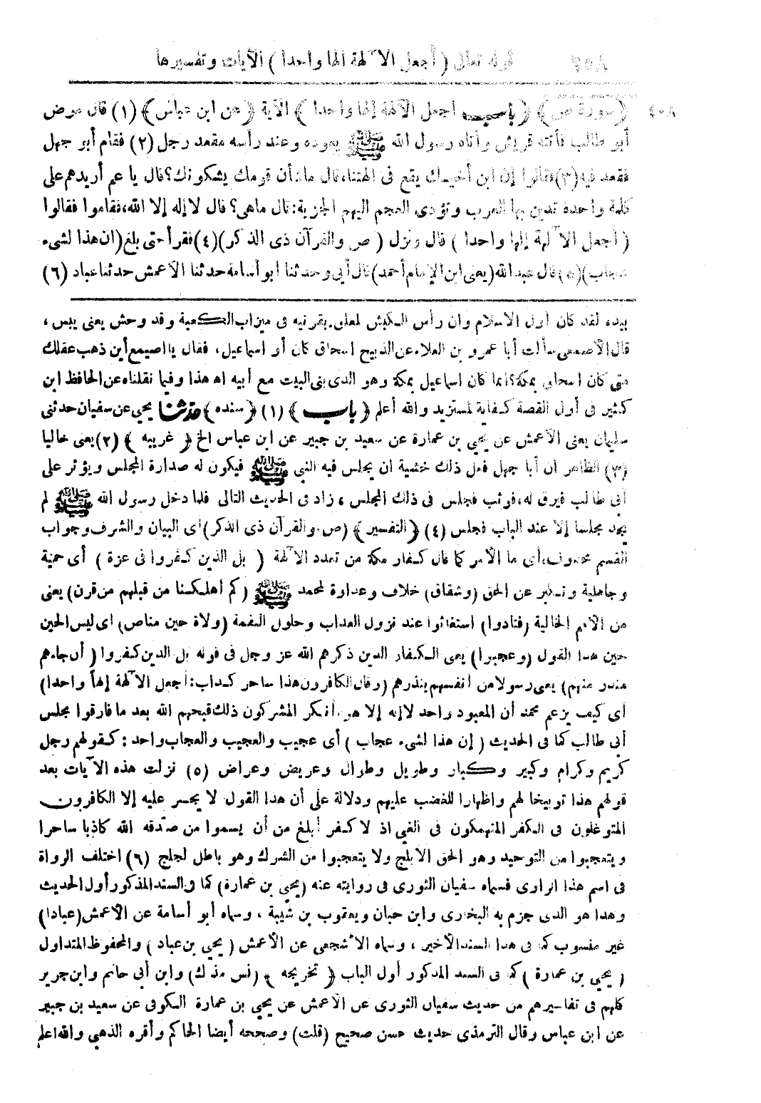(سورة ص) (باب اجعل الآلهة الهًا واحدًا) الآية (من ابن عباس) (1) قال مرض أبو طالب فأتته قريش وأتاه رسول الله صلى الله عليه وسلم يعوده وعند رأسه مقعد رجل (2) فقام أبو جهل فقعد فيه (3) فقالوا إن ابن أخيك يقع فى الهتنا، قال ما شأن قومك يشكونك؟ قال يا عم أريدهم على كلمة واحدة تدين بها العرب وتؤدى العجم اليهم الجزية: قال ما هى؟ قال لا إله إلا الله، فقاموا فقالوا {اجعل الآلهة الهًا واحدًا} قال ونزل (ص والقرآن ذى الذكر) (4) فقرأ حتى بلغ {ان هذا لشئ عجاب} (5) قال عبد الله (يعنى ابن الإمام أحمد) قال أبى وحدثنا ابو أسامة حدثنا الأعمش حدثنا عباد (6)