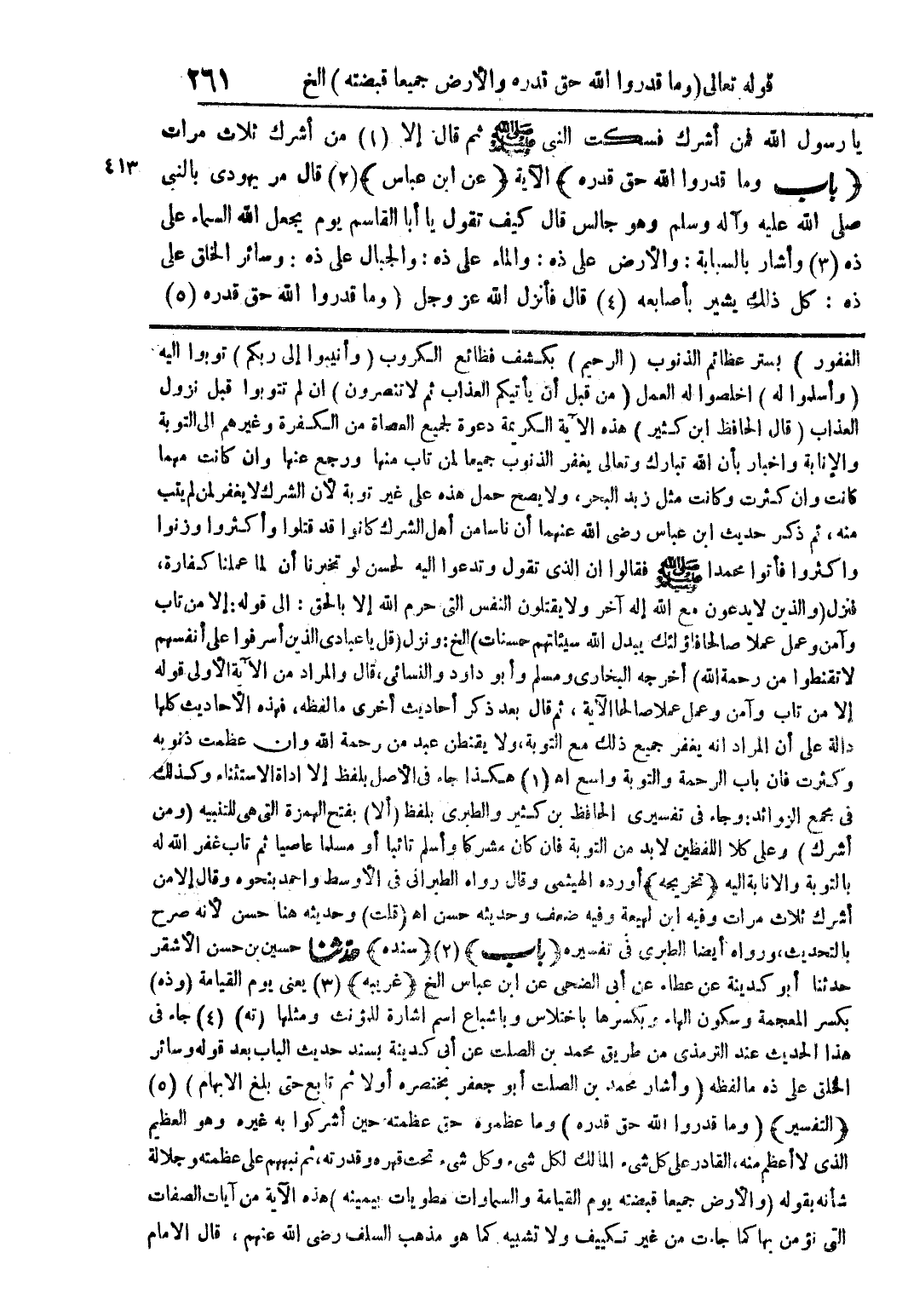 يا رسول الله فمن أشرك فسكت النبى صلى الله عليه وسلم ثم قال إلا (1) من أشرك ثلاث مرات (باب وما قدروا الله حق قدره) الآية (عن ابن عباس) (2) قال مر يهودى بالنبى صلى الله عليه وآله وسلم وهو جالس قال كيف تقول يا أبا القاسم يوم يجعل الله السماء على ذه (3) وأشار بالسبابة: والأرض على ذه: والماء على ذه: والجبال على ذه: وسائر الخلق على ذه: كل ذلك يشير بأصابعه (4) قال فأنزل الله عز وجل {وما قدروا الله حق قدره (5)