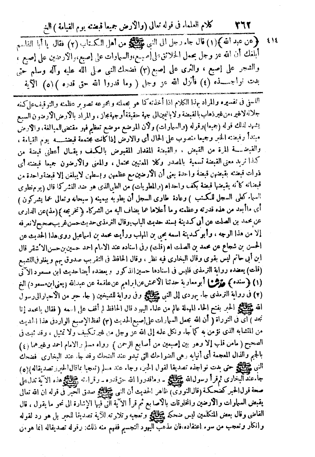 (عن عبد الله) (1) قال جاء رجل الى النبى صلى الله عليه وسلم من أهل الكتاب (2) فقال يا أبا القاسم أبلغك أن الله عز وجل يحمل الخلائق على إصبع، والسماوات على إصبع، والأرضين على إصبع، والشجر على إصبع، والثرى على إصبع (3) فضحك النبى صلى الله عليه وآله وسلم حتى بدت نواجذه (4) فأنزل الله عز وجل {وما قدروا الله حق قدره} (5) الآية