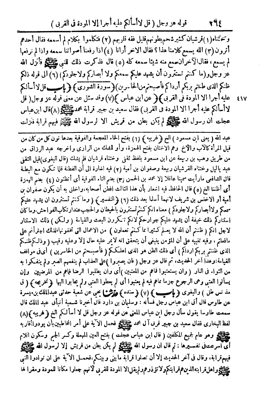 وختناه (1) قرشيان كثير شحم بطونهم قليل فقه قلوبهم (2) فتكلموا بكلام لم أسمعه فقال أحدهم أترون (3) الله يسمع كلامنا هذا؟ فقال الاخر أرانا (4) اذا رفعنا أصواتنا سمعه واذا لم نرفعها لم يسمع، فقال الآخر ان سمع منه شيئًا سمعه كله (5) قال فذكرت ذلك للنبى صلى الله عليه وسلم فأنزل الله عز وجل {وما كنتم تستترون أن يشهد عليكم سمعكم ولا أبصاركم ولا جلودكم} (6) الى قوله {ذلكم ظنكم الذى ظننتم بربكم أرداكم فأصبحتم من الخاسرين} (سورة الشورى) (باب قل لا أسألكم عليه أجرًا الا المودة فى القربى) (عن ابن عباس) (7) وقد سئل عن معنى قوله عز وجل {قل لا أسألكم عليه أجرًا الا المودة فى القربى} فقال سعيد بن جبير قرابة محمد رسول الله صلى الله عليه وسلم (8) قال ابن عباس عجلت ان رسول الله صلى الله عليه وسلم لم يكن بطن من قريش الا لرسول الله صلى الله عليه وسلم فيهم قرابة فنزلت