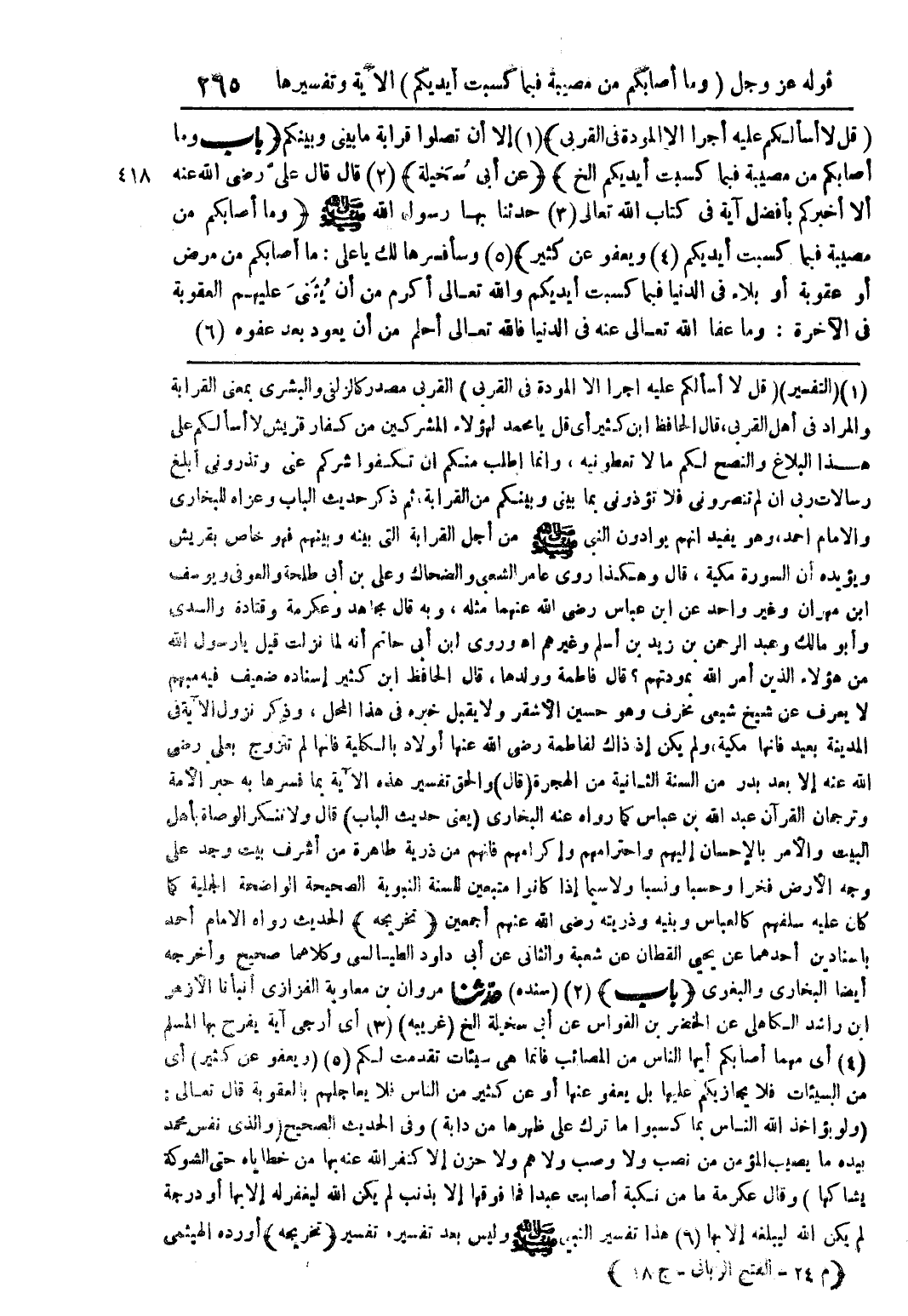 {قل لا أسألكم عليه أجرًا الا المودة فى القربى} (1) إلا أن تصلوا قرابة ما بينى وبينكم (باب وما أصابكم من مصيبة فبما كسبت أيديكم الخ) (عن أبى سخيلة) (2) قال قال علىّ رضى الله عنه ألا أخبركم بأفضل آية فى كتاب الله تعالى (3) حدثنا بها رسول الله صلى الله عليه وسلم {وما أصابكم من مصيبة فبما كسبت أيديكم (4) ويعفو عن كثير} (5) وسأفسرها لك يا على: ما أصابكم من مرض أو عقوبة أو بلاء فى الدنيا فبما كسبت أيديكم والله تعالى أكرم من أن يثنى عليهم العقوبة فى الآخرة: وما عفا الله تعالى عنه فى الدنيا فالله تعالى أحلم من أن يعود بعد عفوه (6)