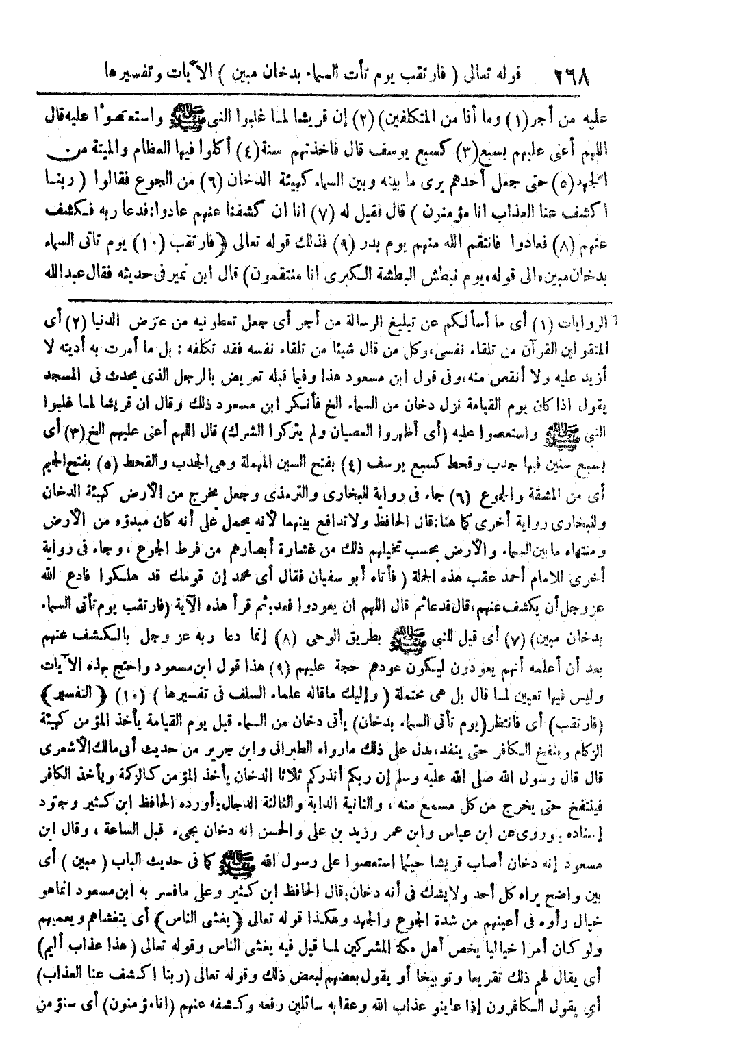 الروايات (1) أي ما أسألكم عن تبليغ الرسالة من أجر أى جعل تعطونيه من عرض الدنيا (2) أى المتقولين القرآن من تلقاء نفسى، وكل من قال شيئًا من تلقاء نفسه فقد تكلفه: بل ما أمرت به أديته لا أزيد عليه ولا أنقص منه، وفى قول ابن مسعود هذا وفيما قبله تعريض بالرجل الذى يحدث فى المسجد يقول اذا كان يوم القيامة نزل دخان من السماء الخ فأنكر ابن مسعود ذلك وقال ان قريشًا لما غلبوا النبى صلى الله عليه وسلم واستعصوا عليه (أى أظهروا العصيان ولم يتركوا الشرك) قال اللهم أعنى عليهم الخ (3) أى بسبع سنين فيها حدب وقحط كسبع يوسف (4) بفتح السين المهملة وهى الجدب والقحط (5) بفتح الجيم أى من المشقة والجوع (6) جاء فى رواية للبخارى والترمذى وجعل يخرج من الأرض كهيئة الدخان وللبخارى رواية أخرى كما هنا: قال الحافظ ولا تدافع بينهما لأنه يحمل على أنه كان مبدؤه من الأرض ومنتهاه ما بين السماء والأرض بحسب تخليهم ذلك من غشاوة أبصارهم من فرط الجوع، وجاء فى رواية أخرى للامام أحمد عقب هذه الجملة (فأتاه أبو سفيان فقال أى محمد إن قومك قد هلكوا فادع الله عز وجل أن يكشف عنهم، قال فدعائم قال اللهم ان يعودوا فعد: ثم قرأ هذه الآية {فارتقب يوم تأت السماء بدخان مبين} (7) أى قيل للنبى صلى الله عليه وسلم بطريق الوحى (8) إنما دعا ربه عز وجل بالكشف عنهم بعد أن أعلمه أنهم يعودون ليكون عودهم حجة عليهم (9) هذا قول ابن مسعود واحتج بهذه الآيات وليس فيها تعيين لما قال بل هى محتملة (وإليك ما قاله علماء السلف فى تفسيرها) (10) (التفسير) (فارتقب) أى فأنتظر {يوم تأتى السماء بدخان} يأتى دخان من السماء قبل يوم القيامة يأخذ المؤمن كهيئة الزكام وبنفخ الكافر حتى ينفد، يدل على ذلك ما رواه الطبرانى وابن جرير من حديث أبى مالك الأشعرى قال قال رسول الله صلى الله عليه وسلم إن ربكم أنذركم ثلاثًا الدخان يأخذ المؤمن كالزكمة ويأخذ الكافر فينتفخ حتى يخرج من كل مسمع منه، والثانية الدابة والثالثة الدجال: أورده الحافظ ابن كثير وجوّد إسناده: وروى عن ابن عباس وابن عمر وزيد بن على والحسن انه دخان يجئ قبل الساعة، وقال ابن مسعود إنه دخان أصاب قريشًا حينما استعصوا على رسول الله صلى الله عليه وسلم كما فى حديث الباب (مبين) أى بين واضح يراه كل أحد ولا يشك فى أنه دخان: قال الحافظ ابن كثير وعلى ما فسر به ابن مسعود انما هو خيال رأوه فى أعينهم من شدة الجوع والجهد وهكذا قوله تعالى {يغشى الناس} أى يتغشاهم ويعميهم ولو كان أمرًا خياليًا يخص أهل مكة المشركين لما قيل فيه يغشى الناس وقوله تعالى {هذا عذاب أليم} أى يقال لهم ذلك تقريعًا وتوبيخًا أو يقول بعضهم لبعض ذلك وقوله تعالى {ربنا اكشف عنا العذاب} أى يقول الكافرون إذا عاينوا عذاب الله وعقابه سائلين رفعه وكشفه عنهم {انا مؤمنون} أي سنؤمن