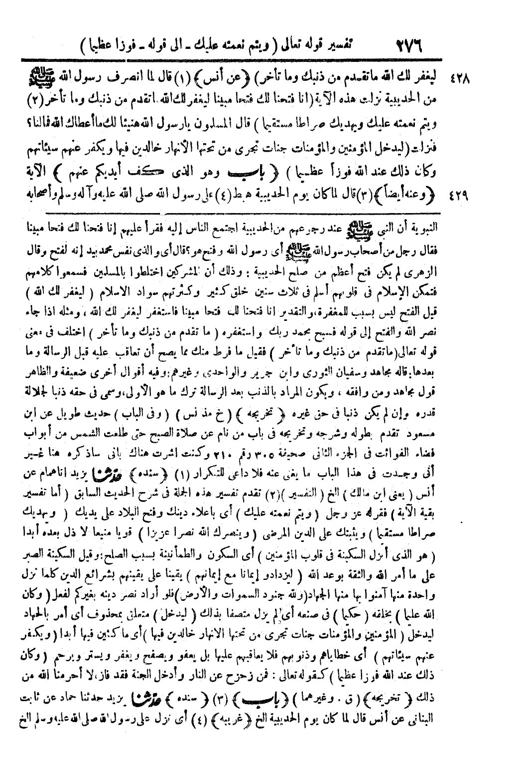 النبوية أن النبي صلى الله عليه وسلم عند رجوعهم من الحديبية اجتمع الناس إليه فقرأ عليهم إنا فتحنا لك فتحًا مبينًا فقال رجل من أصحاب رسول الله صلى الله عليه وسلم أى رسول الله وفتح هو؟ قال أى والذى نفس محمد بيده إنه لفتح وقال الزهرى لم يكن فتح أعظم من صلح الحديبية: وذلك أن المشركين اختلطوا بالمسلمين فسمعوا كلامهم فتمكن الإسلام فى قلوبهم أسلم فى ثلاث سنين خلق كثير وكثرتهم سواد الاسلام {ليغفر لك الله} قيل الفتح ليس بسبب للمغفرة، والتقدير انا فتحنا لك فتحًا مبينًا فاستغفر ليغفر لك الله، ومثله اذا جاء نصر الله إلى قوله فسبح بحمد ربك واستغفره {ما تقدم من ذنبك وما تأخر} اختلف فى معنى قوله تعالى {ما تقدم من ذنبك وما تأخر} فقيل ما فرط منك مما يصح أن تعاقب عليه قبل الرسالة وما بعدها: قاله مجاهد وسفيان الثورى وابن جرير والواحدى وغيرهم: وفيه أقوال أخرى ضعيفة والظاهر قول مجاهد ومن وافقه، ويكون المراد بالذنب بعد الرسالة ترك ما هو الأولى، وسمى فى حقه ذنبًا لجلالة قدره وإن لم يكن ذنبًا فى حق غيره (تخريجه) (خ مذ نس) (وفى الباب) حديث طويل عن ابن مسعود تقدم بطوله وشرحه وتخريجه فى باب من نام عن صلاة الصبح حتى طلعت الشمس من أبواب فضاء الفوائت فى الجزء الثانى صحيفة 305 رقم 210 وكنت اشرت هناك بانى ساذكره هنا غير أنى وجدت فى هذا الباب ما يغنى عنه فلا داعى للتكرار (1) (سنده) حدّثنا يزيد انا همام عن أنس (يعنى ابن مالك) الخ (التفسير) (2) تقدم تفسير هذه الجملة فى شرح الحديث السابق (أما تفسير بقية الآية) فقوله عز وجل {ويتم نعمته عليك} أى باعلاء دينك وفتح البلاد على يديك {ويهديك صراطًا مستقيمًا} ويثبتك على الدين المرضى {وينصرك الله نصرًا عزيزًا} قويًا منيعًا لا ذل بعده أبدًا {هو الذى أنزل السكينة فى قلوب المؤمنين} أى السكون والطمأنينة بسبب الصلح: وقيل السكينة الصبر على ما أمر الله والثقة بوعد الله {ليزدادوا إيمانًا مع إيمانهم} يقينًا على يقينهم بشرائع الدين كلما نزل واحدة منها آمنوا بها منها الجهاد {ولله جنود السموات والأرض} فلو أراد نصر دينه بغيركم لفعل {وكان الله عليمًا} بخلقه (حكيمًا) فى صنعه أى الم يزل متصفًا بذلك (ليدخل) متعلق بمحذوف أى أمر بالجهاد ليدخل {المؤمنين والمؤمنات جنات تجرى من تحتها الأنهار خالدين فيها} أى ماكثين فيها أبدًا {ويكفر عنهم سيئاتهم} أى خطاياهم وذنوبهم فلا يعاقبهم عليها بل يعفو ويصفح ويغفر ويستر ويرحم {وكان ذلك عند الله فوزًا عظيمًا} كقوله تعالى: {فمن زحزح عن النار وأدخل الجنة فقد فاز}، لا أحرمنا الله من ذلك (تخريجه) (ق. وغيرهما) (باب) (3) (سنده) حدّثنا يزيد حدثنا حماد عن ثابت البنانى عن أنس قال لما كان يوم الحديبية الخ (غريبه) (4) أى نزل على رسول الله صلى الله عليه وسلم الخ