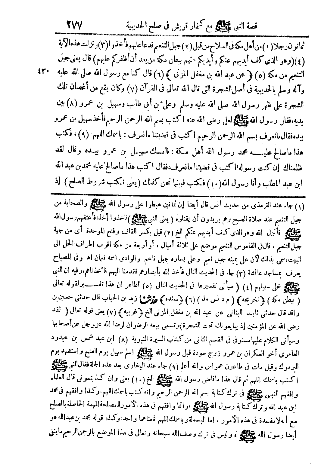 (1) جاء عند الترمذي من حديث أنس قال أيضًا إن ثمانين هبطوا على رسول الله صلى الله عليه وسلم والصحابة من جبل التنعيم عند صلاة الصبح وهم يريدون أن يقتلوه (يعنى النبى صلى الله عليه وسلم) فأخذوا أخذًا فأعتقهم رسول الله صلى الله عليه وسلم فأنزل الله وهو الذى كف أيديهم عنكم الخ (2) قيل بكسر القاف وفتح الموحدة أى من جهة جبل التنعيم، قال فى القاموس التنعيم موضع على ثلاثة أميال، أو أربعة من مكة اقرب اطراف الحلل الى البيت، سمى بذلك لأن على يمينه جبل نعيم وعلى يساره جبل ناعم والوادى اسمه نعمان اهـ وفى المصباح يعرف بمساجد عائشة (3) جاء فى الحديث التالى فأخذ الله بأبصارهم فقدمنا اليهم فأخذناهم، وفيه ان النبى صلى الله عليه وسلم خلى سبيلهم (4) (سيأتى تفسيرها فى الحديث التالى (5) الظاهر ان هذا تفسير لقوله تعالى {ببطن مكة} (تخريجه) (م د نس مذ) (6) (سنده) حدّثنا زيد بن الحباب قال حدثنى حسين بن واقد قال حدثنى ثابت البنانى عن عبد الله بن مغفل المزنى الخ (غريبه) (7) يعنى قوله تعالى {لقد رضى الله عن المؤمنين إذ يبايعونك تحت الشجرة} وتسمى بيعة الرضوان لرضا الله عز وجل عن أصحابها وسيأتى الكلام عليها مستوفى فى القسم الثانى من كتاب السيرة النبوية (8) ابن عبد شمس بن عبدود العامرى أخو السكران بن عمرو زوج سودة قبل رسول الله صلى الله عليه وسلم اسلم سهيل يوم الفتح واستشهد يوم اليرموك وقيل مات فى طاعون عمواس والله أعلم (9) جاء عند البخارى بعد هذه الجملة فقال النبى صلى الله عليه وسلم اكتب باسمك اللهم ثم قال هذا ما فاضى رسول الله صلى الله عليه وسلم الخ (10) يعنى وان كذبتمونى قال العلماء وافقهم النبى صلى الله عليه وسلم فى ترك كتابة بسم الله الرحمن الرحيم وانه كتب باسمك اللهم، وكذا وافقهم فى محمد ابن عبد الله وترك كتابة رسول الله صلى الله عليه وسلم، وانما وافقهم فى هذه الأمور للمصلحة المهمة الحاصلة بالصلح مع أنه لا مفسدة فى هذه الأمور، اما البسملة باسمك اللهم فمعناها واحد: وكذا قوله محمد ابن عبد الله هو أيضًا رسول الله صلى الله عليه وسلم، وليس فى ترك وصف الله سبحانه وتعالى فى هذا الموضع بالرحمن الرحيم ما ينفي