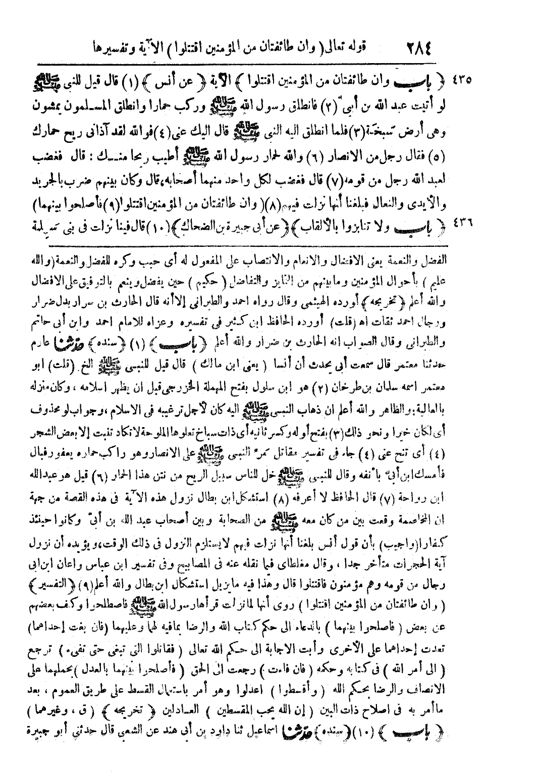 الفضل والنعمة يعني XXX والانعام والانتصاب على المفعول له أى حبب وكره للفضل والنعمة (والله عليم) بأحوال المؤمنين وما بينهم من التمايز والتفاضل (حكيم) حين يفضل وينعم بالتوفيق على الافضال والله أعلم (تخريجه) أورد الهيثمة وقال رواه احمد والطبرانى إلا أنه قال الحارث بن سرار بدل ضرار ورجال احمد ثقات اهـ (قلت) أورده الحافظ ابن كثير فى تفسيره وعزاه للامام احمد وابن أبى حاتم والطبرانى وقال الصواب انه الحارث بن ضرار والله أعلم (باب) (1) (سنده) حدّثنا عارم حدثنا معتمر قال سمعت أبى يحدث أن أنسًا (يعنى ابن مالك) قال قيل للنبى صلى الله عليه وسلم الخ (قلت) ابو معتمر اسمه سلمان بن طرخان (2) هو ابن سلول بفتح المهلمة الخزرجى قبل ان يظهر اسلامه، وكان منزله باعالية: والظاهر والله أعلم ان ذهاب النبى صلى الله عليه وسلم اليه كان لأجل ترغيبه فى الاسلام، وجواب لو محذوف أى لكان خيرًا ونحو ذلك (3) بفتح أوله وكسر ثانيىه أى ذات سباخ تعلوها الملوحة لا تكاد تنبت إلا بعض الشجر (4) أى تنح عنى (5) جاء فى تفسير مقاتل XXX النبى صلى الله عليه وسلم على الانصار وهو راكب حماره يعفور فبال فأمسك ابن أبى بأنفه وقال للنبى صلى الله عليه وسلم خل للناس سبيل الريح من نتن هذا الجمار (6) قيل هو عبد الله ابن رواحة (7) قال الحافظ لا أعرفه (8) استشكل ابن بطال نزول هذه الآية فى هذه القصة من جهة ان المخاصمة وقعت بين من كان معه صلى الله عليه وسلم من الصحابة وبين أصحاب عبد الله بن أبىّ وكانوا حينئذ كفارًا (واجيب) بأن قول أنس بلغنا أنها نزلت فيهم لا يستلزم النزول فى ذلك الوقت، يؤيده أن نزول آية الحجرات متأخر جدًا، وقال مغلطاى فيما نقله عنه فى المصابيح وفى تفسير ابن عباس واعان ابن ابى رجال من قومه وهم مؤمنون فاقتتلوا قال وهذا فيه ما يزيل استشكال ابن بطال والله أعلم (9) (التفسير) {وان طائفتان من المؤمنين اقتتلوا} روى أنها لما نزلت قرأها رسول الله صلى الله عليه وسلم فاصطلحوا وكف بعضهم عن بعض (فاصلحوا بينهما) بالدعاء الى حكم كتاب الله والرضا بما فيه لهما وعليهما {فان بغت إحداهما} تعدت إحداهما على الأخرى وأبت الاجابة الى حكم الله تعالى {فقاتلوا التى تبغى حتى تفئ} ترجع (الى أمر الله) فى كتابه وحكمه (فان فاءت) رجعت الى الحق {فأصلحوا بينهما بالعدل} بحملهما على الانصاف والرضا بحكم الله (وأقسطوا) اعدلوا وهو أمر باستعمال القسط على طريق العموم، بعد ما أمر به فى اصلاح ذات البين {إن الله يحب المقسطين} العادلين (تخريجه) (ق، وغيرهما) (باب) (10) (سنده) حدّثنا اسماعيل ثنا داود بن أبى هند عن الشعبى قال حدثنى أبو جبيرة