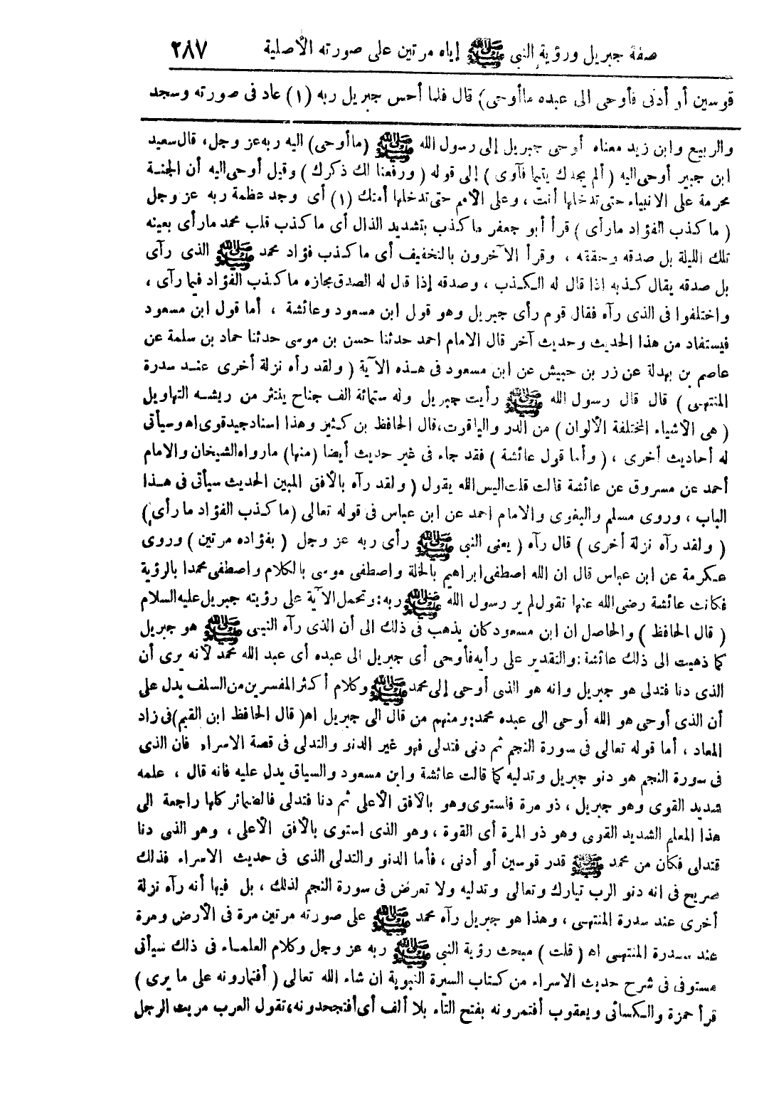 والربيع وابن زيد معناه أوحى جبريل إلى رسول الله صلى الله عليه وسلم (ما أوحى) إليه ربه عز وجل، قال سعيد بن جبير أوحى إليه (الم يجدك يتيمًا فآوى) إلى قوله (ورفعنا لك ذكرك) وقيل أوحى إليه أن الجنة محرمة على الأنبياء حتى تدخلها أنت، وعلى الأمم حتى تدخلها أمتك (1) أي وجد عظمة ربه عز وجل (ما كذب الفؤاد ما رأى) قرأ أبو جعفر ما كذب بتشديد الذال أي ما كذب قلب م حمد ما رأى بعينه تلك الليلة بل صدقه وحققه، وقرأ الآخرون بالتخفيف أي ما كذب فؤاد محمد صلى الله عليه وسلم الذي رأى بل صدقه يقال كذبه إذا قال له الكذب، وصدقه إذا قال له الصدق ومجازه ما كذب الفؤاد فيما رأى، واختلفوا في الذي رآه فقال قوم رأى جبريل وهو قول ابن مسعود وعائشة، أما قول ابن مسعود فيستفاد من هذا الحديث وحديث آخر قال الإمام أحمد حدثنا حسن بن موسى حدثنا حماد بن سلمة عن عاصم بن بهدلة عن زر بن حبيش عن ابن مسعود في هذه الآية (ولقد رآه نزلة أخرى عند سدرة المنتهى) قال قال رسول الله صلى الله عليه وسلم رأيت جبريل وله ستمائة ألف جناح ينتثر من ريشه التهاويل (وهي الأشياء المختلفة الألوان) من الدر والياقوت، قال الحافظ بن كثير وهذا إسناد جيد قوي اهـ وسيأتي له أحاديث أخرى، 0 وأما قول عائشة) فقد جاء في غير حديث أيضًا (منها) ما رواه الشيخان والإمام أحمد عن مسروق عن عائشة قالت قلت أليس الله يقول (ولقد رآه بالأفق المبين الحديث سيأتي في هذا الباب، وروى مسلم والبغوي والإمام أحمد عن ابن عباس في قوله تعالى (ما كذب الفؤاد ما رأى) (ولقد رآه نزلة أخرى) قال رآه (يعني النبي صلى الله عليه وسلم رأى ربه عز وجل (بفؤاده مرتين) وروى عكرمة عن ابن عباس قال إن الله اصطفى إبراهيم بالخلة واصطفى موسى بالكلام واصطفى محمدًا بالرؤية فكانت عائشة رضي الله عنها تقول لم ير رسول الله صلى الله عليه وسلم ربه: وتحمل الآية على رؤيته جبريل عليه السلام (قال الحافظ) والحاصل أن ابن مسعود كان يذهب في ذلك إلى أن الذي رآه النبي صلى الله عليه وسلم هو جبريل كما ذهبت إلى ذلك عائشة: والتقدير على رأيه فأوحى أي جبريل إلى عبده أي عبد الله محمد لأنه يرى أن الذي دنا فتدلى هو جبريل وأنه هو الذي أوحى إلى محمد صلى الله عليه وسلم وكلام أكثر المفسرين من السلف يدل على أن الذي أوحى هو الله أوحى إلى عبده محمد: ومنهم من قال إلى جبريل (قال الحافظ ابن القيم) في زاد المعاد، أما قوله تعالى في سورة النجم ثم دنى فتدلى فهو غير الدنو والتدلي في قصة الإسراء فأن الذي في سورة النجم هو دنو جبريل وتدليه كما قالت عائشة وابن مسعود والسياق يدل عليه فإنه قال، علمه شديد القوى وهو جبريل، ذو مرة فاستوى وهو بالأفق الأعلى ثم دنا فتدلى فالضمائر كلها راجعة إلى هذا المعلم الشديد القوى وهو ذو المرة أي القوة، وهو الذي استوى بالأفق الأعلى، وهو الذي دنا فتدلى فكان من محمد صلى الله عليه وسلم قدر قوسين أو أدنى، فأما الدنو والتدلي الذي في حديث الإسراء فذلك صريح في أنه دنو الرب تبارك وتعالى وتدليه ولا تعرض في سورة النجم لذلك، بل فيها أنه رآه نزلة أخرى عند سدرة المنتهى، وهذا هو جبريل رآه محمد صلى الله عليه وسلم على صورته مرتين مرة في الأرض ومرة عند سدرة المنتهى اهـ (قلت) مبحث رؤية النبي صلى الله عليه وسلم ربه عز وجل وكلام العلماء في ذلك سيأتي مستوفى في شرح حديث الإسراء من كتاب السيرة النبوية إن شاء الله تعالى (أفتمارونه على ما يرى) قرأ حمزة والكسائي ويعقوب أفتمرونه بفتح التاء بلا ألف أي أتجحدونه، تقول العرب مريت الرجل