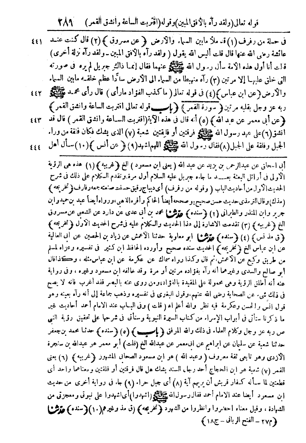 في حلة من رفرف (1) قد ملأ ما بين السماء والأرض (عن مسروق) (2) قال كنت عند عائشة رضي الله عنها قال قلت أليس الله يقول (ولقد رآه بالأفق المبين - ولقد رآه نزلة أخرى) قالت أنا أول هذه الأمة سأل رسول الله صلى الله عليه وسلم عنهما فقال إنما ذاك جبريل لم يره في صورته التي خلق عليها إلا مرتين (3) رآه منهطبًا من السماء إلى الأرض سادَّا عظم خلقه ما بين السماء والأرض (عن ابن عباس) (4) في قوله تعالى (ما كذب الفؤاد ما رأى) قال رأى محمد صلى الله عليه وسلم ربه عز وجل بقلبه مرتين (سورة القمر) (باب قوله تعالى اقتربت الساعة وانشق القمر) (عن أبي معمر عن عبد الله) (5) أنه قال في هذه الآية (اقتربت الساعة وانشق القمر) قال قد انشق (6) على عهد رسول الله صلى الله عليه وسلم فرقتين أو فِلقين شعبة (7) الذي يشك فكان فلقة من وراء الجبل وفلقة على الجبل (8) فقال رسول الله صلى الله عليه وسلم اللهم اشهد (9) (عن أنس) (10) سأل أهل