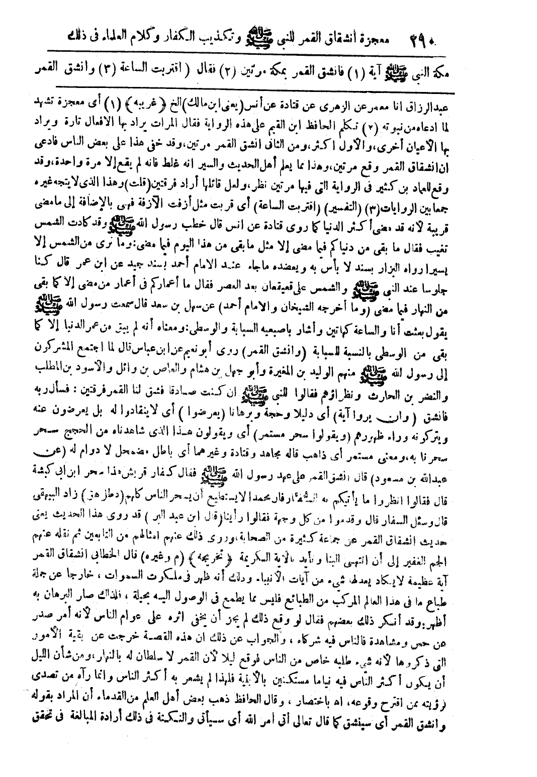 عبد الرزاق أنا معمر عن الزهري عن قتادة عن أنس (يعني ابن مالك) الخ (غريبه) (1) أي معجزة تشهد لما ادعاه من نبوته (2) تكلم الحافظ ابن القيم على هذه الرواية فقال المرات يراد بها الأفعال تارة ويراد بها الأعيان أخرى، والأول أكثر، ومن الثاني انشق القمر مرتين، وقد خفي هذا على بعض الناس فادعى أن انشقاق القمر وقع مرتين، وهذا مما يعلم اهل الحديث والسير أنه غلط فإنه لم يقع إلا مرة واحدة، وقد وقع للعماد بن كثير في الرواية التي فيها مرتين نظر، ولعل قائلها أراد فرقتين (قلت) وهذا الذي لا يتجه غيره جمعًا بين الروايات (3) (التفسير) (اقتربت الساعة) أي قربت مثل أزفت الآزفة فهي بالإضافة إلى ما مضى قريبه لأنه قد مضى أكثر الدنيا كما روي قتادة عن أنس قال خطب رسول الله صلى الله عليه وسلم وقد كادت الشمس تغيب فقال ما بقي من دنياكم فيما مضى إلا مثل ما بقي من هذا اليوم فيما مضى: وما نرى من الشمس إلا يسيرًا رواه البزار بسند لا بأس به ويعضده ما جاء عند الإمام أحمد بسند جيد عن ابن عمر قال كنا جلوسًا عند النبي صلى الله عليه وسلم والشمس على قعيقعان بعد العصر فقال ما أعماركم في أعمار من مضى إلا كما بقي من النهار فيما مضى (وما أخرجه الشيخان والإمام أحمد) عن سهل بن سعد قال سمعت رسول الله صلى الله عليه وسلم يقول بشت أنا والساعة كهاتين وأشار بأصبعيه السبابة والوسطى: ومعناه أنه لم يبق من عمر الدنيا إلا كما بقي من الوسطى بالنسبة للسبابة (وانشق القمر) روى أبو نعيم عن ابن عباس قال لما اجتمع المشركون إلى رسول الله صلى الله عليه وسلم منهم الوليد بن المغيرة وأبو جهل بن هشام والعاص بن وائل والأسود بن المطلب والنضر بن الحارث ونظراؤهم فقالوا للنبي صلى الله عليه وسلم إن كنت صادقًا فشق لنا القمر فرقتين: فسأل ربه فانشق (وإن يروا آية) أي دليلًا وحجة وبرهانًا (يعرضوا) أي لا ينقادوا له بل يعرضون عنه ويتركونه وراء ظهورهم (ويقولوا سحر مستمر) أي ويقولون هذا الذي شاهدناه من الحجج سحر سحرنا به، ومعنى مستمر أي ذاهب قاله مجاهد وقتادة وغيرهما أي باطل مضمحل لا دوام له (عن عبد الله بن مسعود) قال انشق القمر على عهد رسول الله صلى الله عليه وسلم فقال كفار قريس هذا سحر ابن أبي كبشة قال فقالوا انظروا ما يأتيكم به السُّفار فإن محمدًا لا يستطيع أن يسحر الناس كلهم (دطل هق) زاد البيهقي قال وسئل السفار قال وقدموا من كل وجهة فقالوا رأينا (قال ابن عبد البر) قد روى هذا الحديث يعني حديث انشقاق القمر عن جماعة كثيرة من الصحابة، وروى ذلك عنهم أمثالهم من التابعين ثم نقله عنهم الجم الغفير إلى أن انتهى إلينا وتأييد بالآية الكريمة (تخريجه) (م وغيره) قال الخطابي انشقاق القمر آية عظيمة لا يكاد يعدلها شيء من آيات الأنبياء وذلك أنه ظهر في ملكوت السموات، خارجًا عن جملة طباع ما في هذا العالم المركب من الطبائع فليس مما يطمع في الوصول إليه بحيلة، فلذلك صار البرهان به أظهر: وقد أنكر ذلك بعضهم فقال لو وقع ذلك لم يجز أن يخفى أثره على عوام الناس لأنه أمر صدر عن حس ومشاهدة فالناس فيه شركاء، والجواب عن ذلك أن هذه القصة خرجت عن بقية الأمور التي ذكروها لأنه شيء طلبه خاص من الناس فوقع ليلًا لأن القمر لا سلطان له بالنهار، ومن شأن الليل أن يكون أكثر الناس فيه نيامًا مستكنين بالأبنية فلهذا لم يشعر به أكثر الناس وإنما رآه من تصدى لرؤية ممن اقترح وقوعه، اهـ باختصار، وقال الحافظ ذهب بعض أهل العلم من القدماء أن المراد بقوله وانشق القمر أي سينشق كما قال تعالى أتى أمر الله أي سيأتي والنكتة في ذلك إرادة المبالغة في تحقق