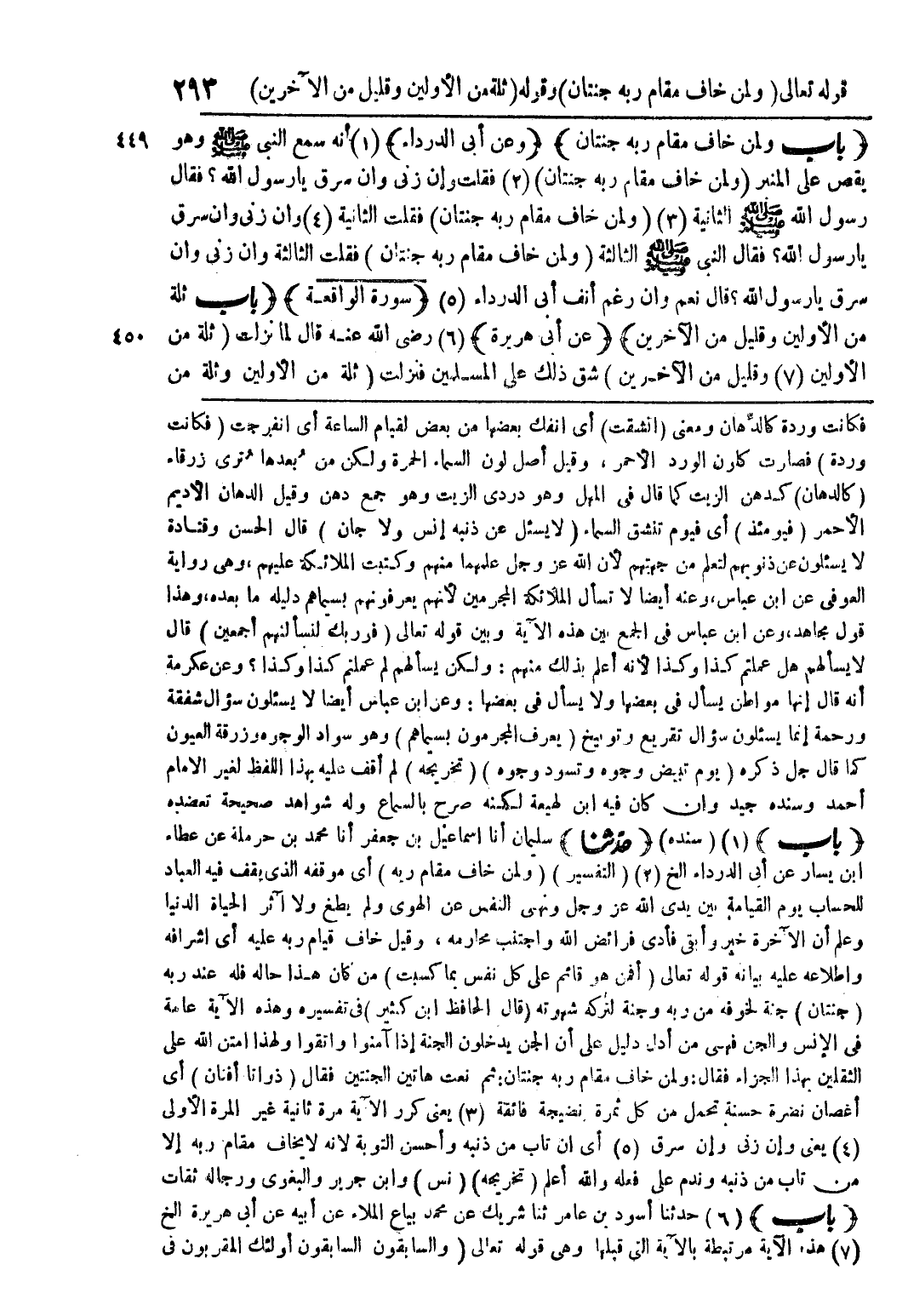 (باب ولمن خاف مقام ربه جنتان) (وعن أبي الدرداء) (1) أنه سمع النبي صلى الله عليه وسلم وهو يقص على المنبر (ولمن خاف مقام ربه جنتان) (2) فقلت وإن زنى وإن سرق يا رسول الله؟ فقال رسول الله صلى الله عليه وسلم الثانية (3) (ولمن خاف مقام ربه جنتان) فقلت الثانية (4) وإن زنى وإن سرق يا رسول الله؟ فقال النبي صلى الله عليه وسلم الثالثة (ولمن خاف مقام ربه جنتان) فقلت الثالثة وإن زنى وإن سرق يا رسول الله؟ قال نعم وإن رغم أنف أبي الدرداء (5) (سورة الواقعة) (باب ثلة من الأولين وقليل من الآخرين) (عن أبي هريرة) (6) رضي الله عنه قال لما نزلت (ثلة من الأولين (7) وقليل من الآخرين) شق ذلك على المسلمين فنزلت (ثلة من الأولين وثلة من