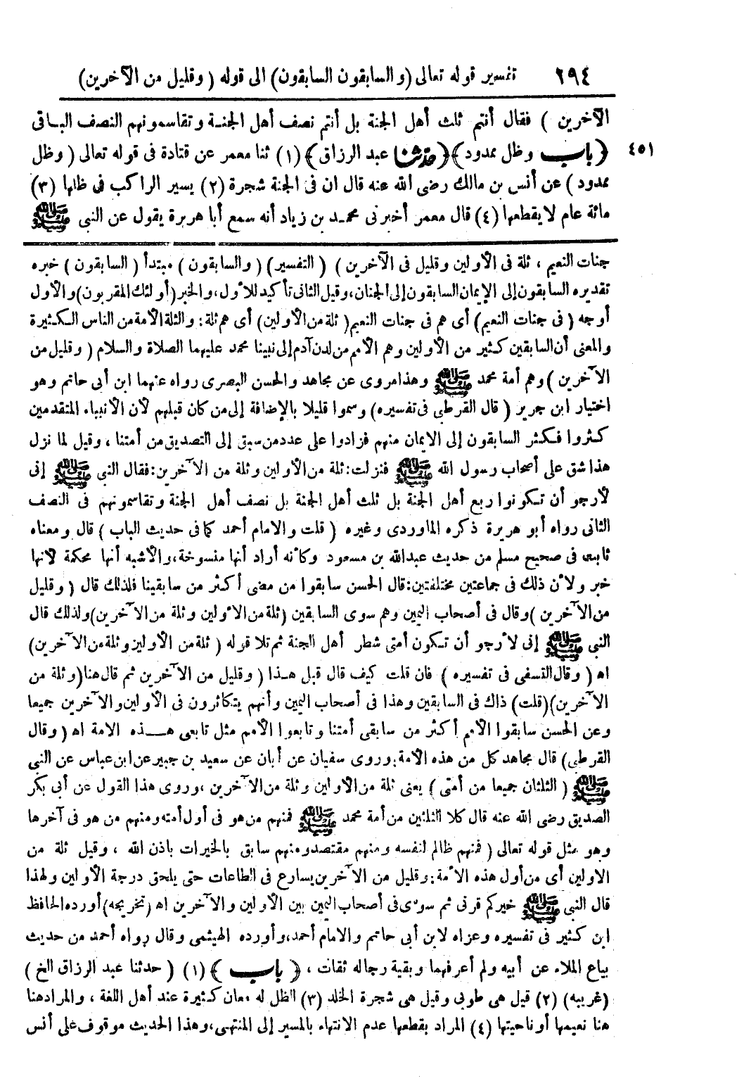 جنات النعيم، ثلة من الأولين وقليل من الآخرين) (التفسير) (والسابقون) مبتدأ (السابقون) خبره تقديره السابقون إلى الإيمان السابقون إلى الجنان، وقيل الثاني تأكيد للأول، والخبر (أولئك المقربون) والأول أوجه (في جنات النعيم) أي هم في جنات النعيم (ثلة من الأولين) أي هم ثلة: والثلة الأمة من الناس الكثيرة والمعنى أن السابقين كثير من الأولين وهم الأمم من لدن آدم إلى نبينا محمد عليهما الصلاة والسلام (وقليل من الآخرين) وهم أمة محمد صلى الله عليه وسلم وهذا مروي عن مجاهد والحسن البصري رواله عنهما ابن أبي حاتم وهو اختيار ابن جرير (قال القرطبي في تفسيره) وسموا قليلًا بالإضافة إلى من كان قبلهم لأن الأنبياء المتقدمين كثروا فكثر السابقون إلى الإيمان منهم فزادوا على عدد من سبق إلى التصديق من أمتنا، وقيل لما نزل هذا شق على أصحاب رسول الله صلى الله عليه وسلم فنزلت: ثلة من الأولين وثلة من الآخرين: فقال النبي صلى الله عليه وسلم إني لأرجو أن ت كونوا ربع أهل الجنة بل ثلث أهل الجنة بل نصف أهل الجنة وتقاسمونهم في النصف الثاني رواه أبو هريرة ذكره الماوردي وغيره (قلت والإمام أحمد كما في حديث الباب) قال ومعناه ثابت في صحيح مسلم من حديث عبد الله بن مسعود وكأنه أراد أنها منسوخة، والأشبه أنها محكمة لأنها خبر ولأن ذلك في جماعتين مختلفتين: قال الحسن سابقوا من مضى أكثر من سابقينا فلذلك قال (وقليل من الآخرين) وقال في أصحاب اليمين وهم سوى السابقين (ثلة من الأولين وثلة من الآخرين) ولذلك قال النبي صلى الله عليه وسلم إني لأرجو أن تكون أمتي شطر أهل الجنة ثم تلا قوله (ثلة من الأولين وثلة من الآخرين) اهـ (وقال النسفي في تفسيره) فإن قلت كيف قال قبل هذا (وقليل من الآخرين ثم قال هنا (وثلة من الآخرين) (قلت) ذاك في السابقين وهذا في أصحاب اليمين وأنهم يتكاثرون في الأولين والآخرين جميعًا وعن الحسن سابقوا الأمم أكثر من سابقي أمتنا وتابعوا الأمم مثل تابعي هذه الأمة اهـ (وقال القرطبي) قال مجاهد كل من هذه الأمة: وروى سفيان عن أبان عن سعيد بن جبير عن ابن عباس عن النبي صلى الله عليه وسلم (الثلثان جميعًا من أمتي) يعني ثلة من الأولين وثلة من الآخرين، وروى هذا القول عن أبي بكر الصديق رضي الله عنه قال كلا الثلثين من أمة محمد صلى الله عليه وسلم فمنهم من هو في أول أمته ومنهم من هو في آخرها وهو مثل قوله تعالى (فمنهم ظالم لنفسه ومنهم مقتصد ومنهم سابق بالخيرات بإذن الله، وقيل ثلة من الأولين أي من أول هذه الأمة: وقليل من الآخرين يسارع في الطاعات حتى يلحق درجة الأولين ولهذا قال النبي صلى الله عليه وسلم خيركم قرني ثم سوّى في أصحاب اليمين بين الأولين والآخرين اهـ (تخريجه) أورده الحافظ ابن كثير في تفسيره وعزاه لابن أبي حاتم والإمام أحمد، وأورده الهيثمي وقال رواه أحمد من حديث بياع الملاء عن أبيه ولم أعرفها وبقية رجاله ثقات، (باب) (1) (حدثنا عبد الرزاق الخ) (غريبه) (2) قيل هي طوبى وقيل هي شجرة الخلد (3) الظل له معان كثيرة عند أهل اللغة، والمراد هنا نعيمها أو ناحيتها (4) المراد بقطعها عدم الانتهاء بالمسير إلى المنتهى، وهذا الحديث موقوف على أنس