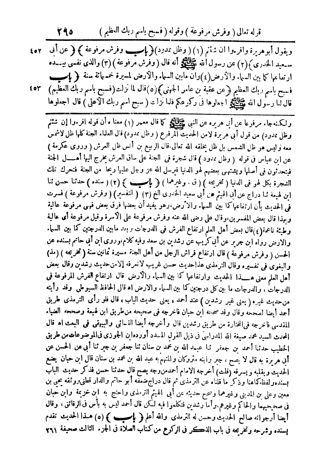 ويقول أبو هريرة واقرأوا إن شئتم (1) (وظل ممدود) (باب وفرش مرفوعة) (عن أبي سعيد الخدري) (2) عن رسول الله صلى الله عليه وسلم أنه قال (وفرش مرفوعة) (3) والذي نفسي بيده ارتفاعها كما بين السماء والأرض (4) وإن ما بين السماء والأرض لمسيرة خمسمائة سنة (باب) فسبح باسم ربك العظيم (عن عقبة بن عامر الجهني) (5) قال لما نزلت (فسبح باسم ربك العظيم) قال لنا رسول الله صلى الله عليه وسلم اجعلوها في ركوعكم فلما نزلت (سبح اسم ربك الأعلى) قال اجعلوها