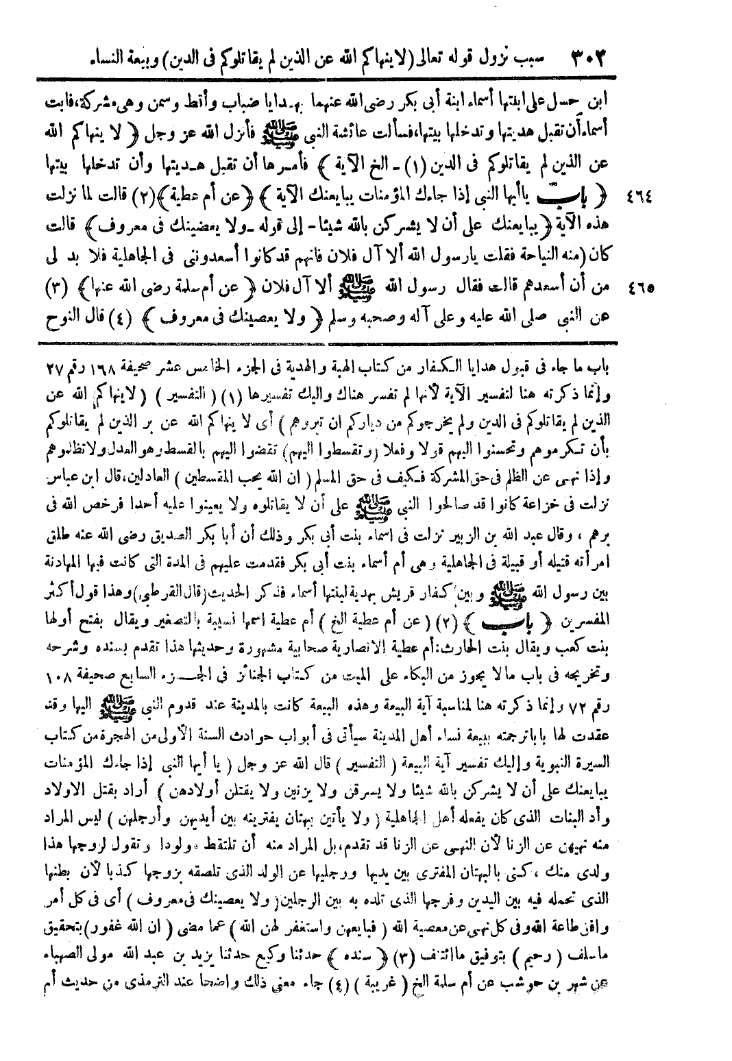 ابن حسل على ابنتها أسماء ابنة أبي بكر رضي الله عنهما بهدايا ضباب وأقط وسمن وهي مشركة، فأبت أن تقبل هديتها وتدخلها بيتها، فسألت عائشة النبي صلى الله عليه وسلم فأنزل الله عز وجل (لا ينهاكم الله عن الذين لم يقاتلوكم في الدين (1) - الخ الآية) فأمرها أن تقبل هديتها وأن تدخلها بيتها (باب يا أيها النبي إذا جاءك المؤمنات يبايعنك الآية) (عن أم عطية) (2) قالت لما نزلت هذه الآية (يبايعنك على أن لا يشركن بالله شيئًا - إلى قوله - ولا يعصينك في معروف) قالت كان (منه النياحة فقلت يا رسول الله ألا آل فلان فإنهم قد كانوا أسعدونني في الجاهلية فلا بد لي من أن أسعدهم قالت فقال رسول الله صلى الله عليه وسلم الا آل فلان (عن أم سلمة رضي الله عنها) (3) عن النبي صلى الله عليه وسلم وعلى آله وصحبه وسلم (ولا يعصينك في معروف) (4) قال النوح