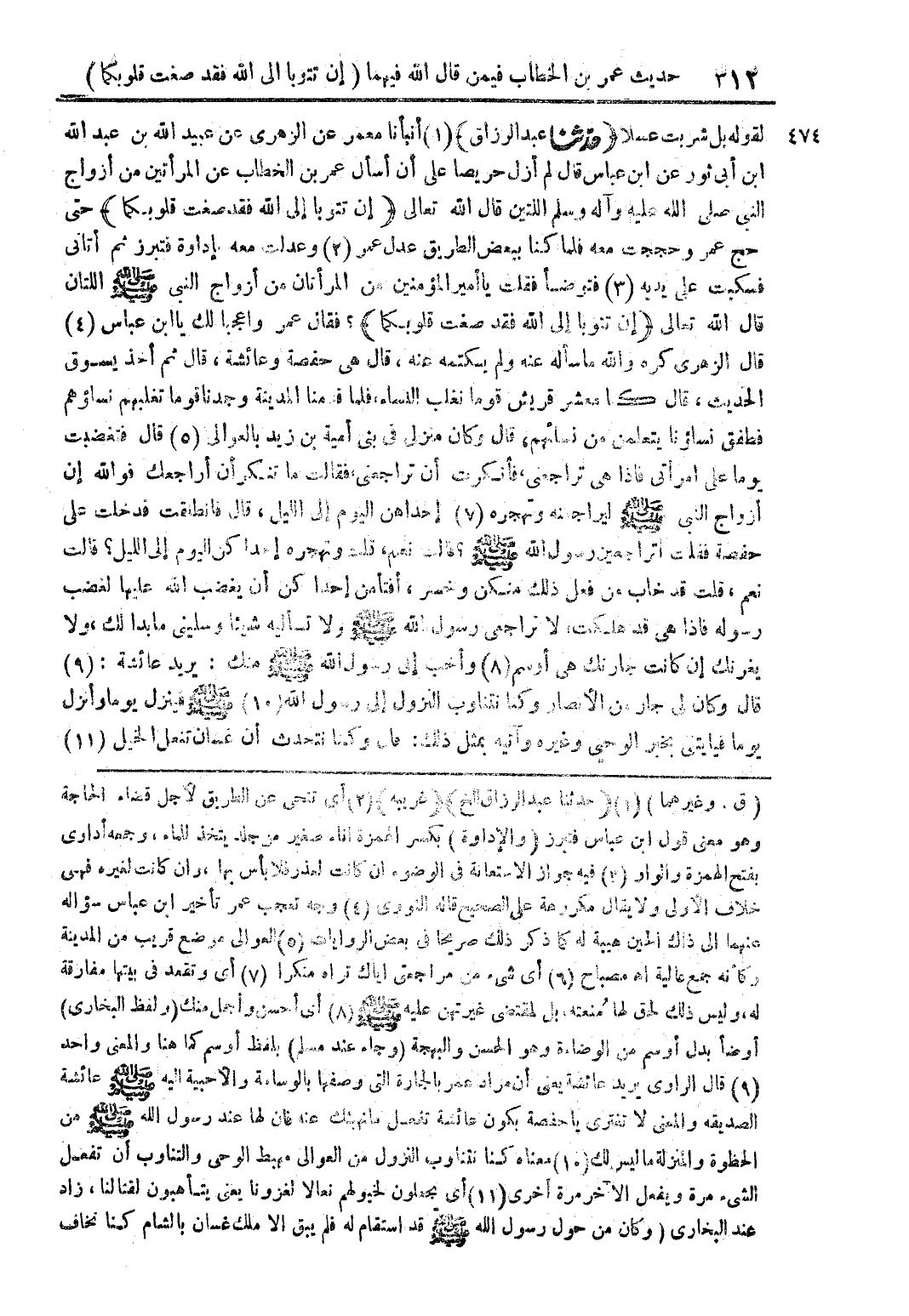 لقوله بل شربت عسلا (حدثنا عبد الرزاق) (1) أنبأنا معمر عن الزهري عن عبيد الله بن عبد الله ابن أبي ثور عن ابن عباس قال لم أزل حريصًا على أن أسأل عمر بن الخطاب عن المرأتين من أزواج النبي صلى الله عليه وآله وسلم اللتين قال الله تعالى (إن تتوبا إلى الله فقد صغت قلوبكما) حتى حج عمر وحججت معه فلما كنا ببعض الطريق عدل عمر (2) وعدلت معه بإداوة فتبرز ثم أتاني فسكبت على يديه (3) فتوضأ فقلت يا أمير المؤمنين عن المرأتان من أزواج النبي صلى الله عليه وسلم اللتان قال الله تعالى (إن تتوبا إلى الله فقد صغت قلوبكما)؟ فقال عمر واعجبا لك يا ابن عباس (4) قال الزهري كره والله ما سأله عنه ولم يكتمه عنه، قال هي حفصة وعائشة، قال ثم أخذ يسوق الحديث، قال كنا معشر قريش قومًا نغلب النساء فلما قدمنا المدينة وجدنا قومًا تغلبهم نساؤهم فطفق نساؤنا يتعلمن من نسائهم، قال وكان منزلي في بني أمية بن زيد بالعوالي (5) قال فتغضبت يومًا على امرأتي فإذا هي تراجعني، فأنكرت أن تراجعني، فقالت ما تنكر أن أراجعك فوالله إن أزواج النبي صلى الله عليه وسلم ليراجعنه وتهجره (7) إحداهن اليوم إلى الليل، قال فانطلقت فدخلت على حفصة فقلت أتراجعين رسول الله صلى الله عليه وسلم؟ قالت نعم، قلت وتهجره إحداكن اليوم إلى الليل؟ قالت نعم، قلت قد خاب من فعل ذلك منكن وخسر، أفتأمن إحداكن أن يغضب الله عليها لغضب رسوله فإذا هي قد هلكت، لا تراجعي رسول الله صلى الله عليه وسلم ولا تسأليه شيئًا وسليني ما بدا لك، ولا يغرنك إن كانت جارتك هي أوسم (8) وأحب إلى رسول الله صلى الله عليه وسلم منك: يريد عائشة: (9) قال وكان لي جار من الأنصار وكنا نتناوب النزول إلى رسول الله (10) صلى الله عليه وسلم ينزل يومًا وأنزل يومًا فيأتيني بخبر الوحي وغيره وآنية بمثل ذلك: قال وكنا نتحدث أن غسان تنعل الخيل (11)