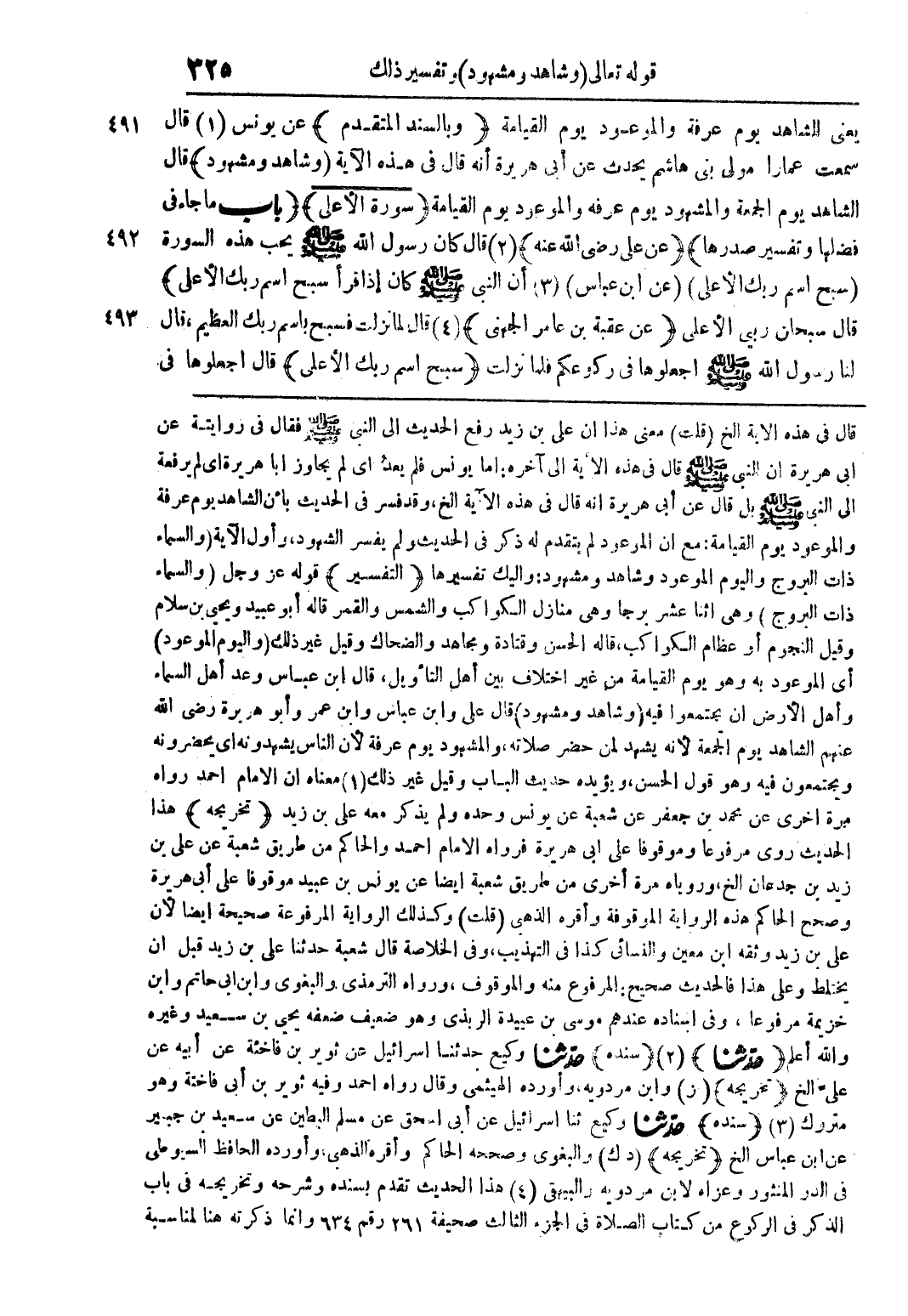يعني الشاهد يوم عرفة والموعود يوم القيامة (وبالسند المتقدم) عن يونس (1) قال سمعت عمارًا مولى بني هاشم يحدث عن أبي هريرة أنه قال في هذه الآية (وشاهد ومشهود) قال الشاهد يوم الجمعة والمشهود يوم عرفة والموعود يوم القيامة (سورة الأعلى) (باب ما جاء في فضلها وتفسير صدرها) (عن على رضى الله عنه) (2) قال كان رسول الله صلى الله عليه وسلم يحب هذه السورة (سبح اسم ربك الأعلى) (عن ابن عباس) (3) أن النبي صلى الله عليه وسلم كان إذا قرأ سبح اسم ربك الأعلى) قال سبحان ربي الأعلى (عن عقبة بن عامر الجهني) (4) قال لما نزلت فسبح باسم ربك العظيم، قال لنا رسول الله صلى الله عليه وسلم اجعلوها في ركوعكم فما نزلت (سبح اسم ربك الأعلى) قال اجعلوها في