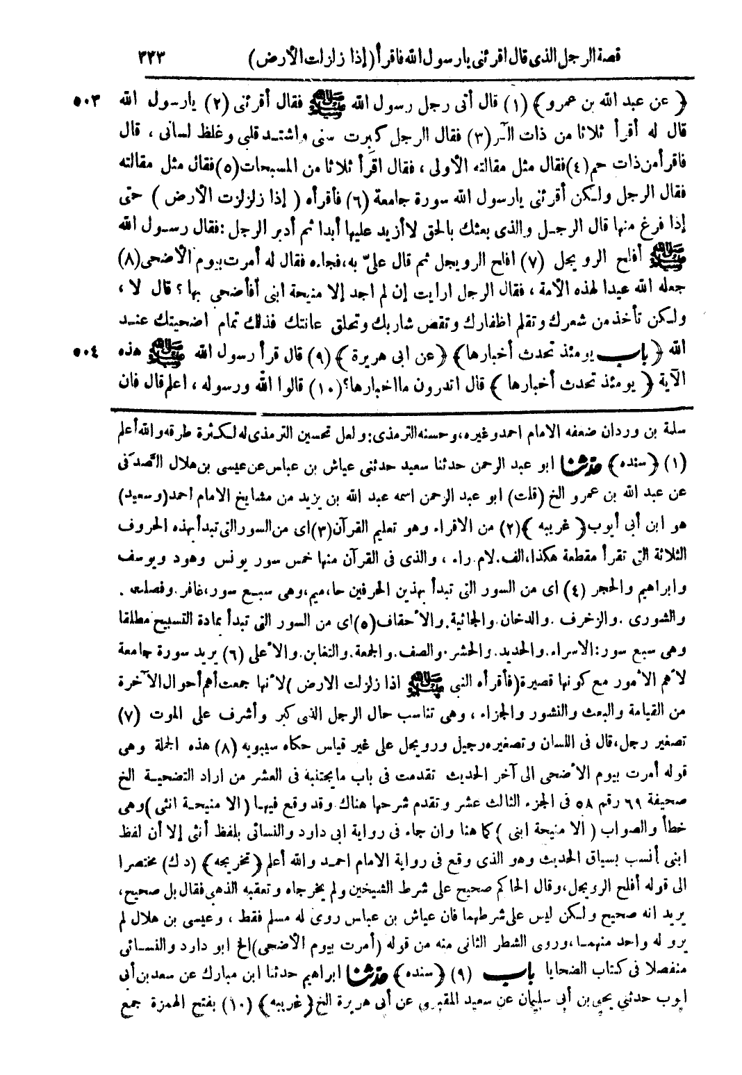 (عن عبد الله بن عمرو) (1) قال أتى رجل رسول الله صلى الله عليه وسلم فقال أقرئني (2) يا رسول الله قال له اقرأ ثلاثًا من ذات الر (3) فقال الرجل كبرت سني واشتد قلبي وغلظ لساني، قال فاقرأ من ذات حم (4) فقال مثل مقالته الأولى، فقال اقرأ ثلاثًا من المسبحات (5) فقال مثل مقالته فقال الرجل ولكن اقرئني يا رسول الله سورة جامعة (6) فاقرأه (إذا زلزلت الارض) حتى إذا فرغ منها قال الرجل والذي بعثك بالحق لا أزيد عليها أبدًا ثم أدبر الرجل: فقال رسول الله صلى الله عليه وسلم أفلح الرويجل (7) أفلح الرويجل ثم قال علىّ به، فجاءه فقال له أمرت بيوم الأضحى (8) جعله الله عيدًا لهذه الأمة، فقال الرجل أرأيت إن لم أجد إلا منيحة ابني أفأضحي بها؟ قال لا، ولكن تأخذ من شعرك وتقلم أظفارك وتقص شاربك وتحلق عانتك فذلك تمام أضحيتك عند الله (باب يومئذ تحدث أخبارها) (عن أبي هريرة) (9) قال قرأ رسول الله صلى الله عليه وسلم هذه الآية (يومئذ تحدث أخبارها) قال أتدرون ما أخبارها؟ (10) قالوا الله ورسوله، أعلم قال فإن
