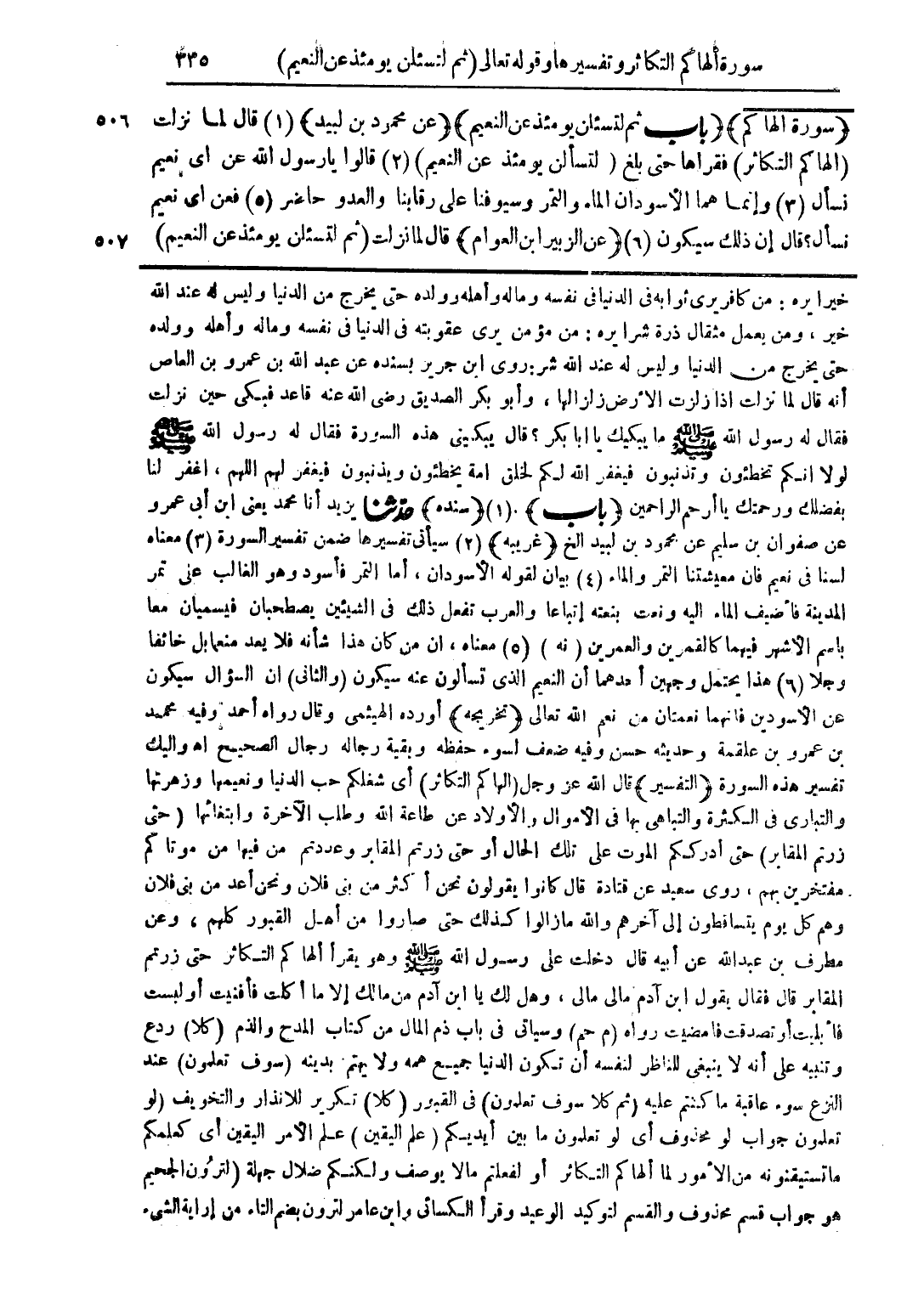 (سورة ألهاكم) (باب ثم لتسئلن يومئذ عن النعيم) (عن محمود بن لبيد) (1) قال لما نزلت (ألهاكم التكاثر) فقرأها حتى بلغ (لتسألن يومئذ عن النعيم) (2) قالوا يا رسول الله عن أي نعيم نسأل (3) وإنما هما الأسودان الماء والتمر وسيوفنا على رقابنا والعدو حاضر (5) فعن أي نعيم نسأل؟ قال إن ذلك سيكون (6) (عن الزبير ابن العوام) قال لما نزلت (ثم لتسئلن يومئذ عن النعيم)